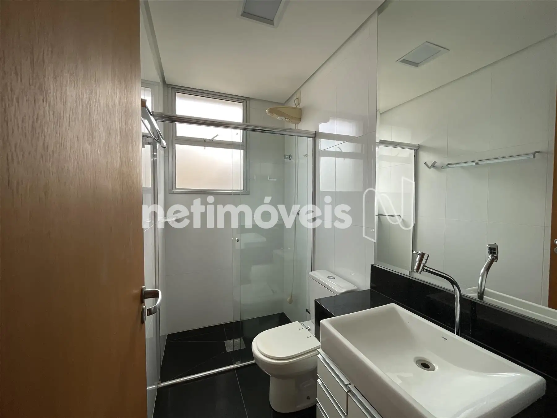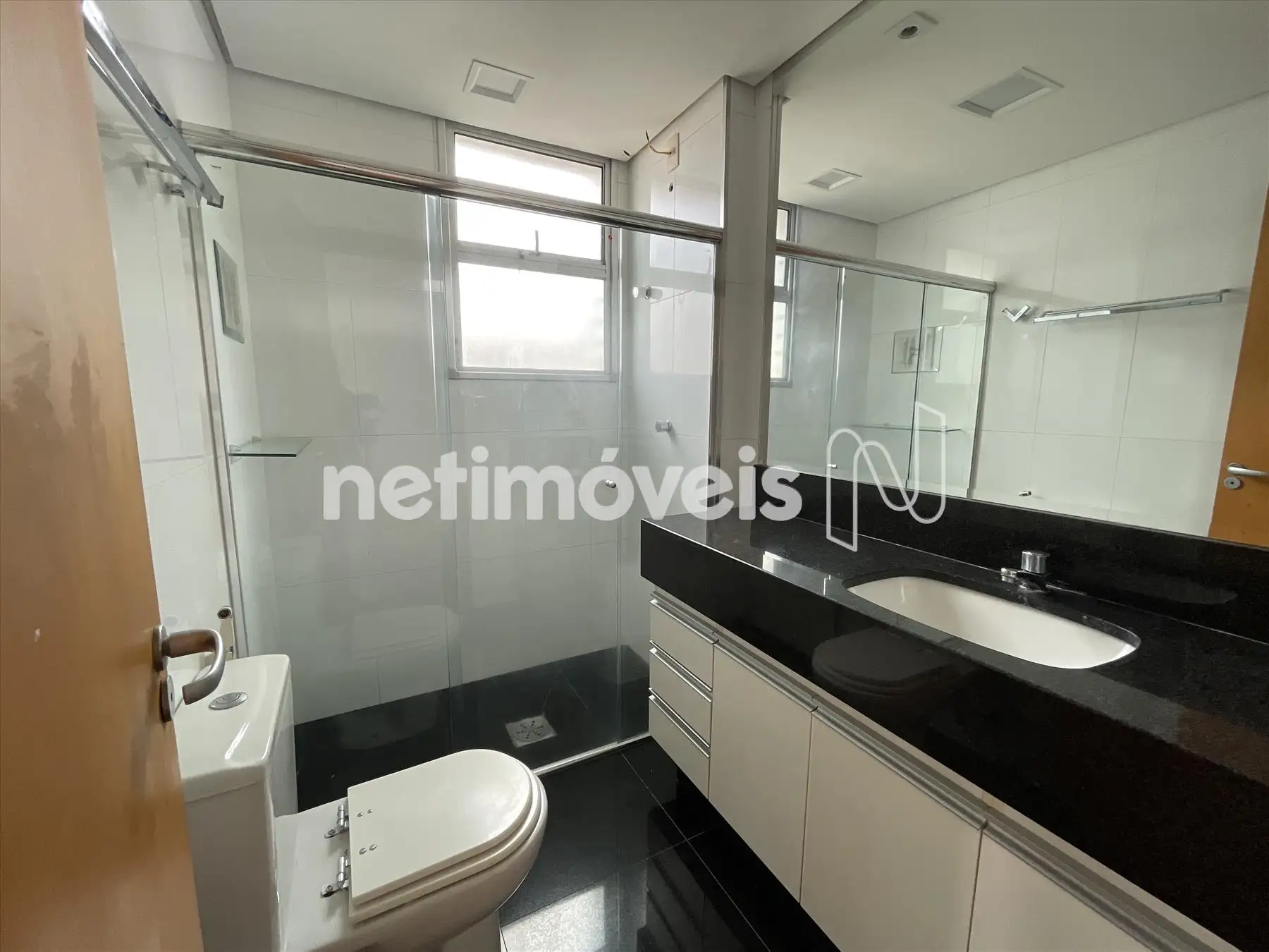 Banho suíte com armários, box blindex, piso e bancada em granito.