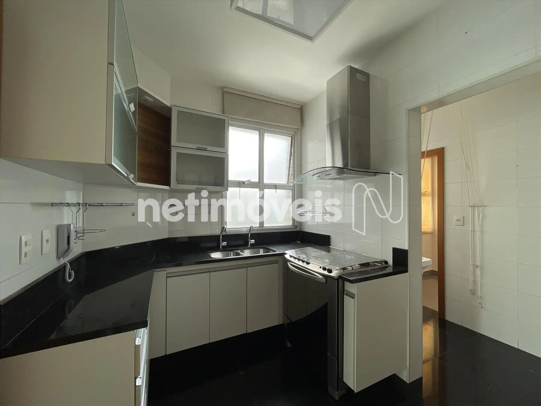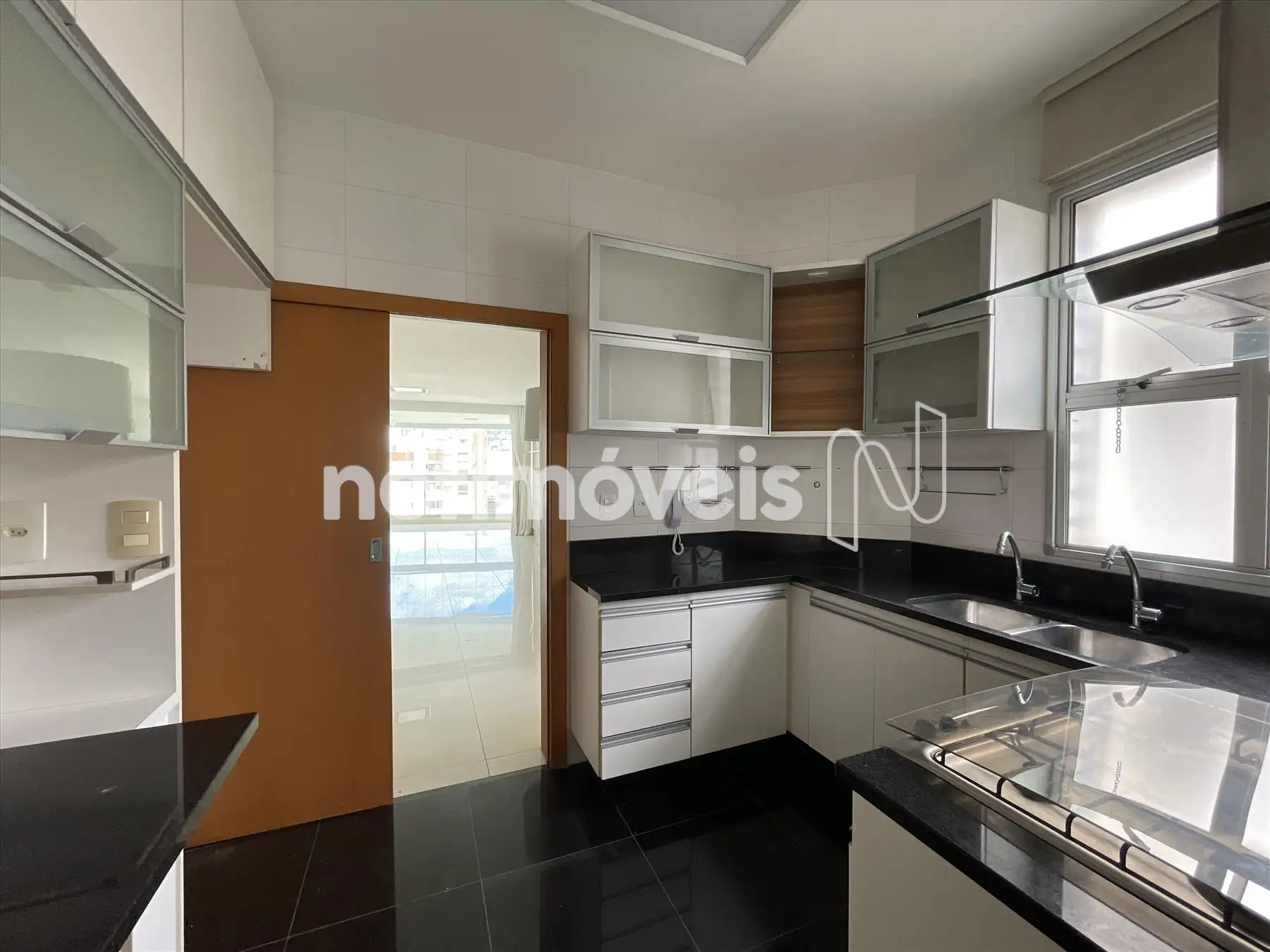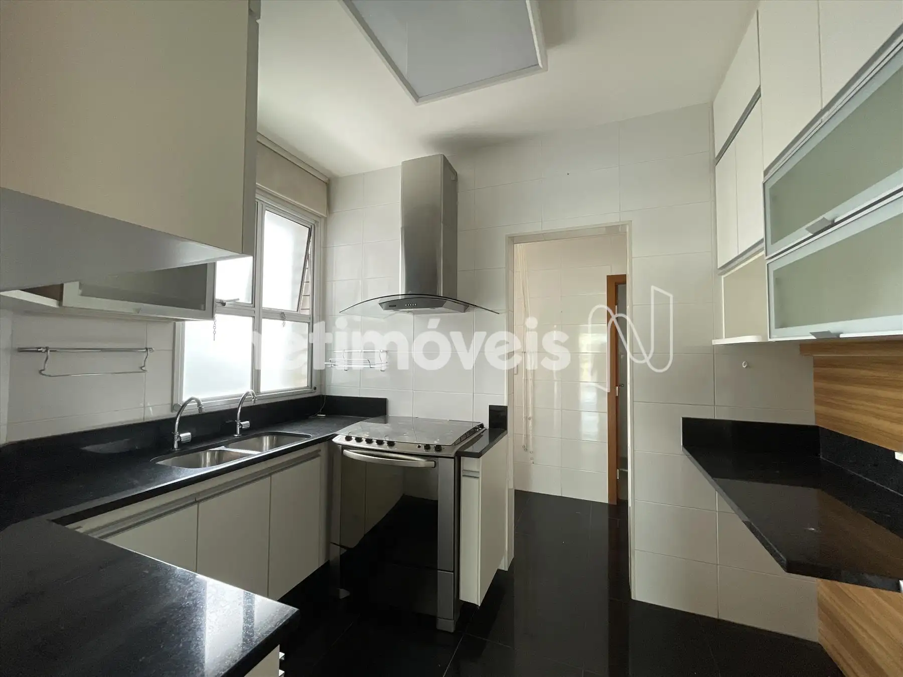 Cozinha com armários, piso e bancada em granito.