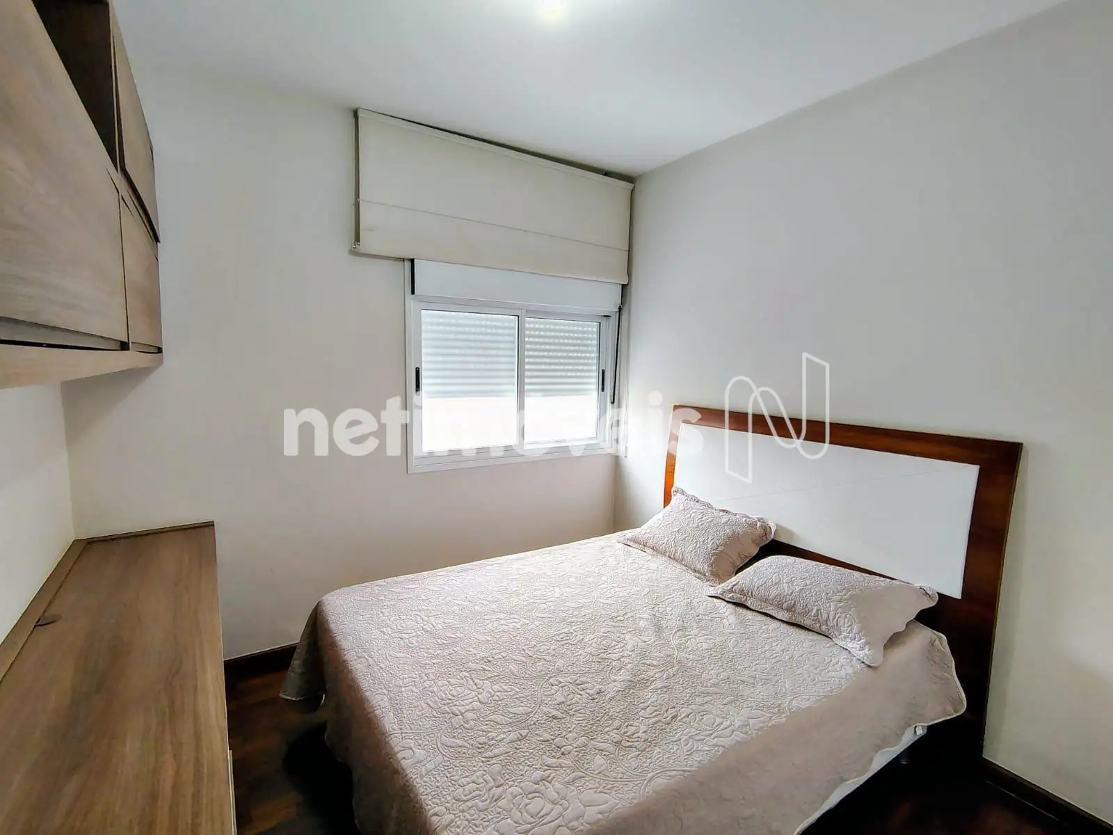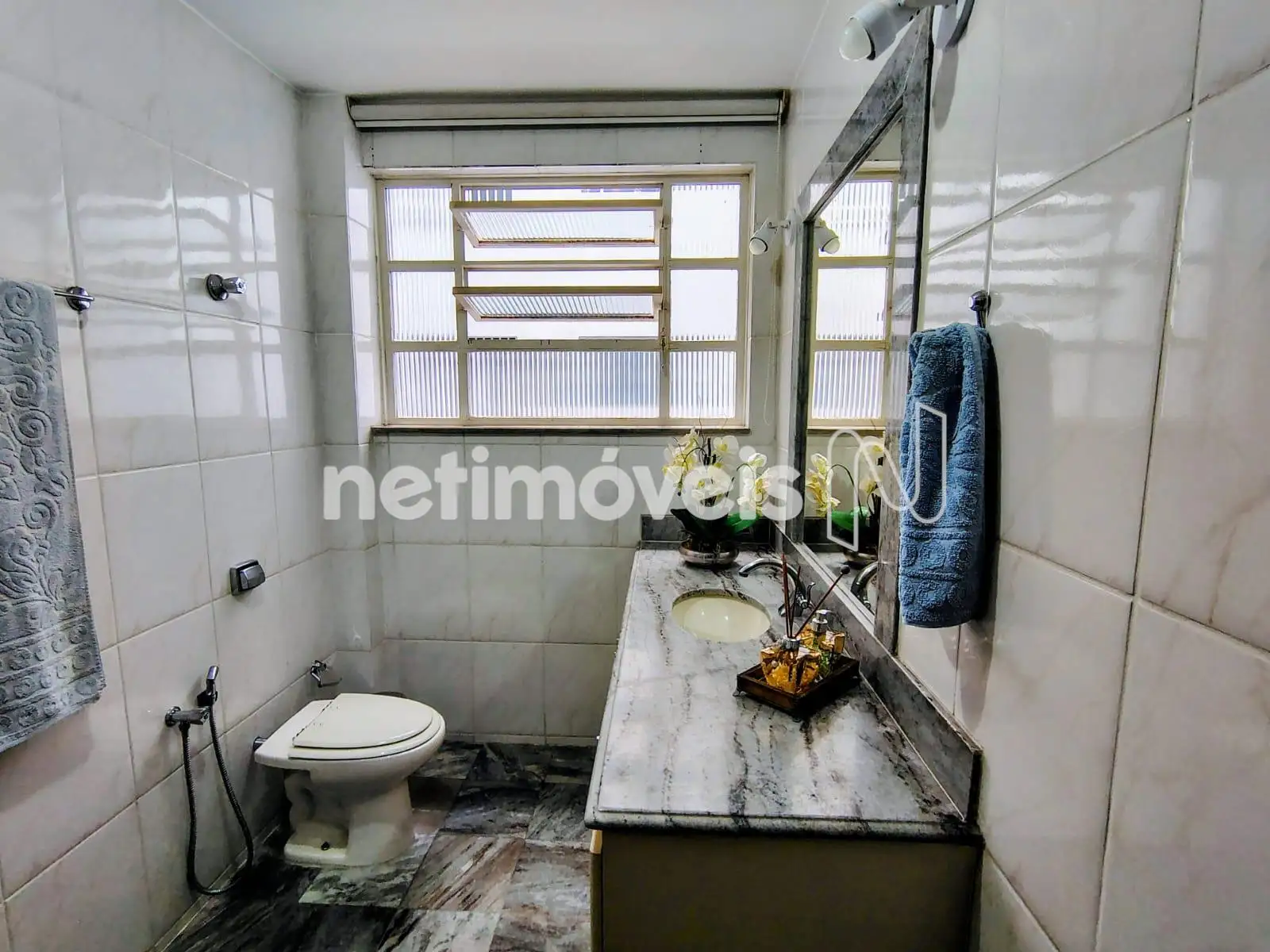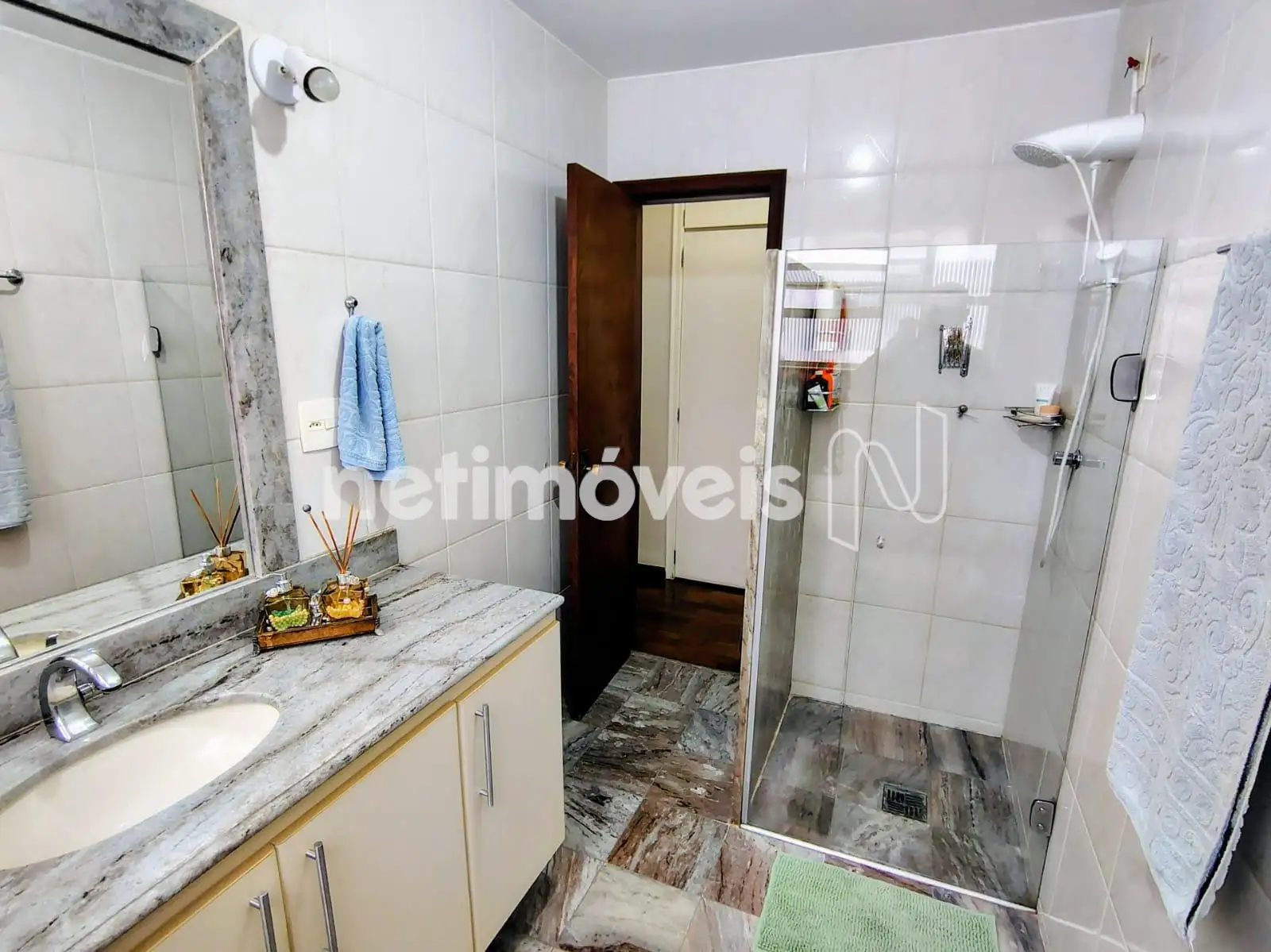 - Banho social amplo com box em vidro temperado e armário;