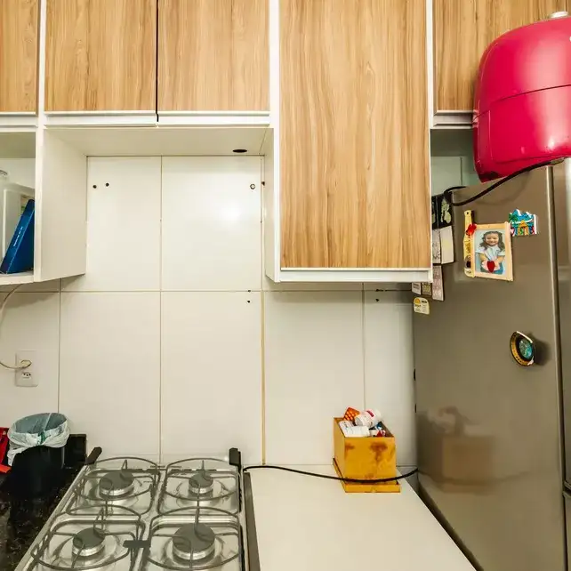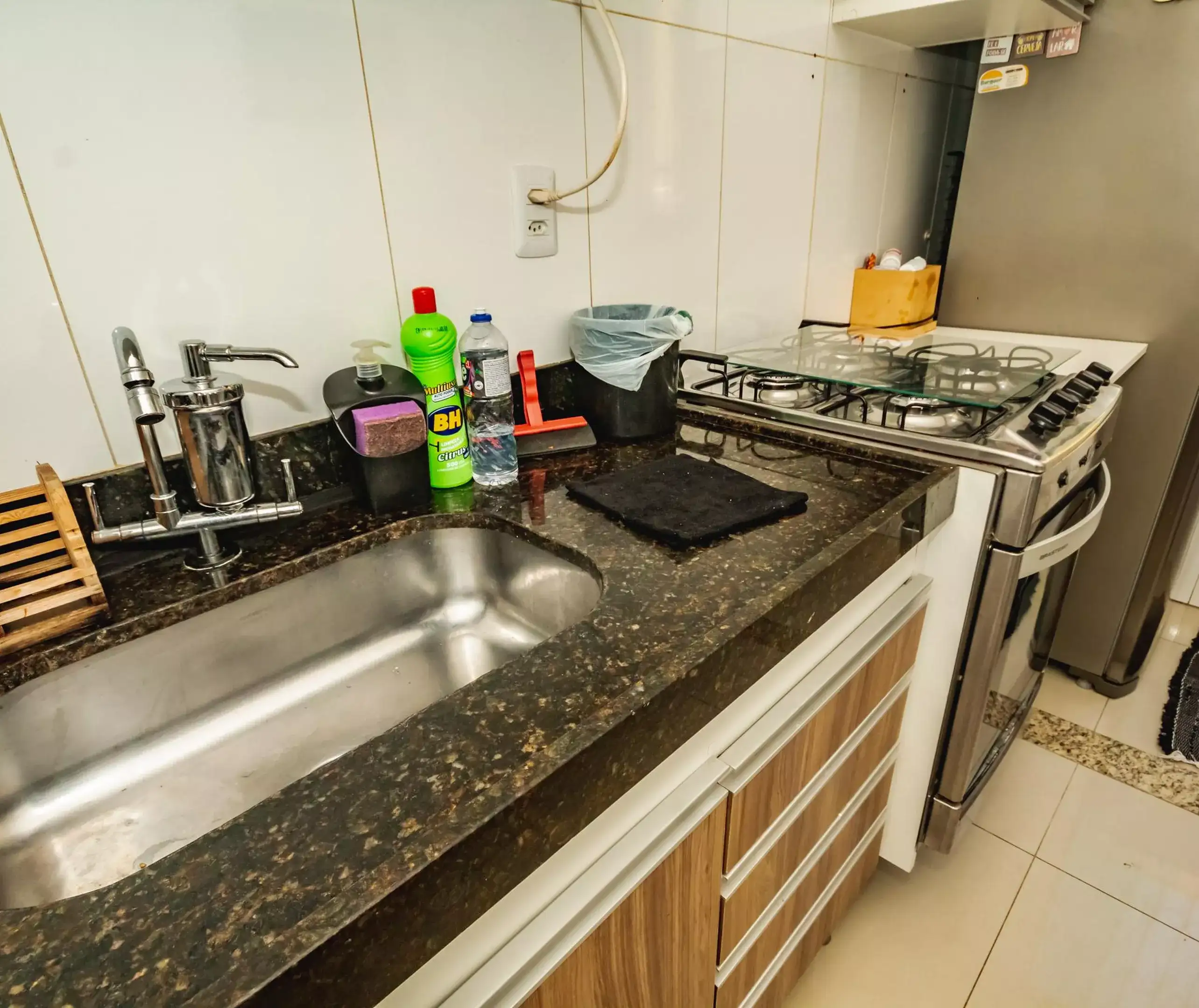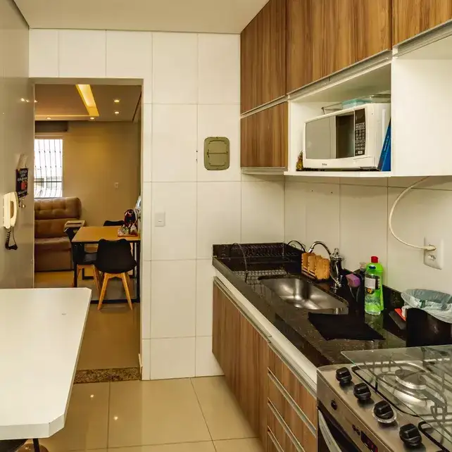 Cozinha: Possui armários embutidos, bancada funcional e boa circulação.