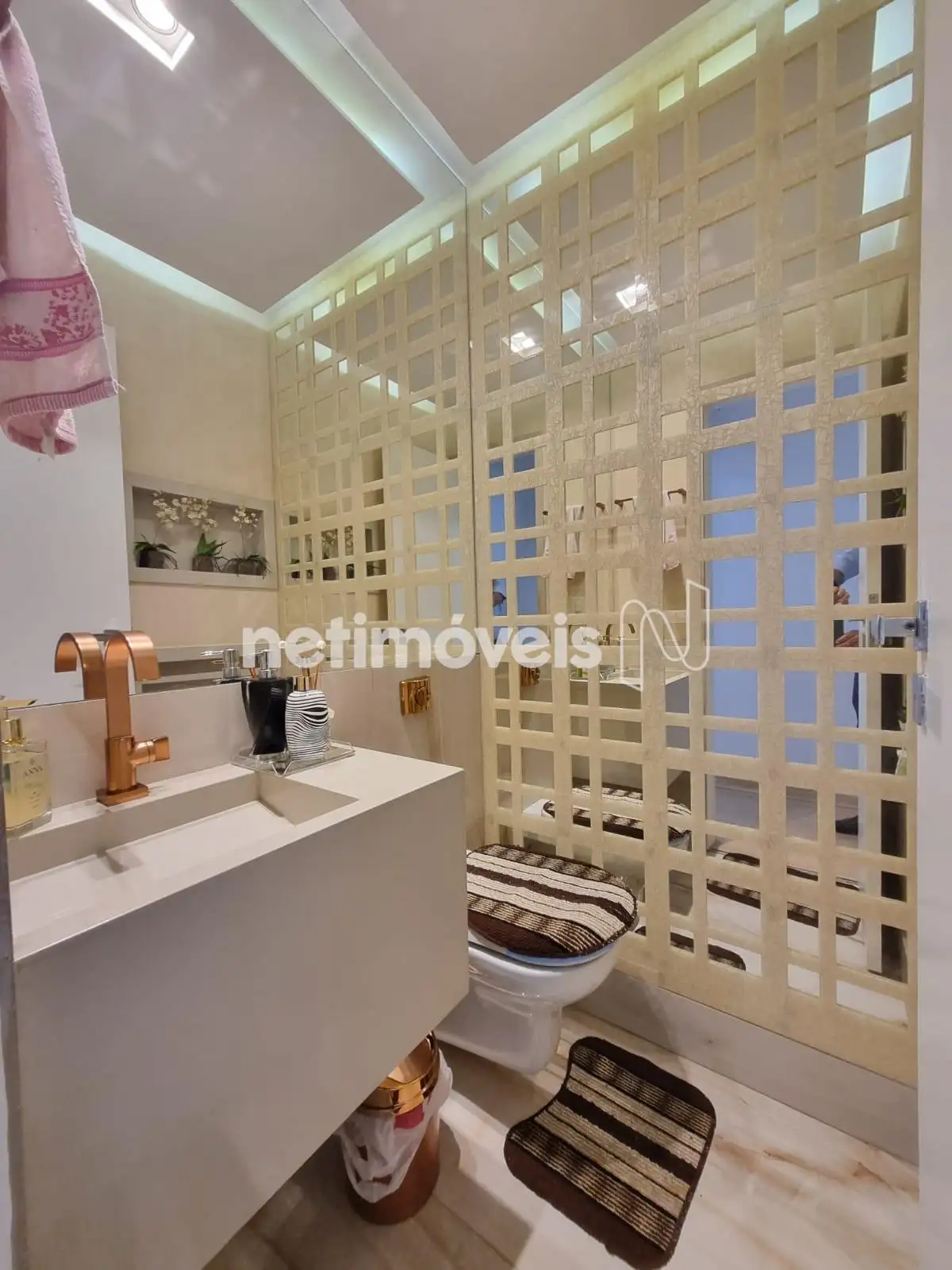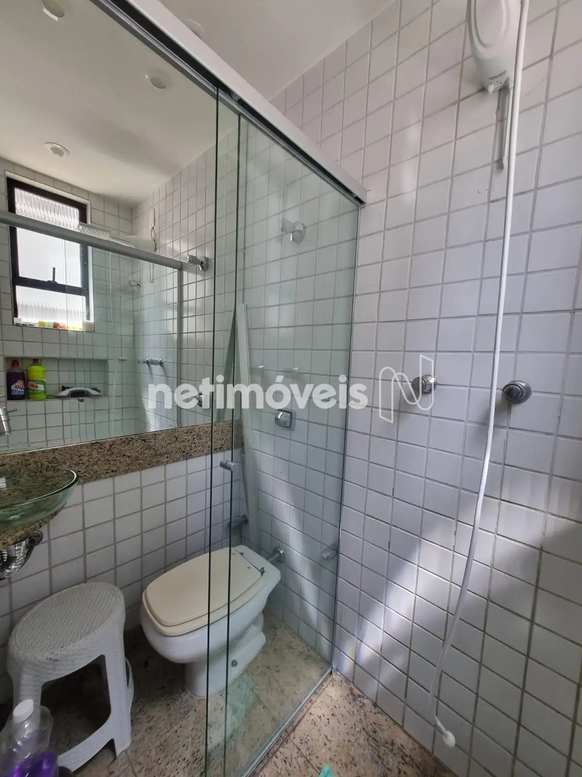 Banho da suíte com armários, box blindex, piso e bancada em granito. O banho social foi dividido em lavabo, possibilitando a criação da 2ª suíte (reversível).