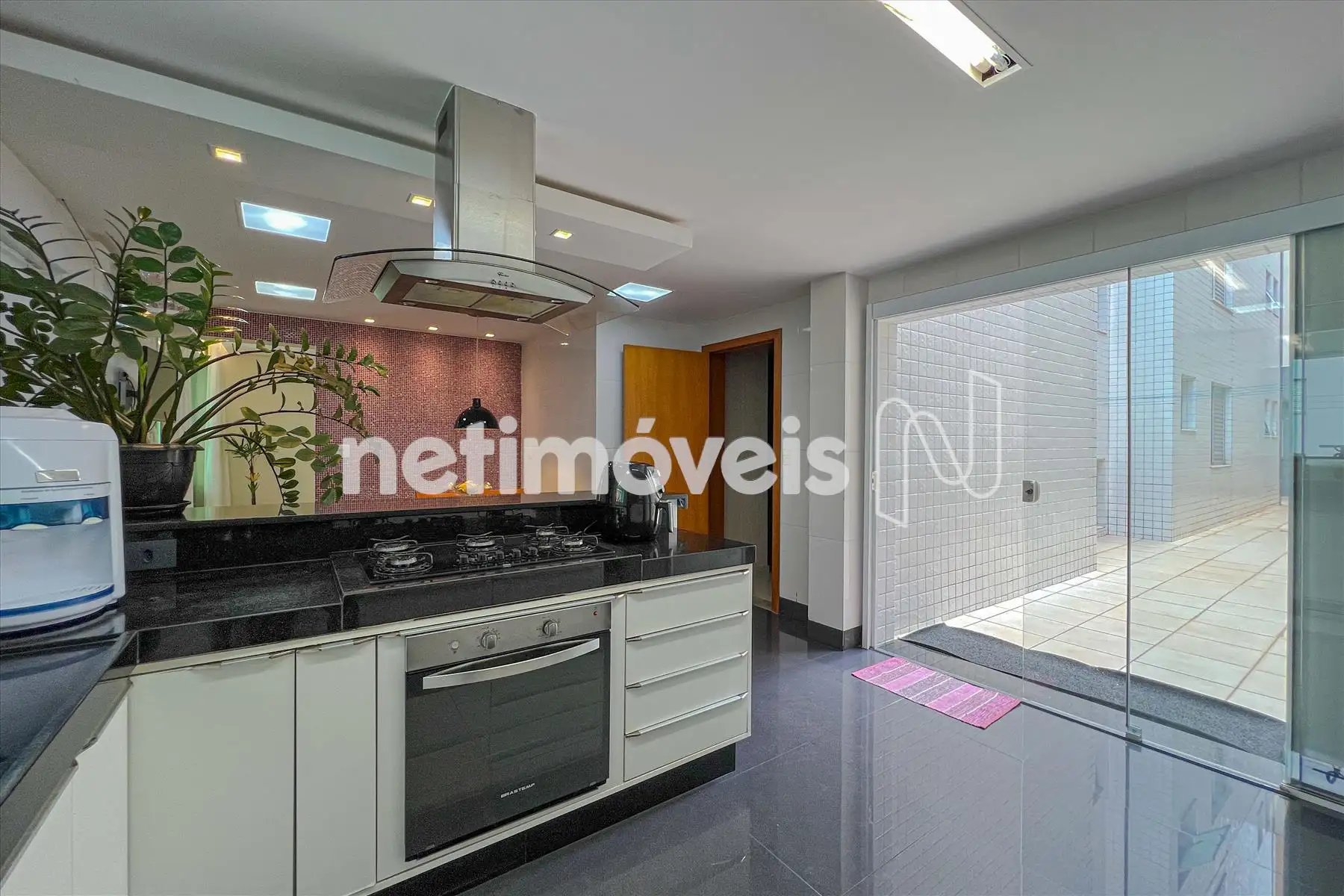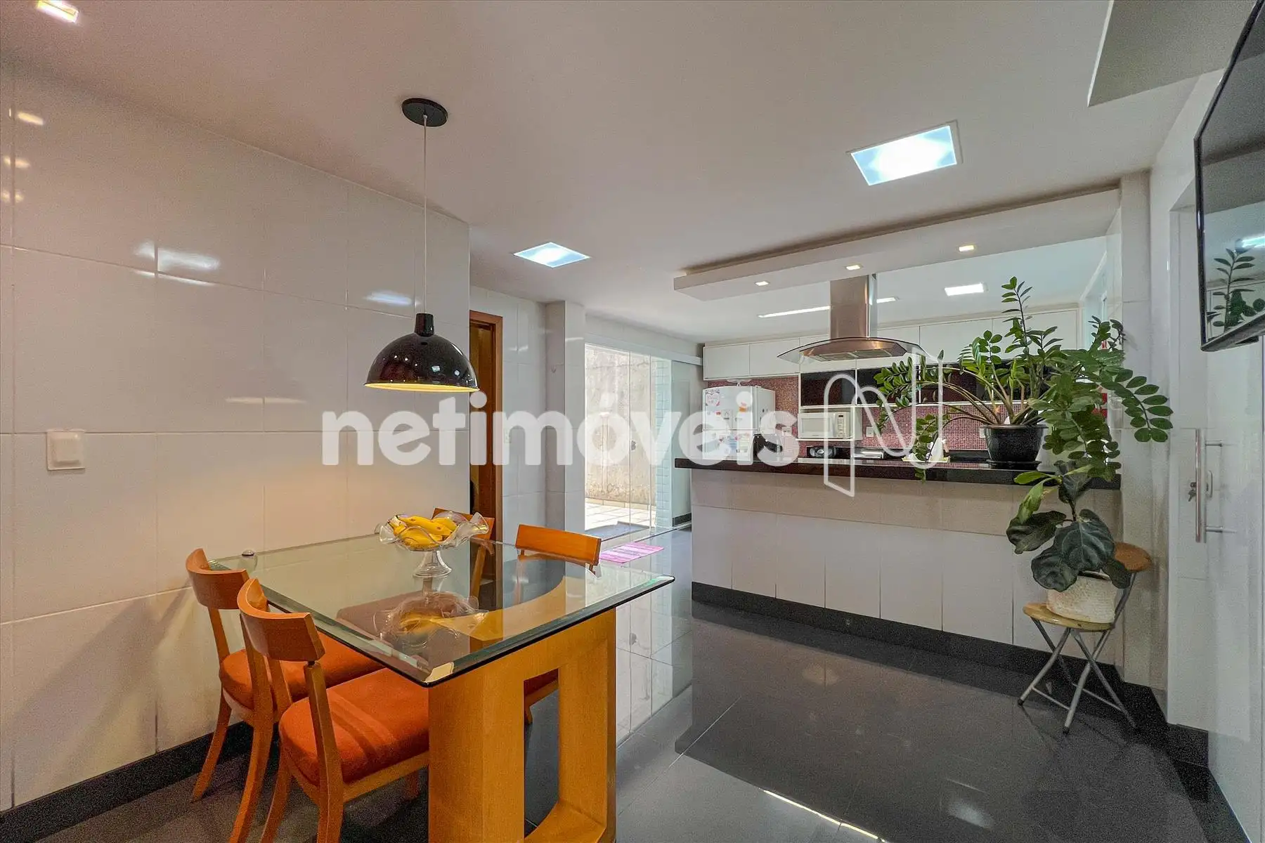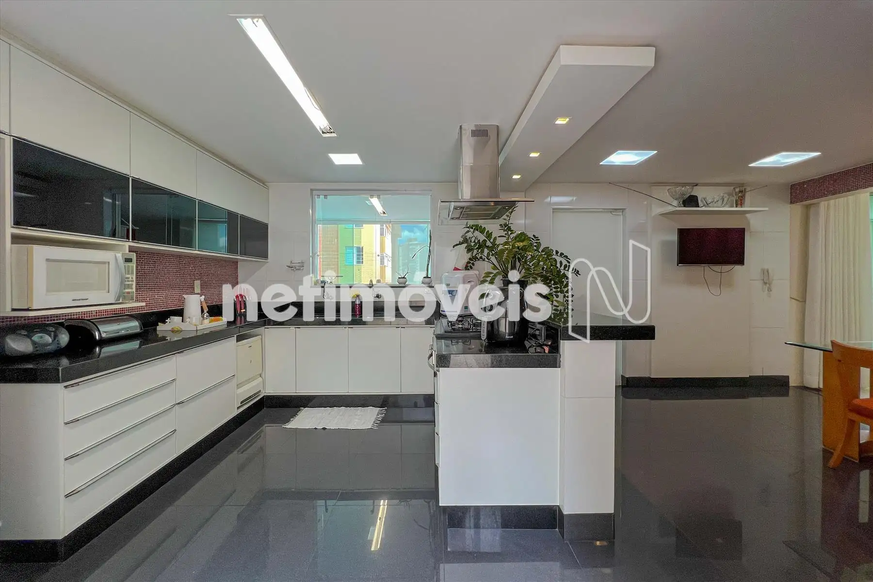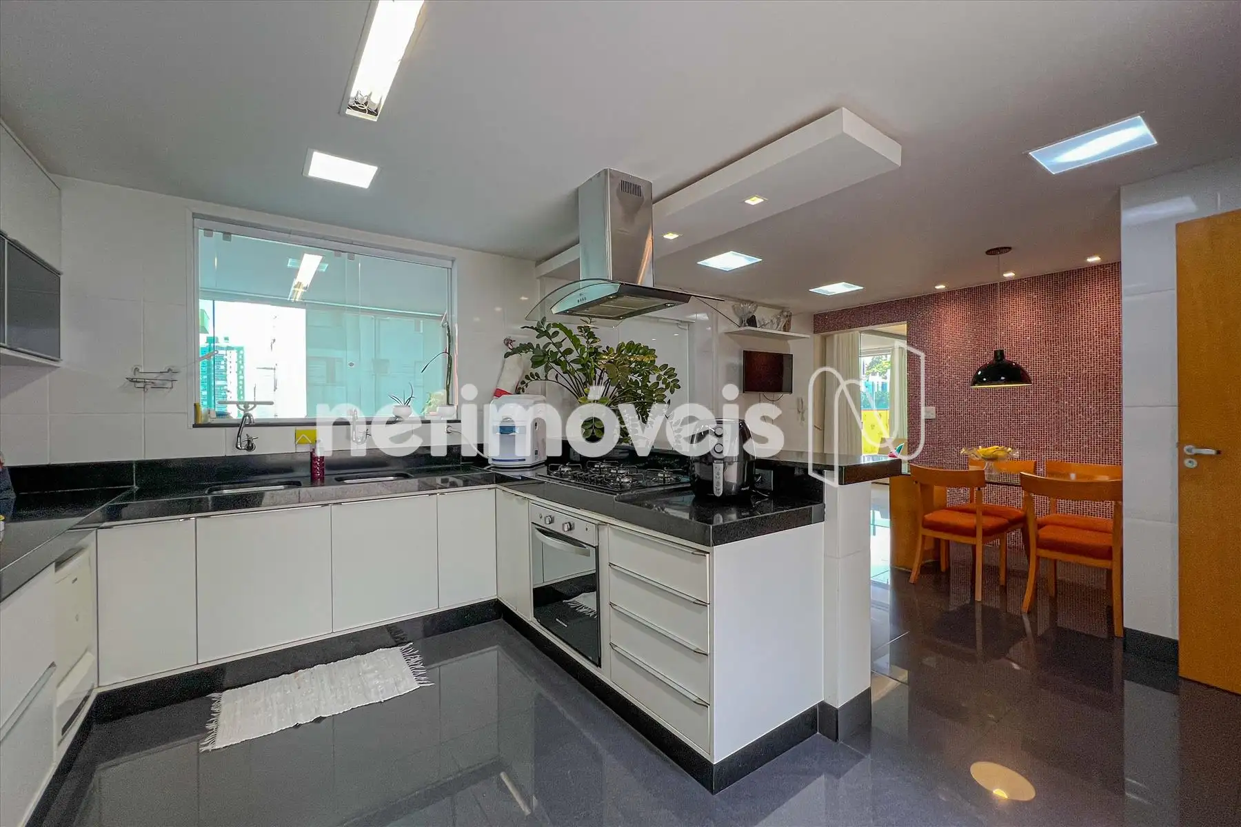 Cozinha planejada com ampla bancada, mesa para refeições e integração com uma das áreas externas.