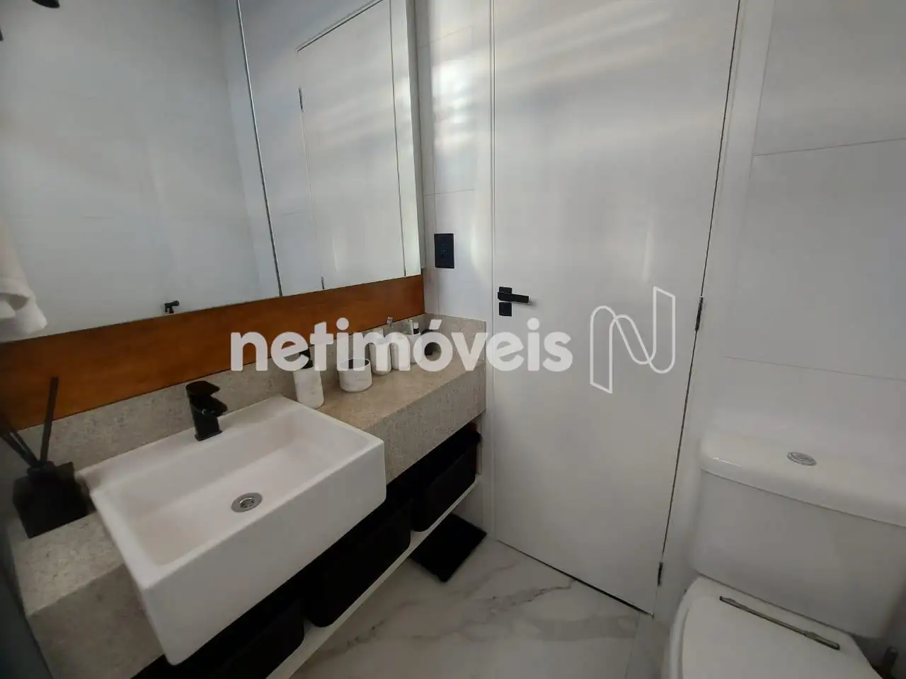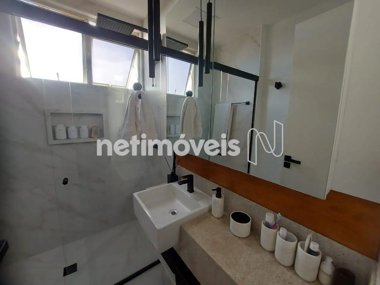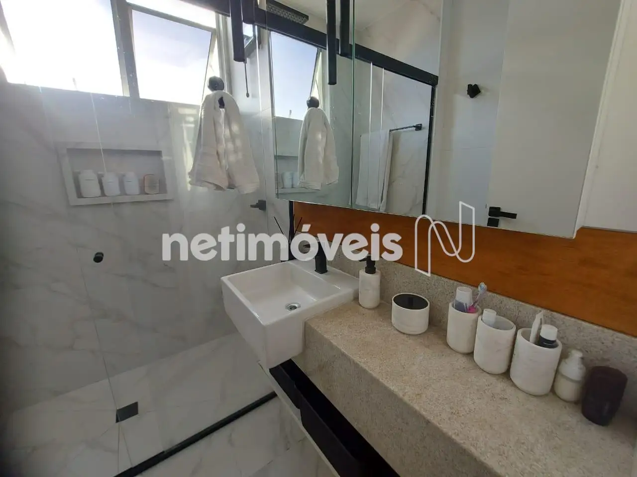Banheiro totalmente atualizado com armário espelhado sob a bancada em granito