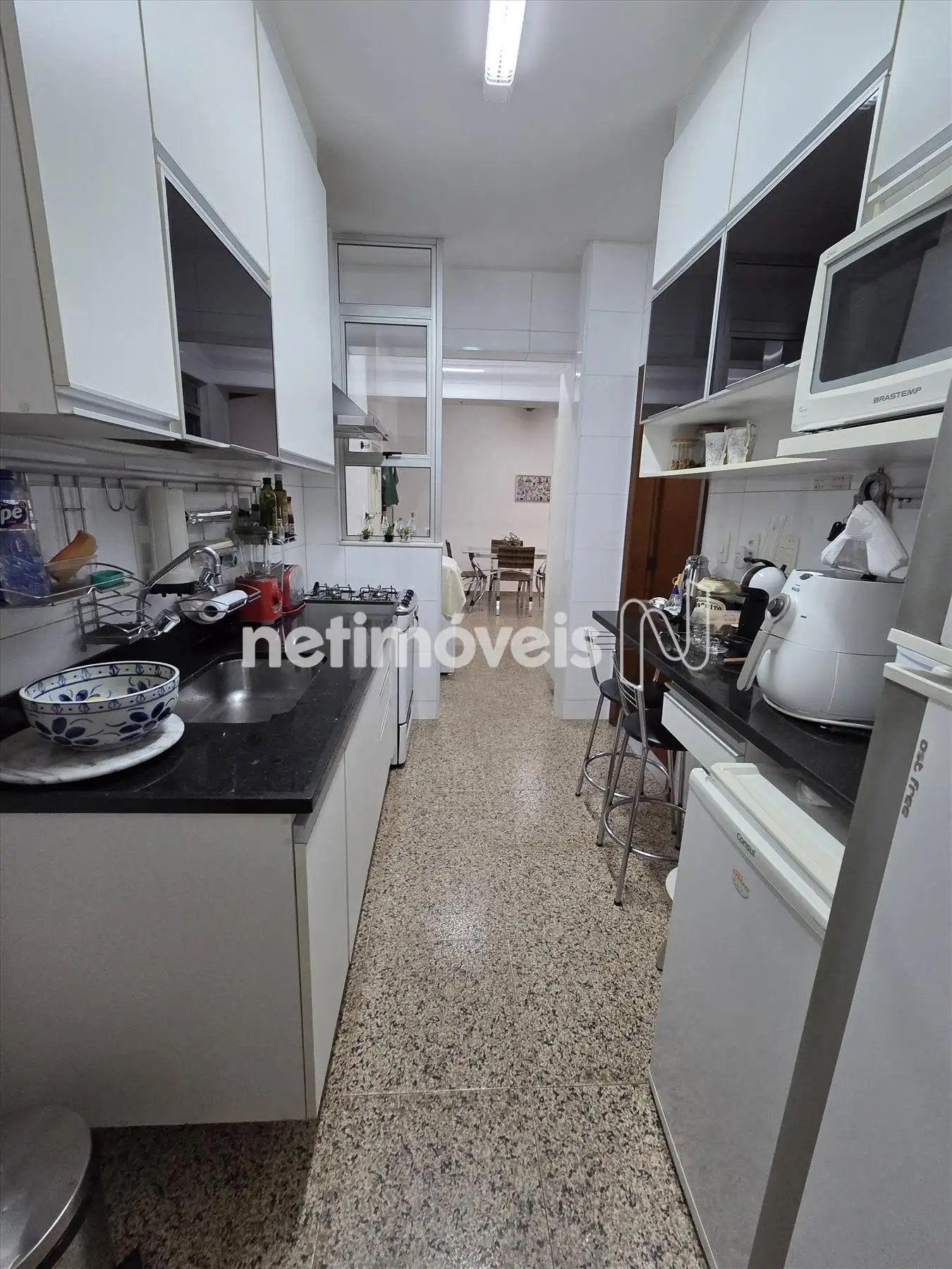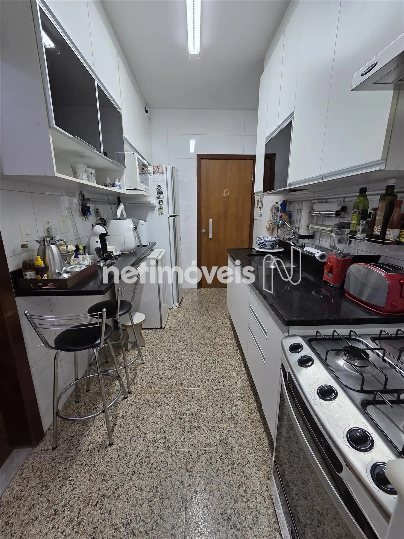 Cozinha com piso e bancada em granito com armários e despensa.