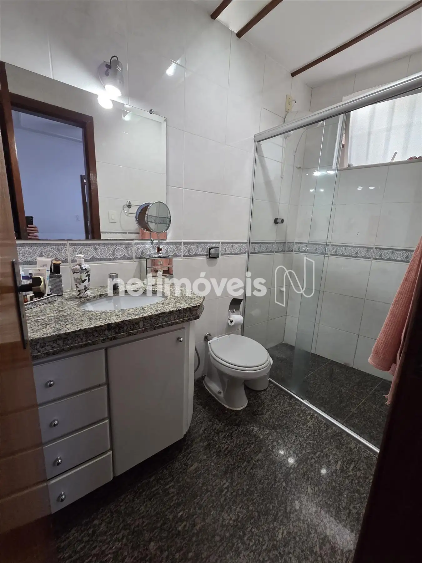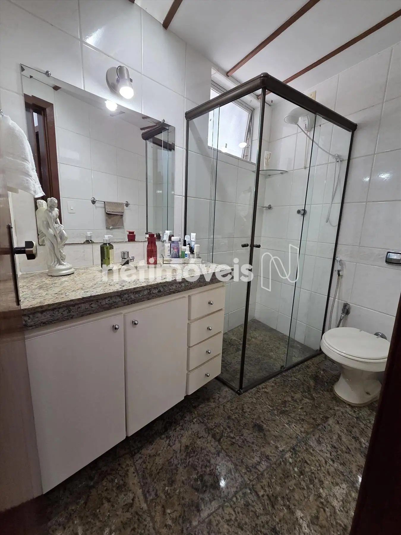 Banhos (social e suíte) piso e bancada em granito, com armário, box em blindex,
