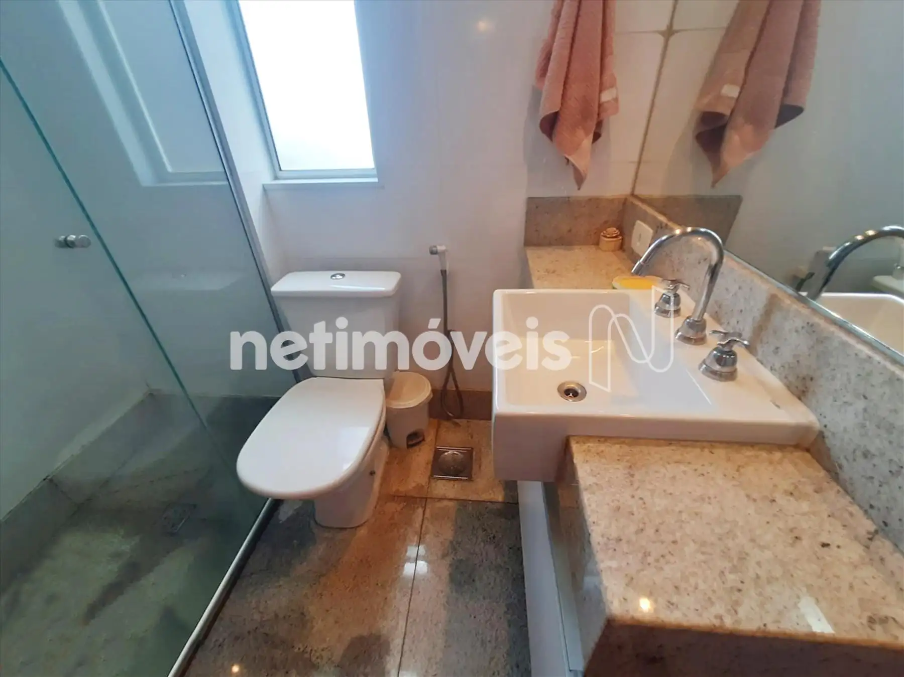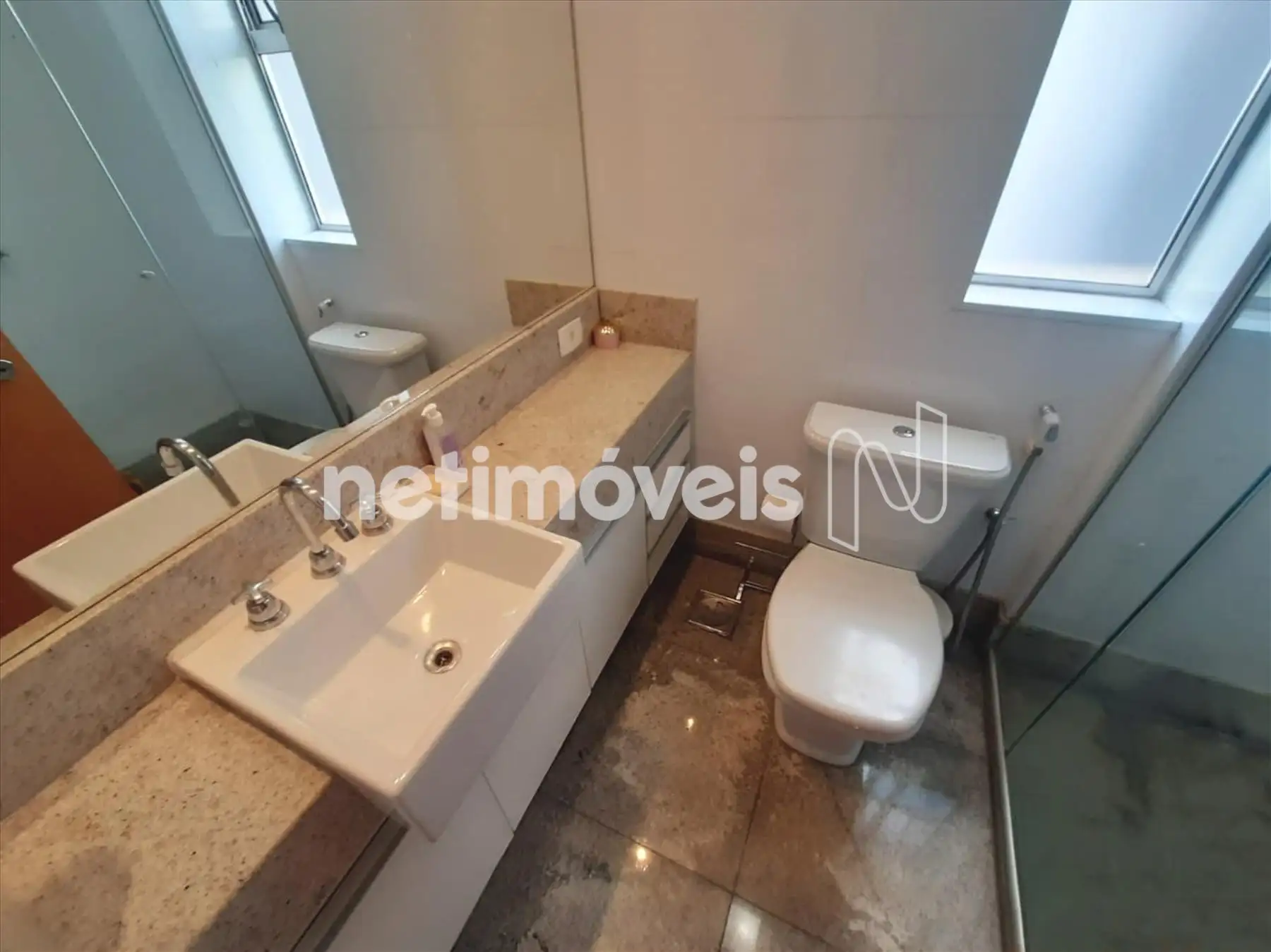 2 banheiros, sendo 1 suíte e 1 banho social, ambos com armários, pias em cuba e bancadas em granito, com box em vidro temperado. Pisos em granito.