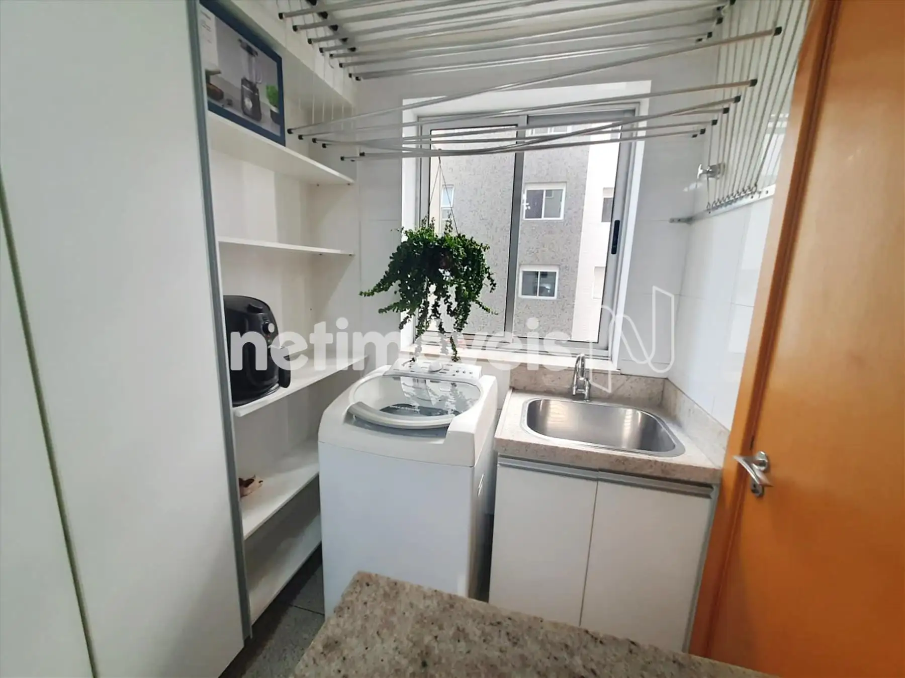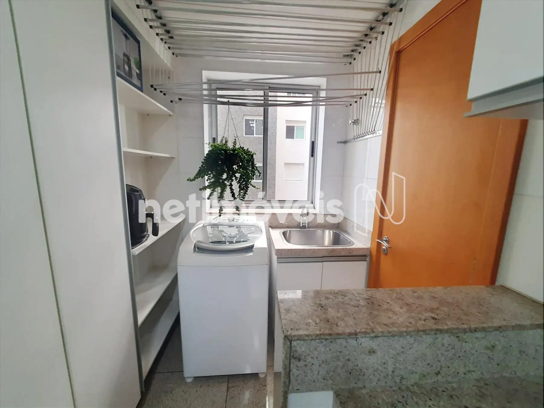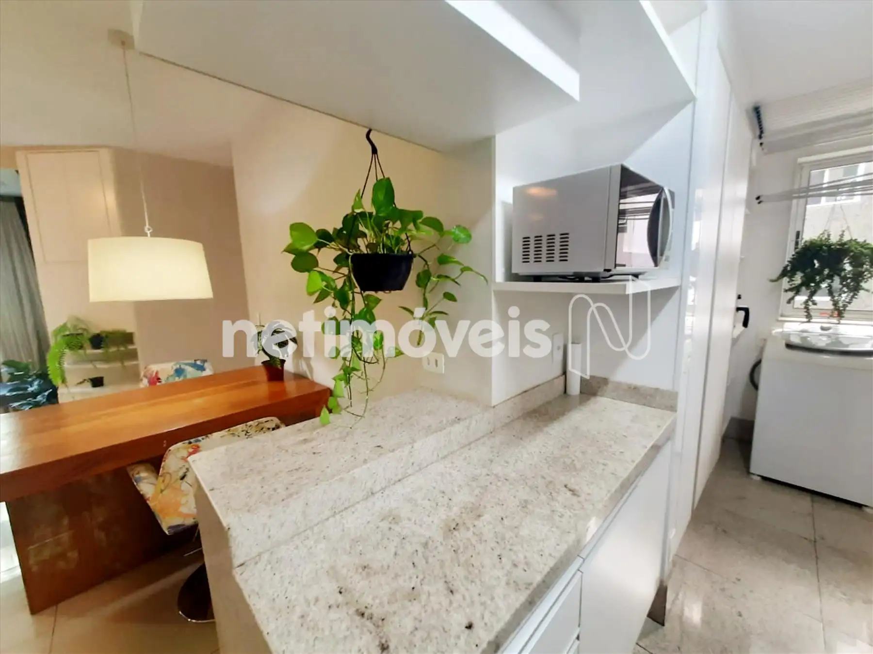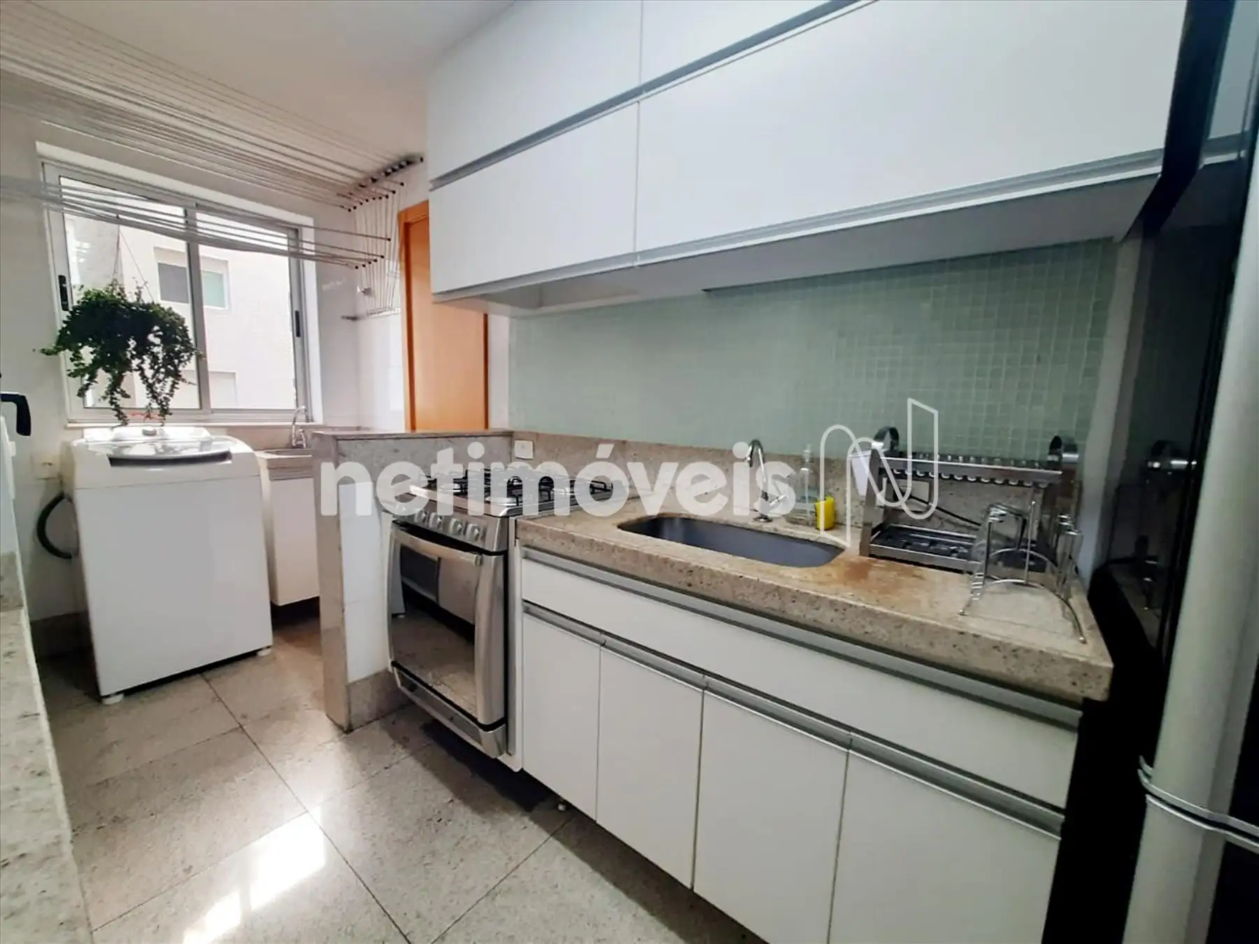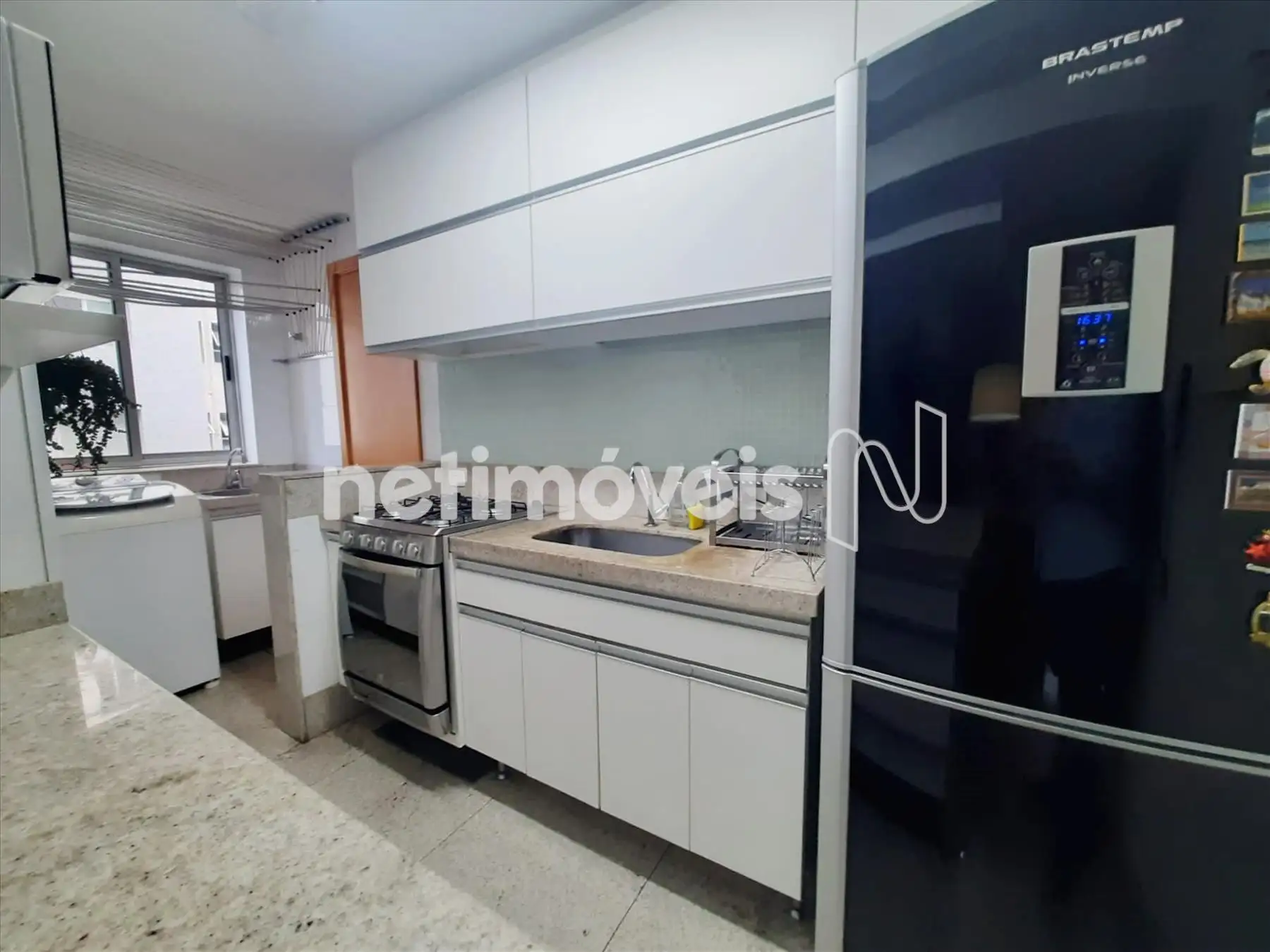 Cozinha estilo americana, toda planejada com armários, bancadas em granito, piso em granito. Área de serviço com armário, bem arejada e clara, piso em granito.