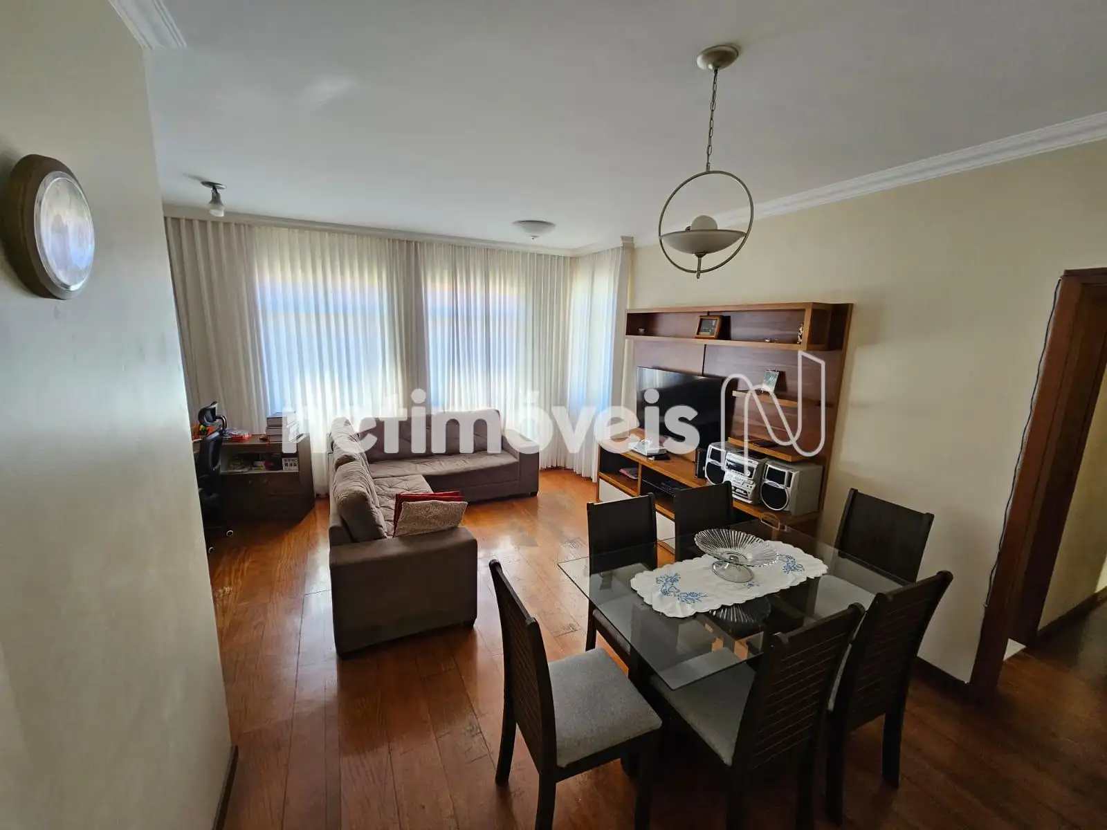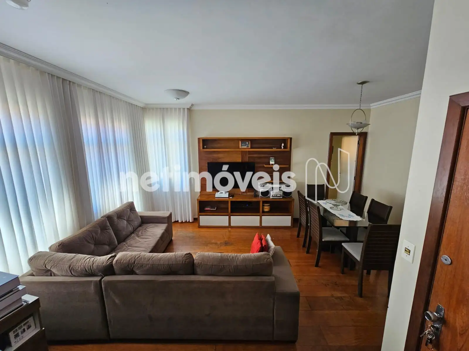 Apartamento de 87m². Sala de tamanho grande e bem iluminada por três janelas. Todos os três quartos comportam camas de tamanho casal.