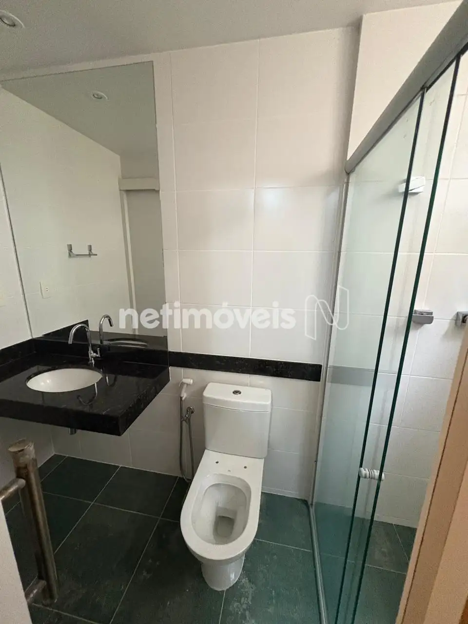 Banhos social e suíte com box de blindex, bancada em granito e espelho.