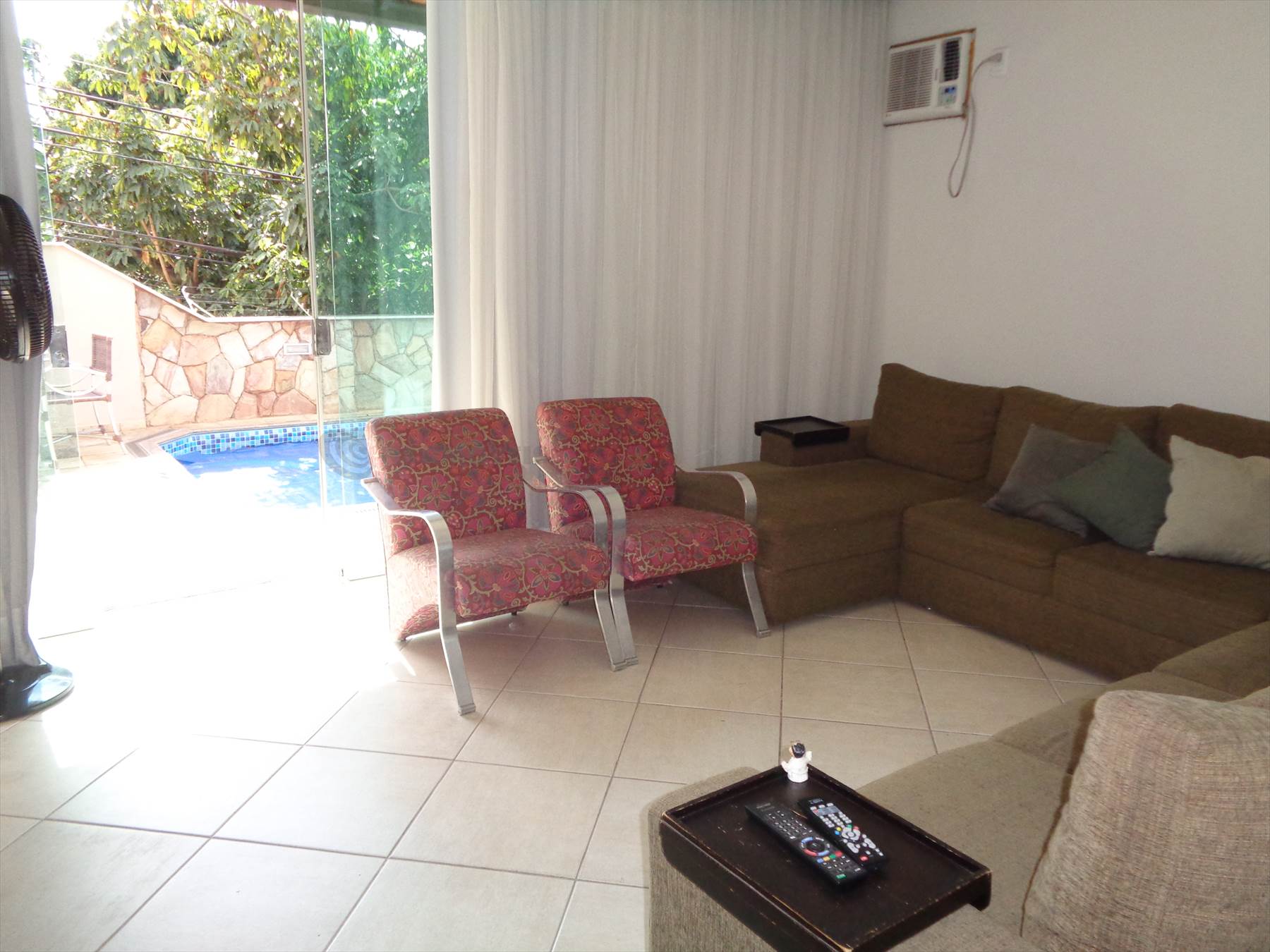 Sala de TV com painel fixo e vista para piscina, 1 banho
