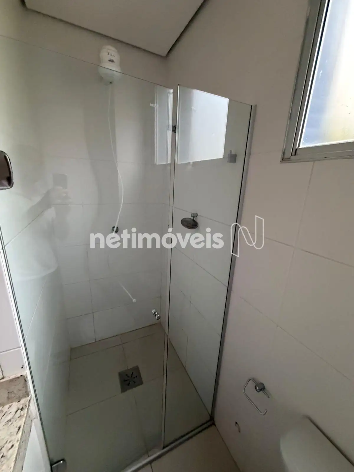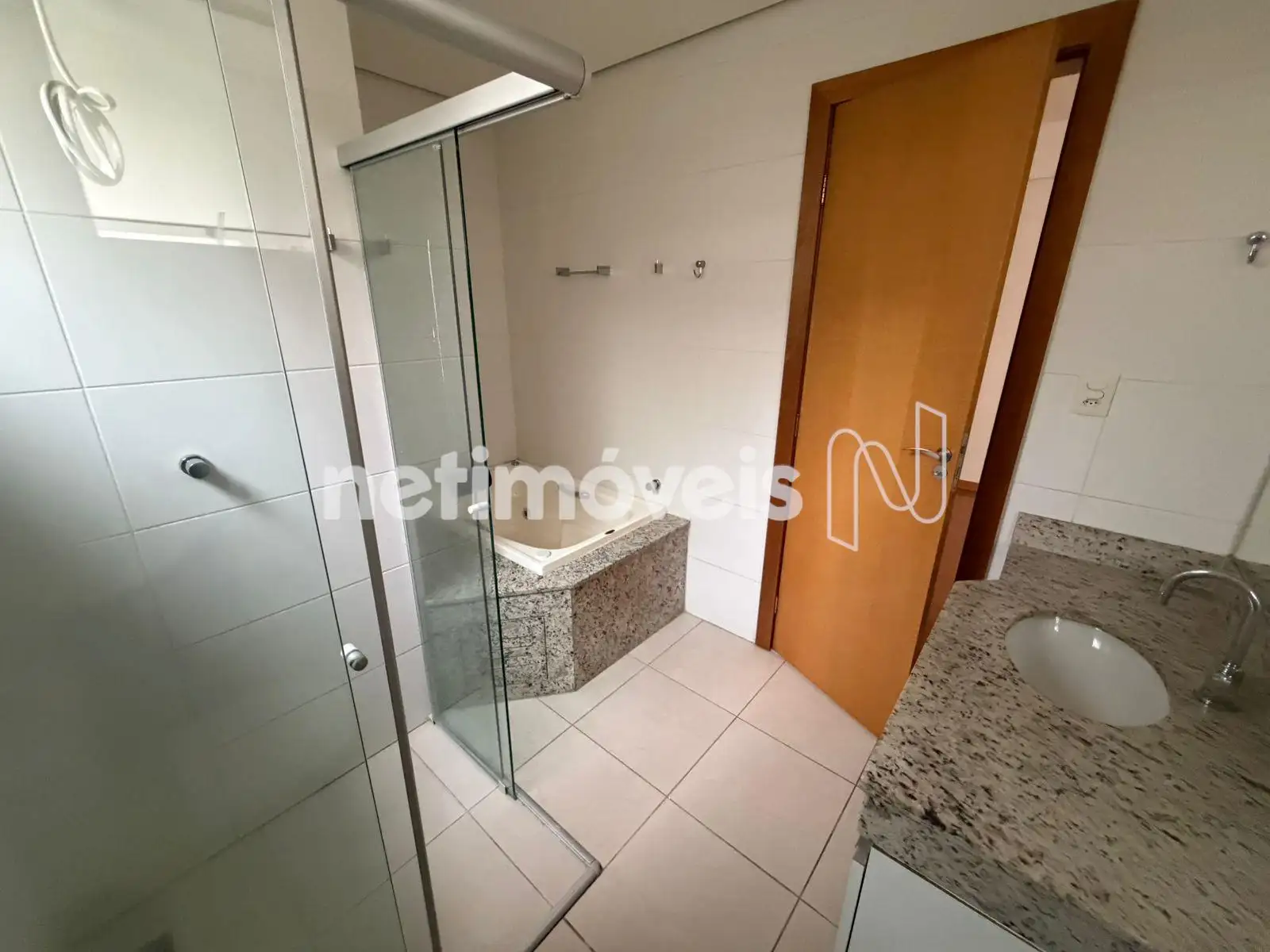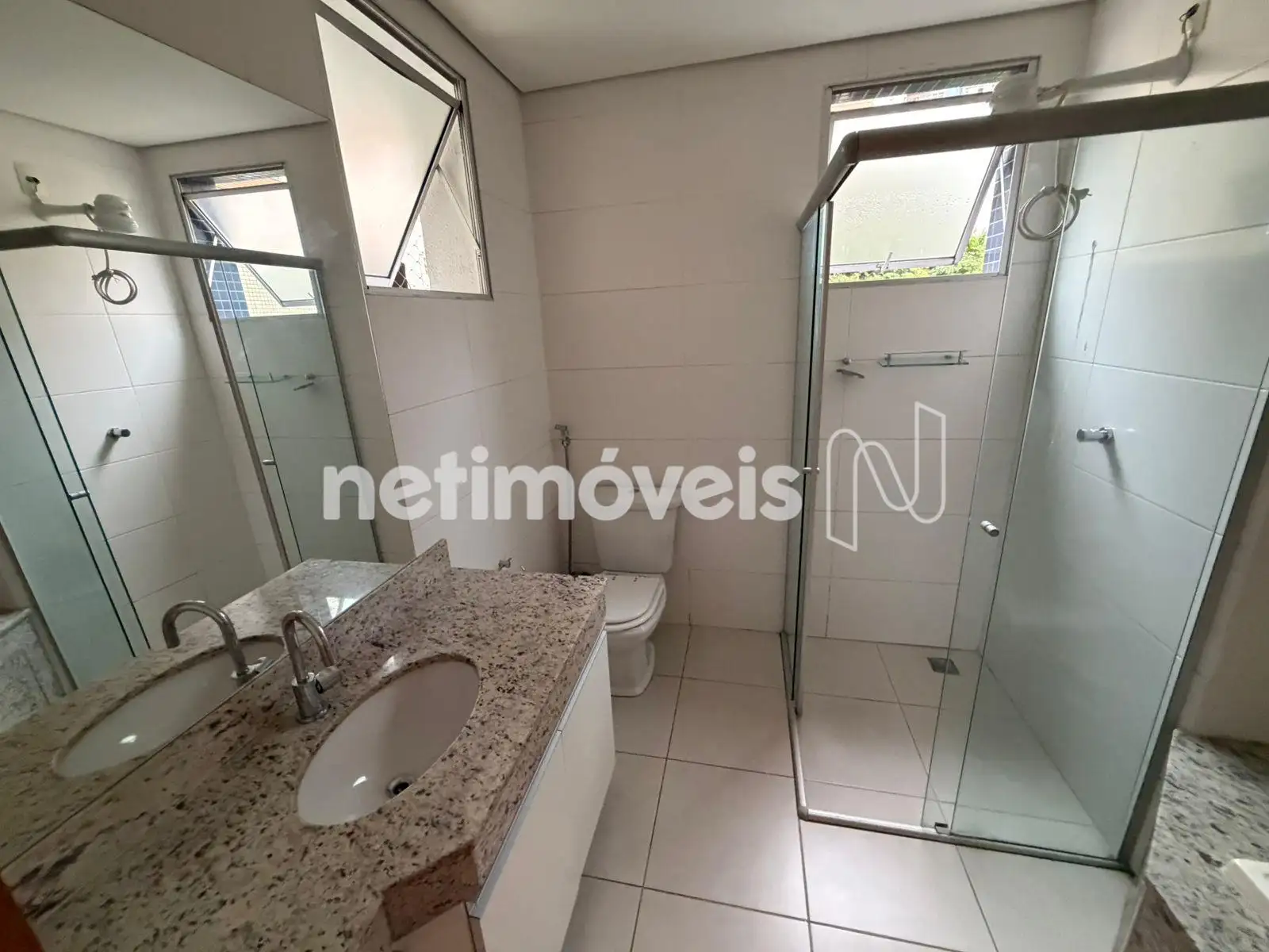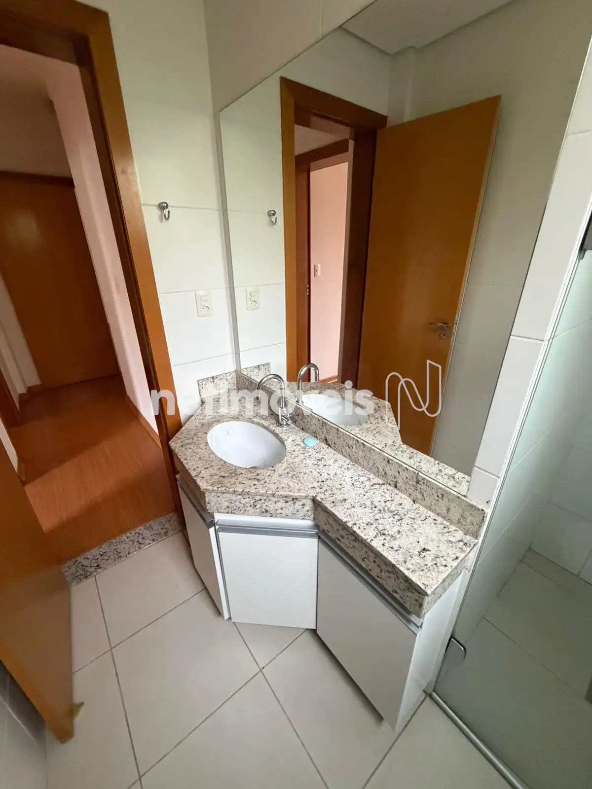 O banheiro social segue o mesmo padrão de acabamento, com bancada em granito, box e espelho amplo.