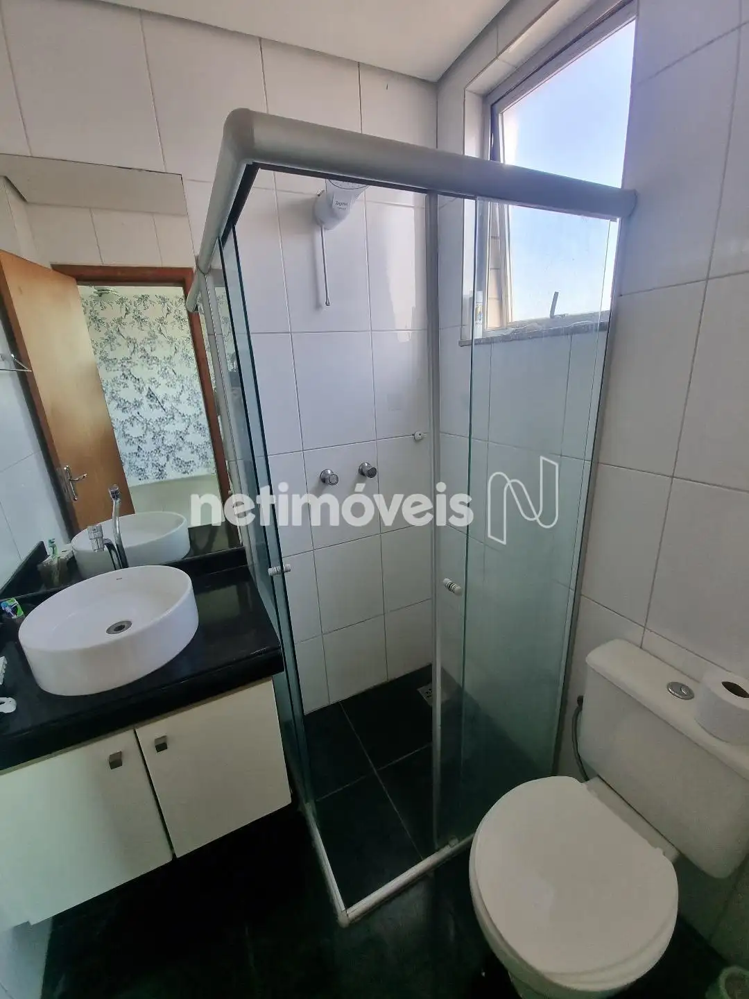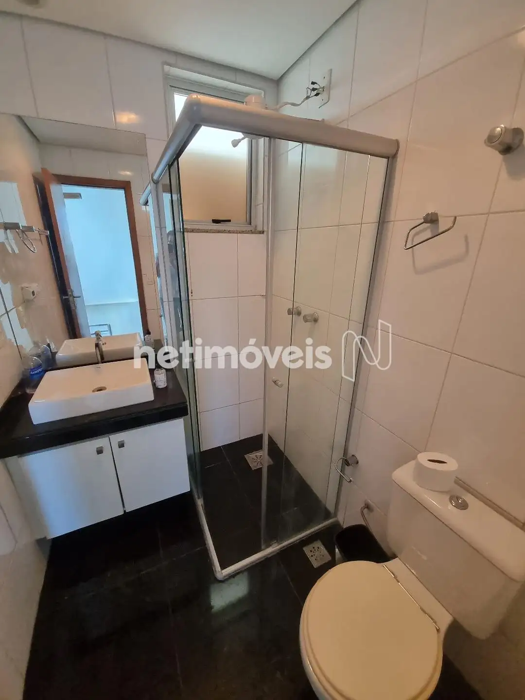 1 banho social com box, armário e espelho.