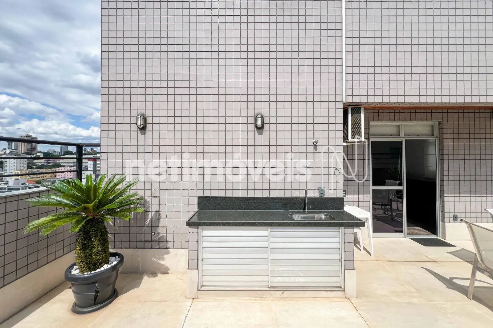 No pavimento superior, a área externa descoberta oferece espaço para mesa e convivência, com bancada de apoio. O nível também conta com sala de estar e uma suíte com armários e ar condicionado.