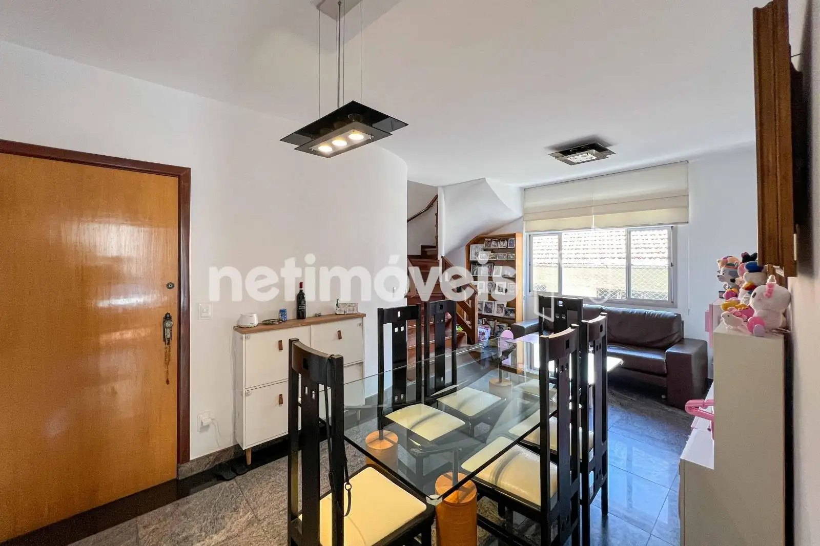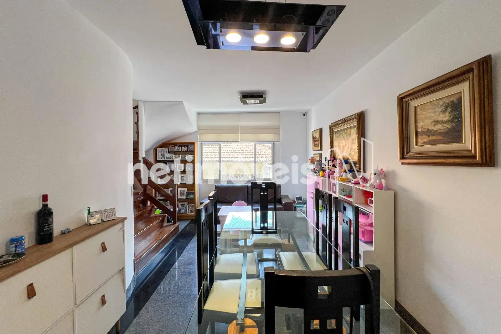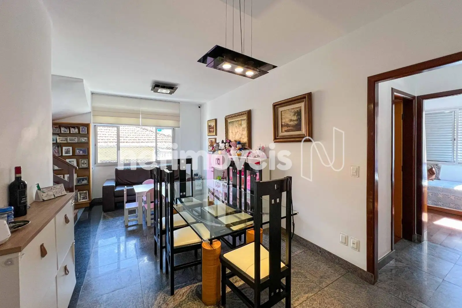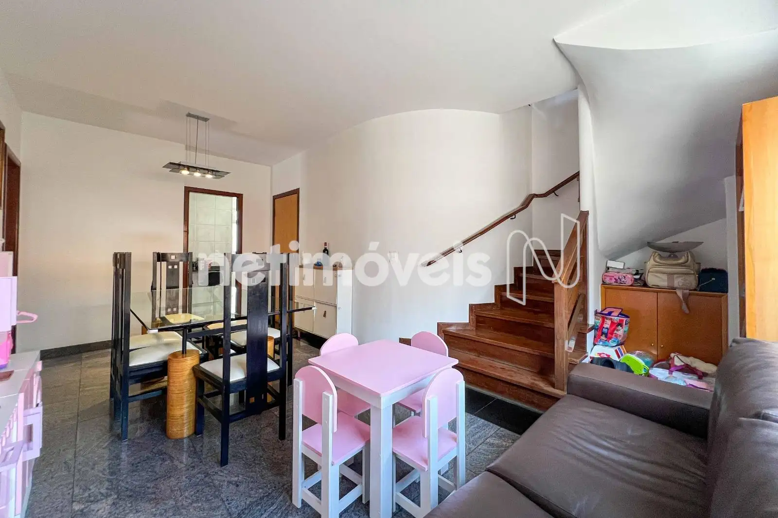 No pavimento inferior, a sala para dois ambientes com piso em granito cria um espaço social integrado. A cozinha planejada possui mesa para refeições rápidas, piso em cerâmica e ligação direta com a área de serviço, possuindo DCE com armários.
