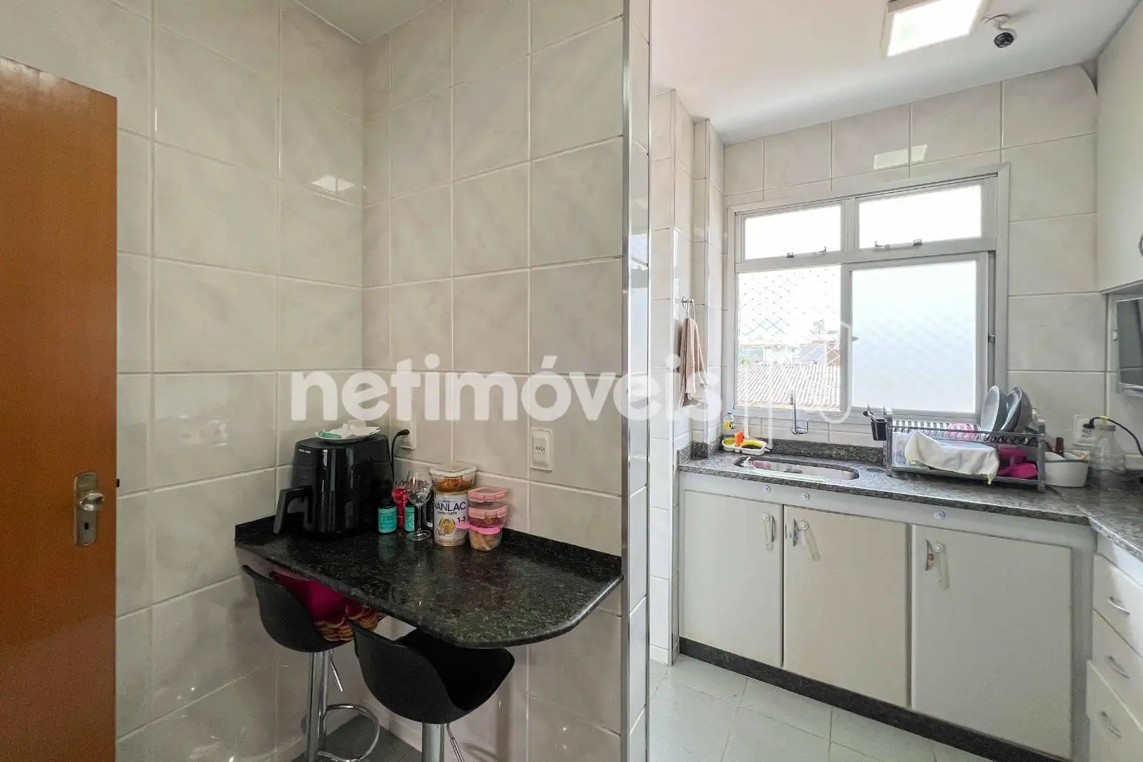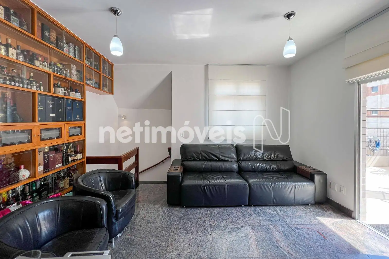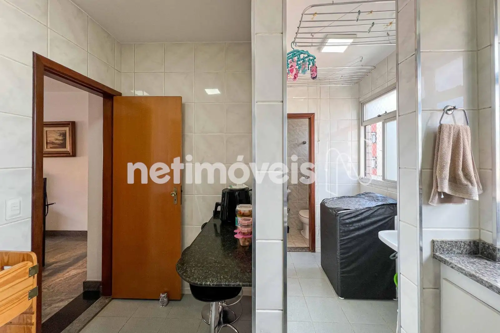 No pavimento inferior, a sala para dois ambientes com piso em granito cria um espaço social integrado. A cozinha planejada possui mesa para refeições rápidas, piso em cerâmica e ligação direta com a área de serviço, possuindo DCE com armários.