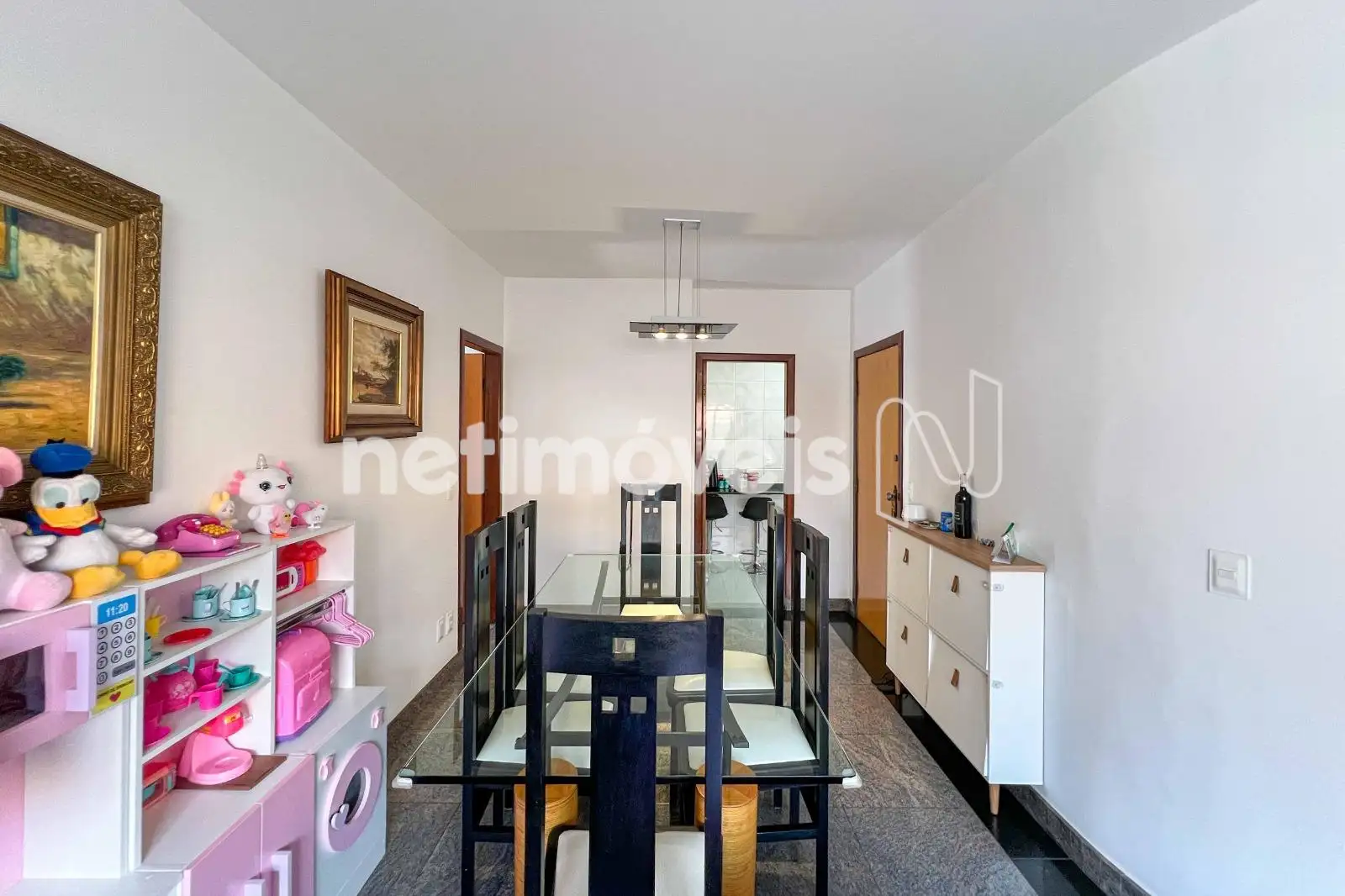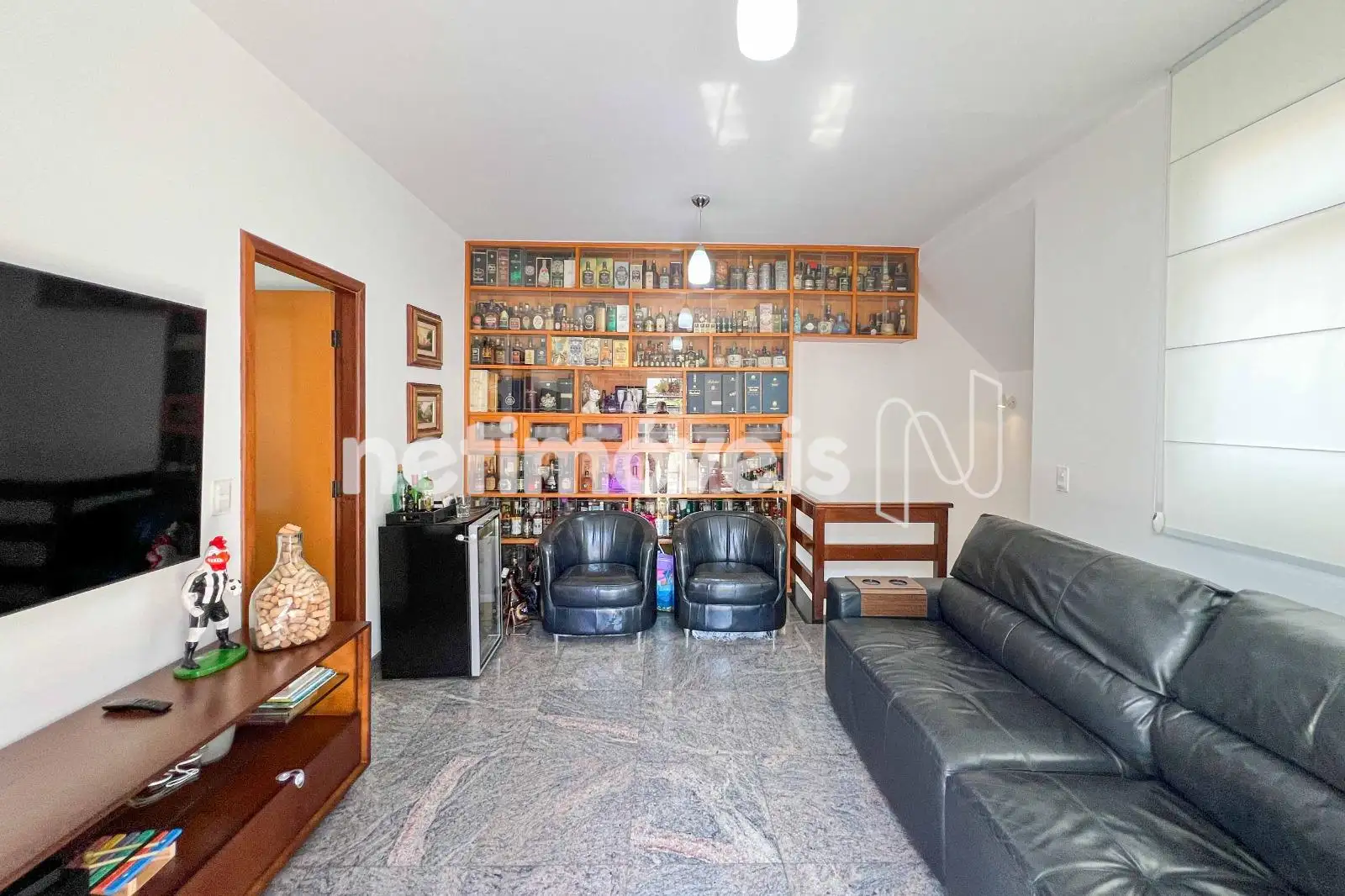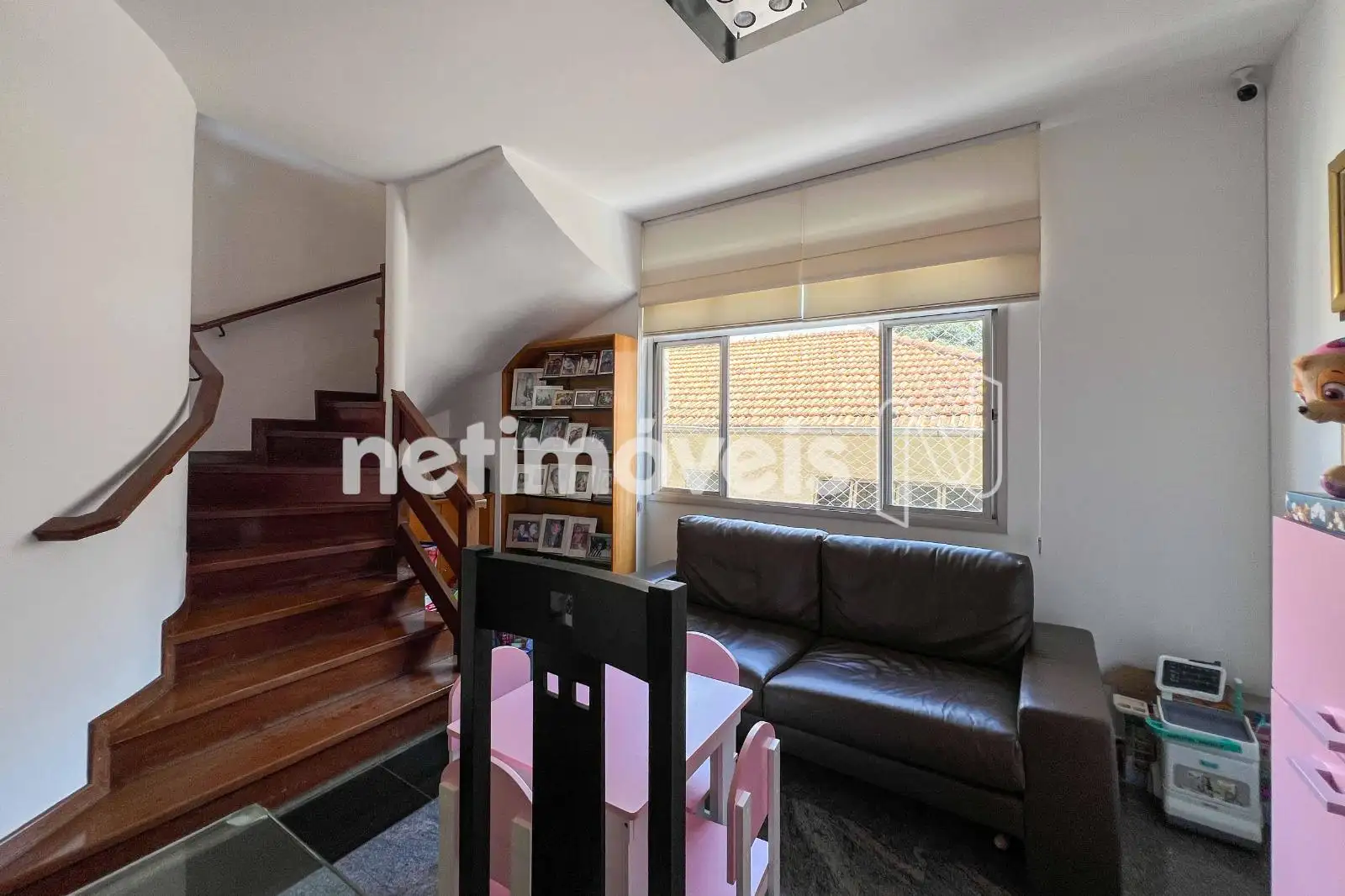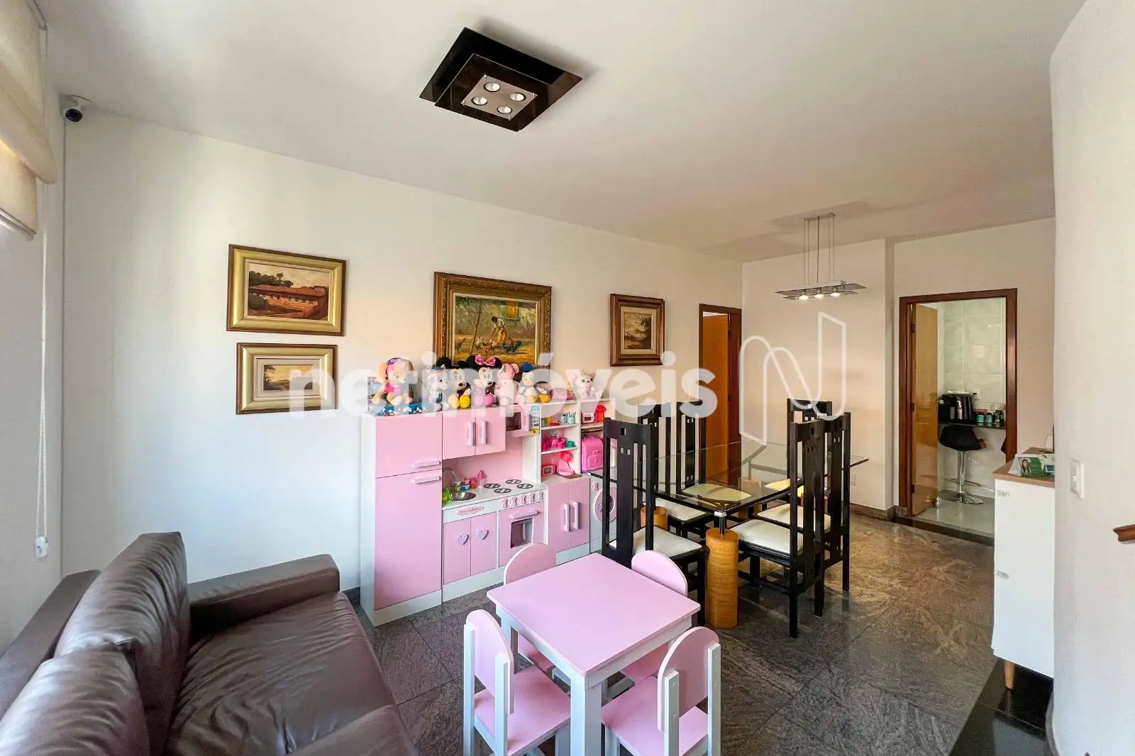 No pavimento inferior, a sala para dois ambientes com piso em granito cria um espaço social integrado. A cozinha planejada possui mesa para refeições rápidas, piso em cerâmica e ligação direta com a área de serviço, possuindo DCE com armários.