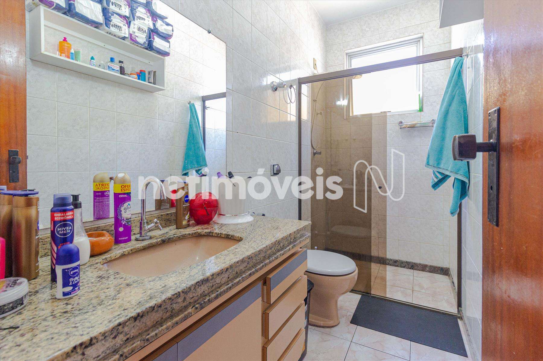 Banho social com piso em cerâmica, bancada em granito, armário sob a pia e box vidro temperado.