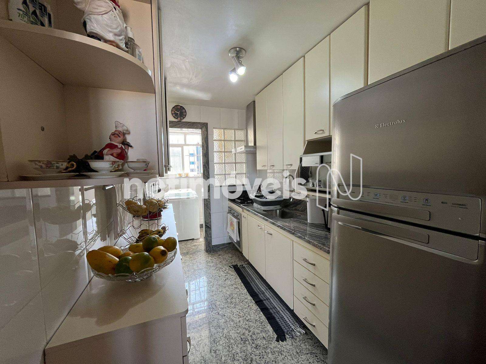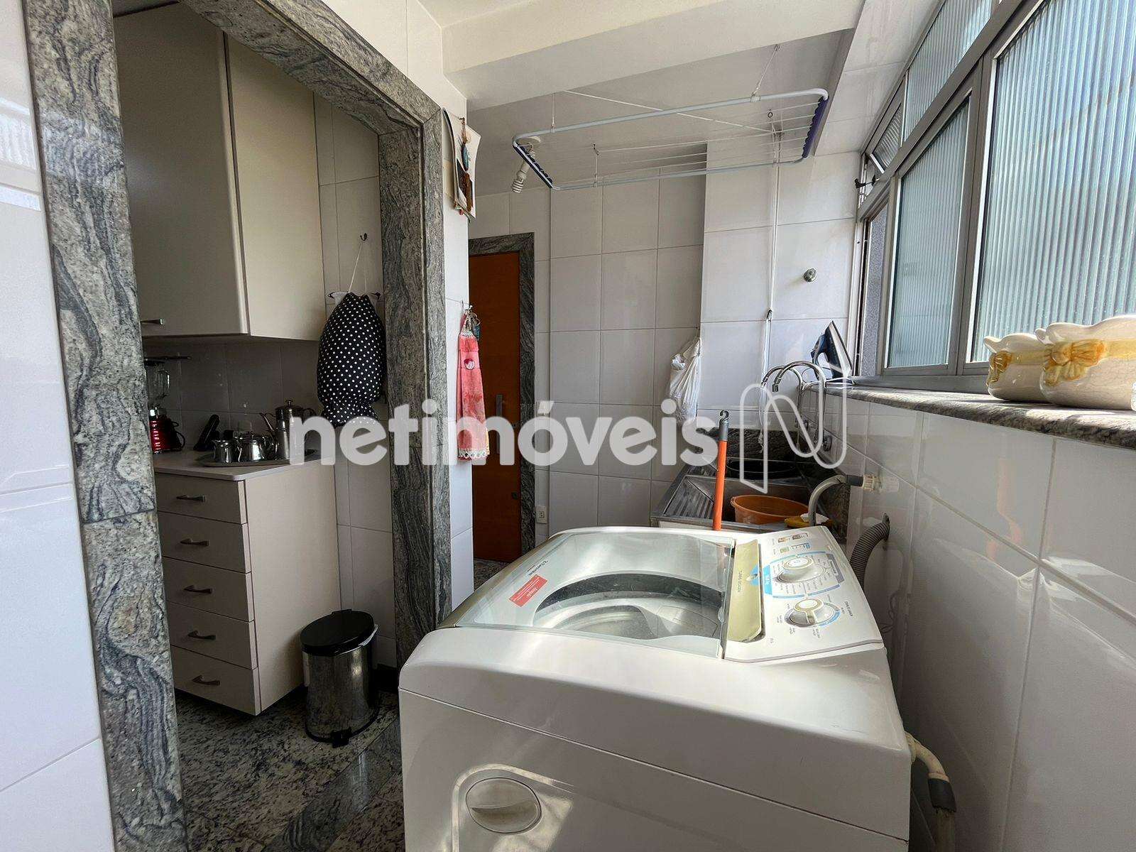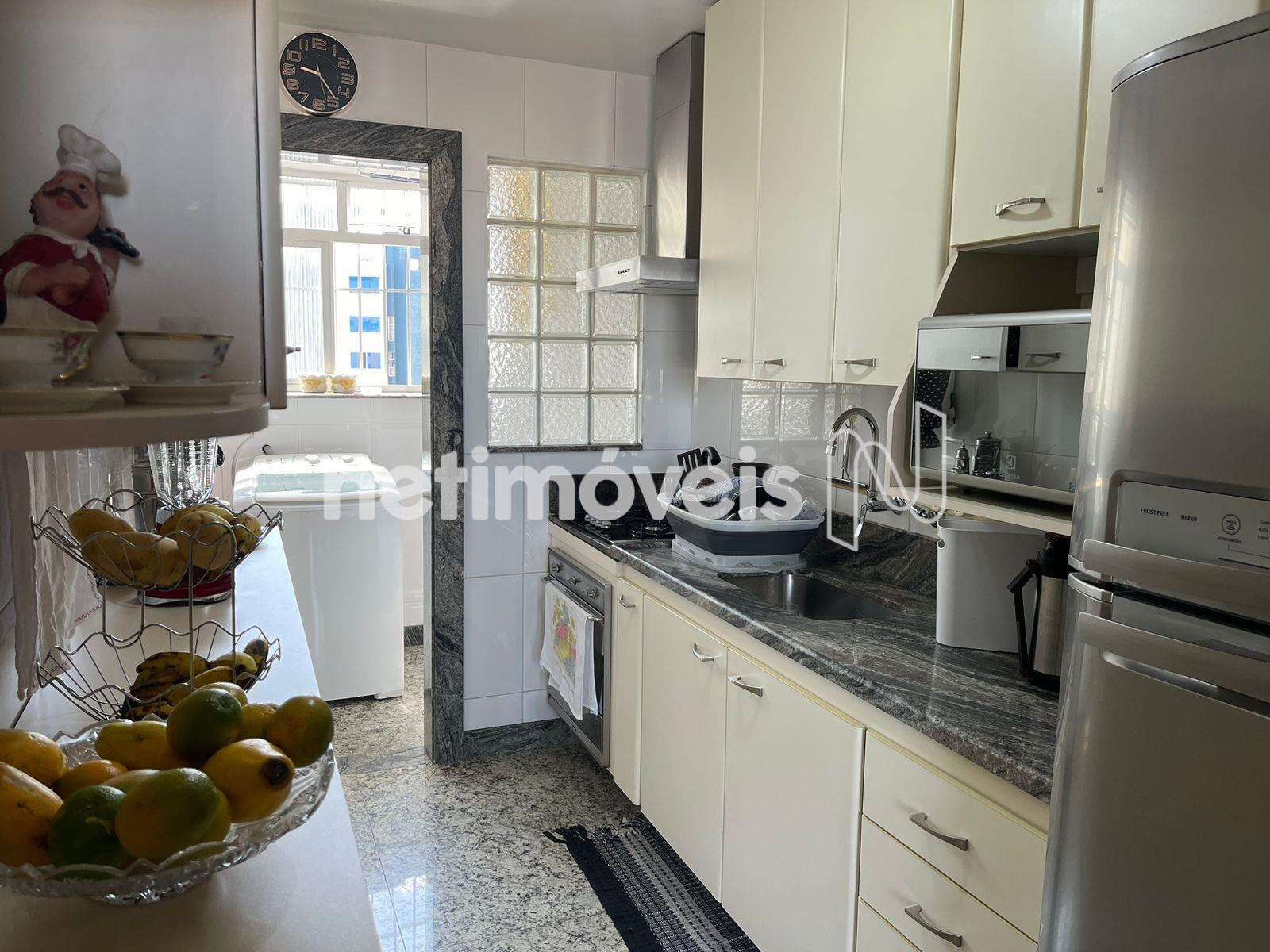 A cozinha é bem equipada, com bancada e piso em granito e armários planejados. A lavanderia é espaçosa, com tanque e armário, com banheiro de serviço e um quarto para dispensa.