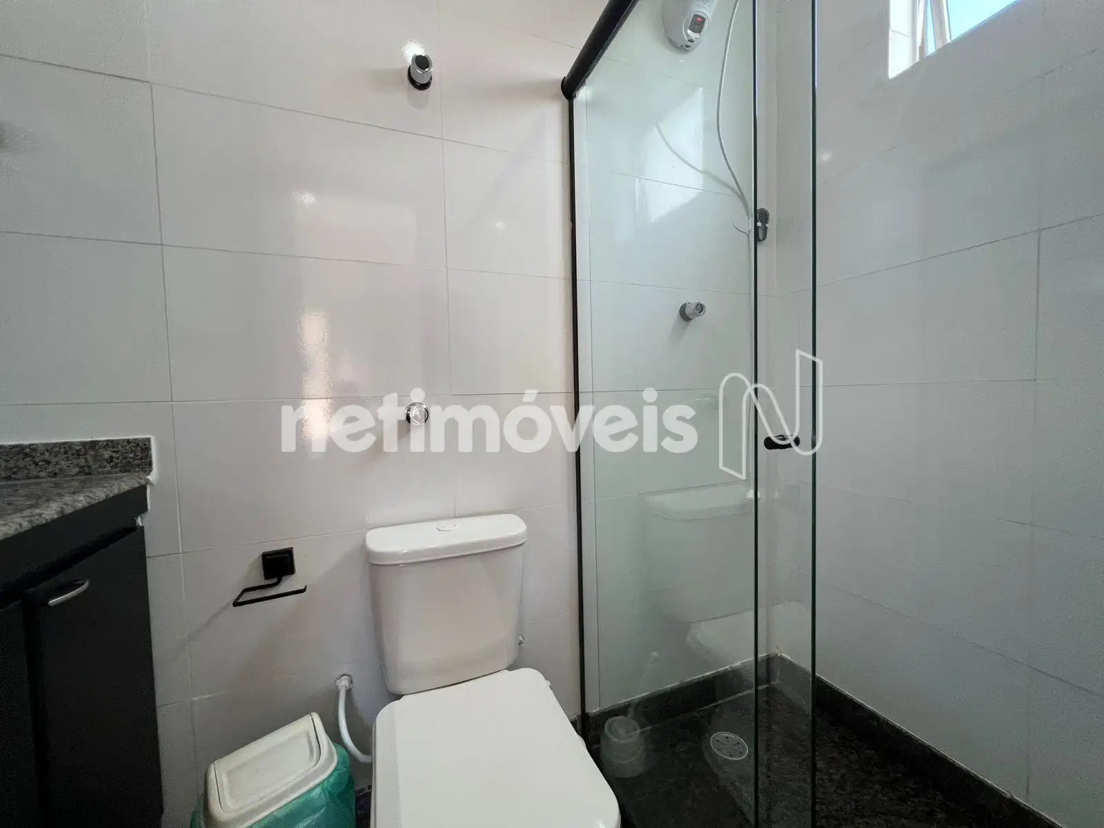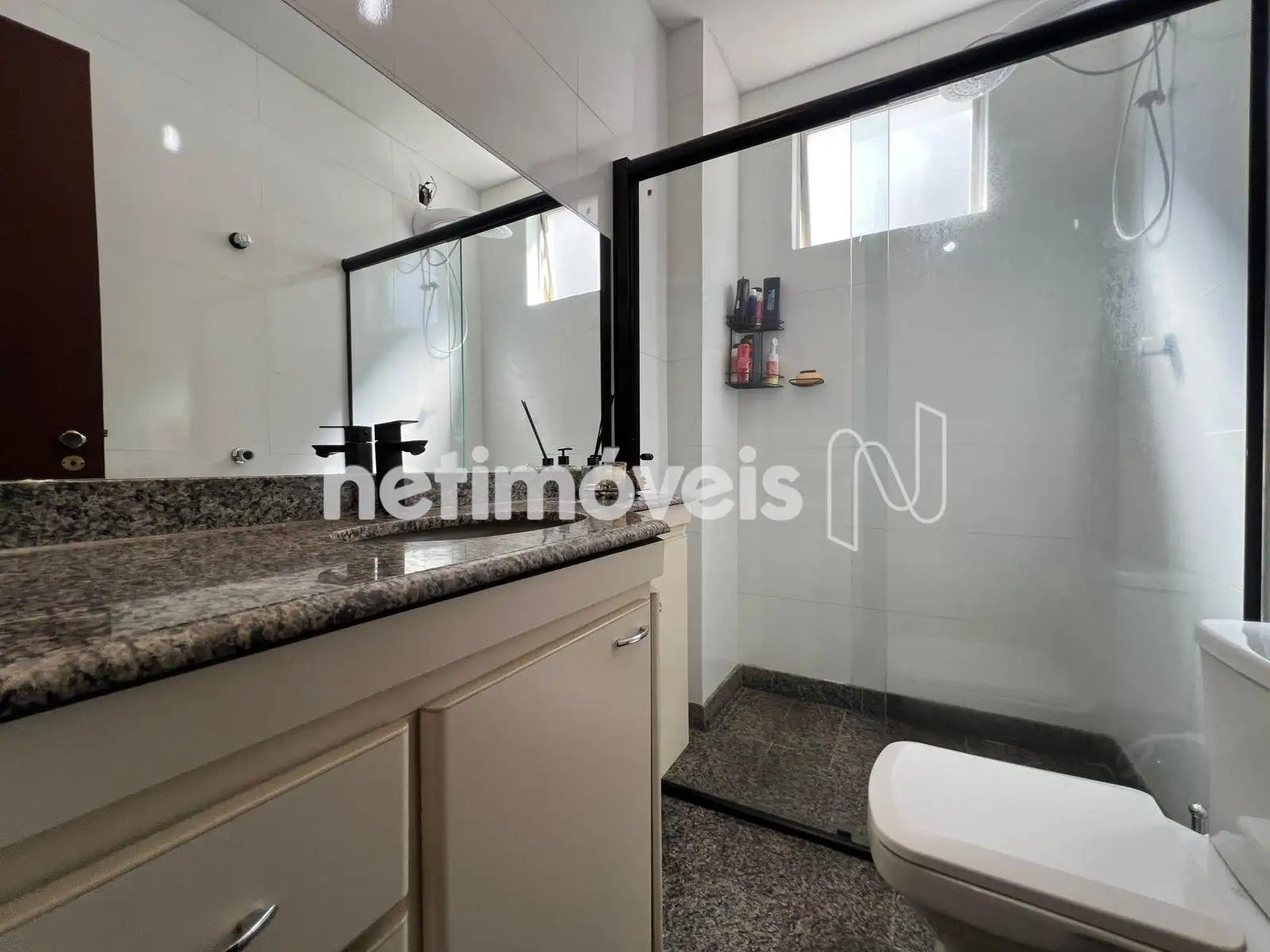 - Banheiro social com armários sob bancada em granito e box em blindex.