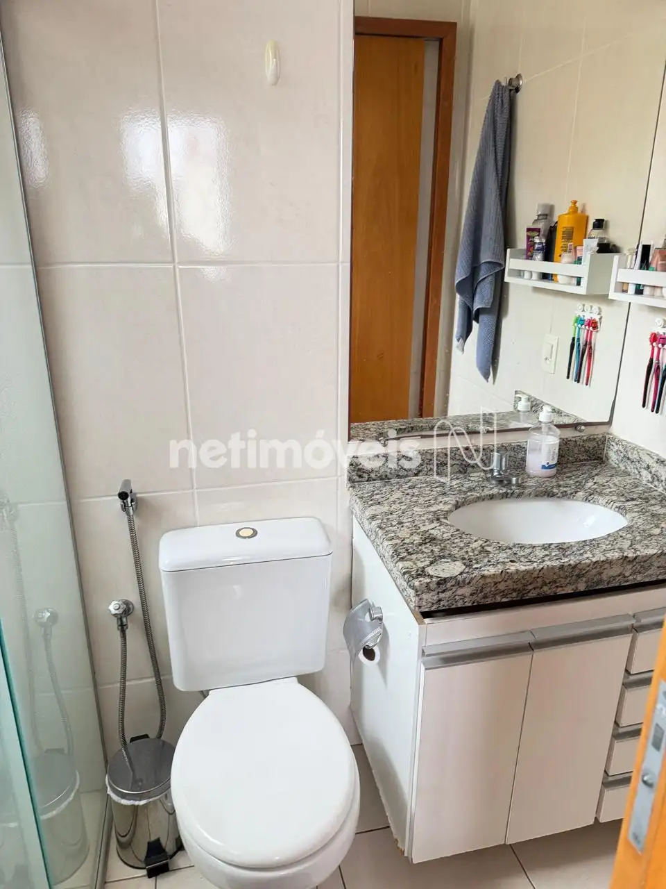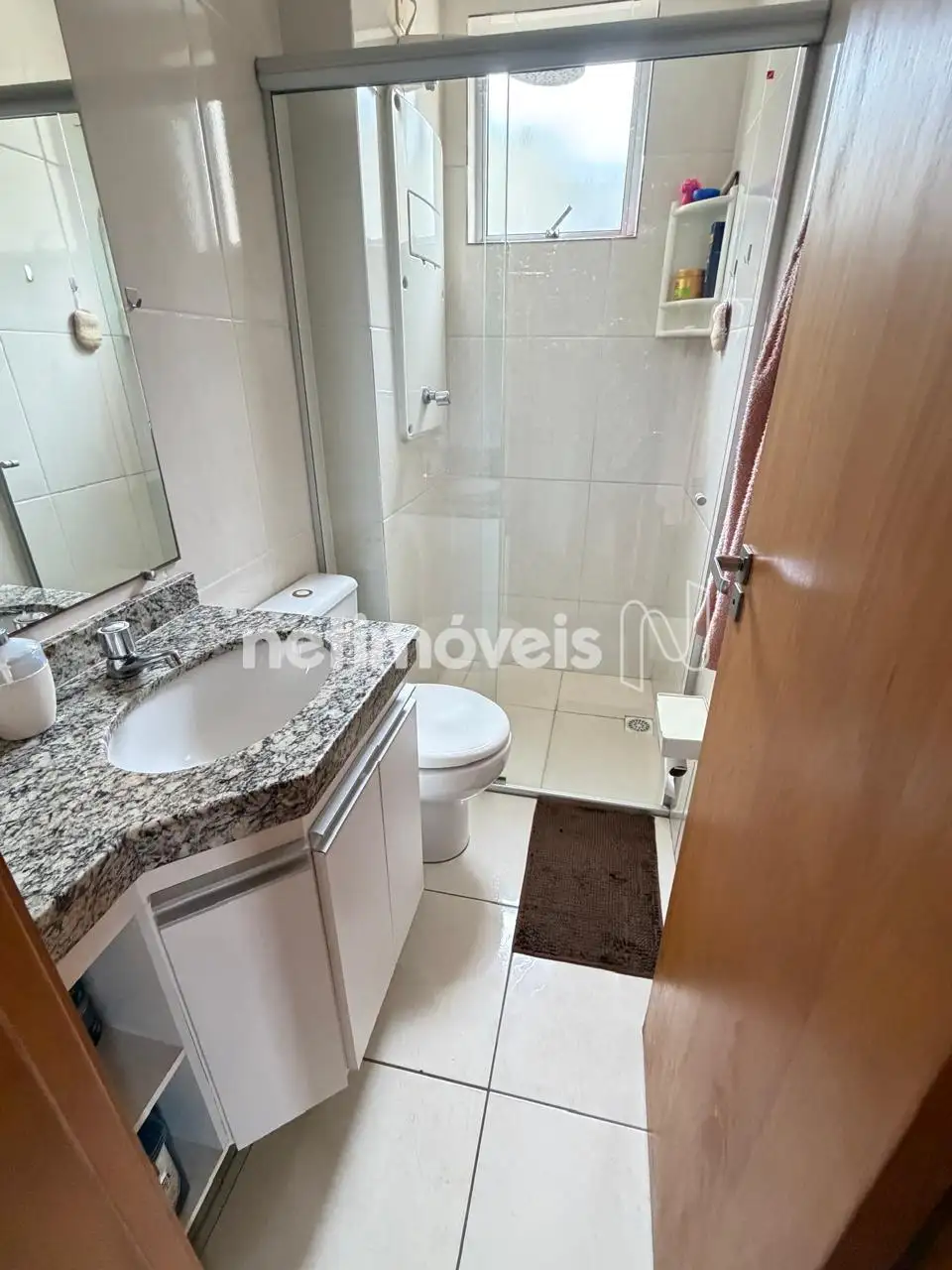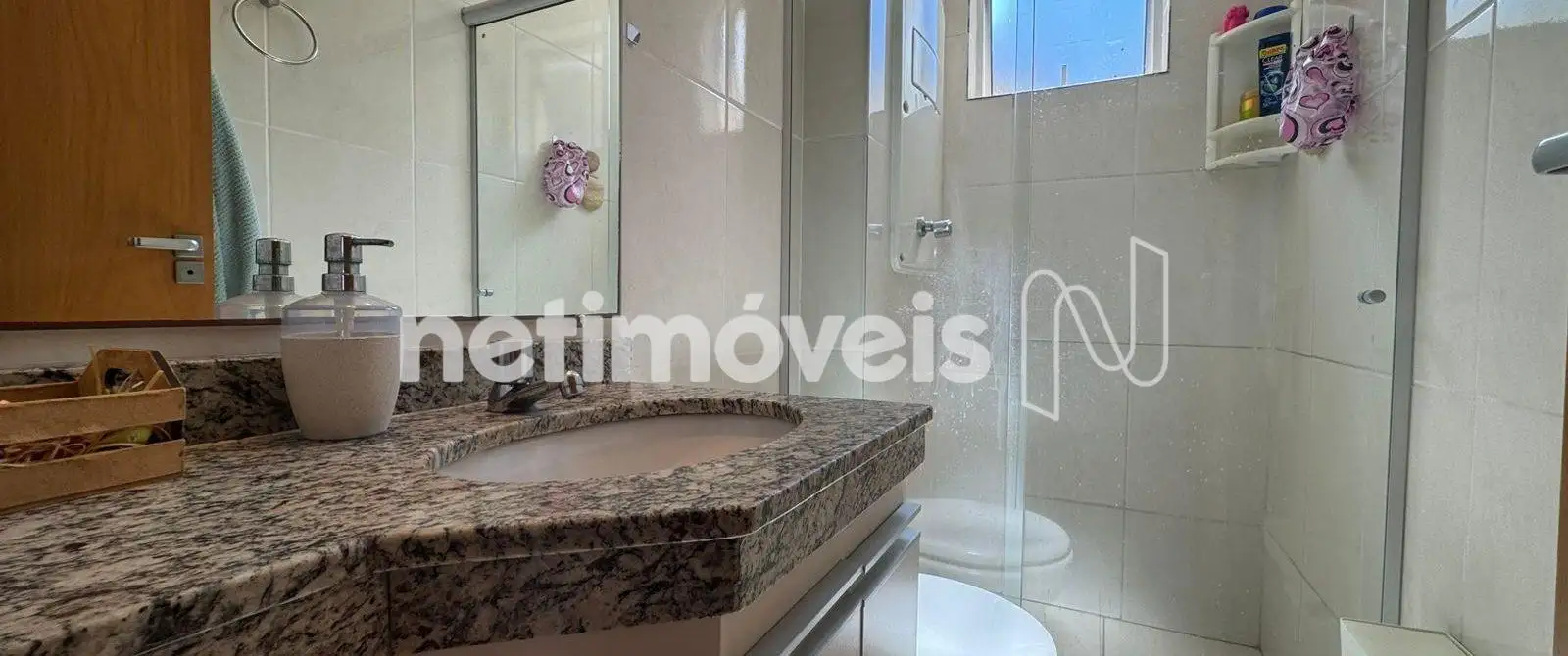 Banho social com box em blindex, bancada em granito e piso em cerâmica.