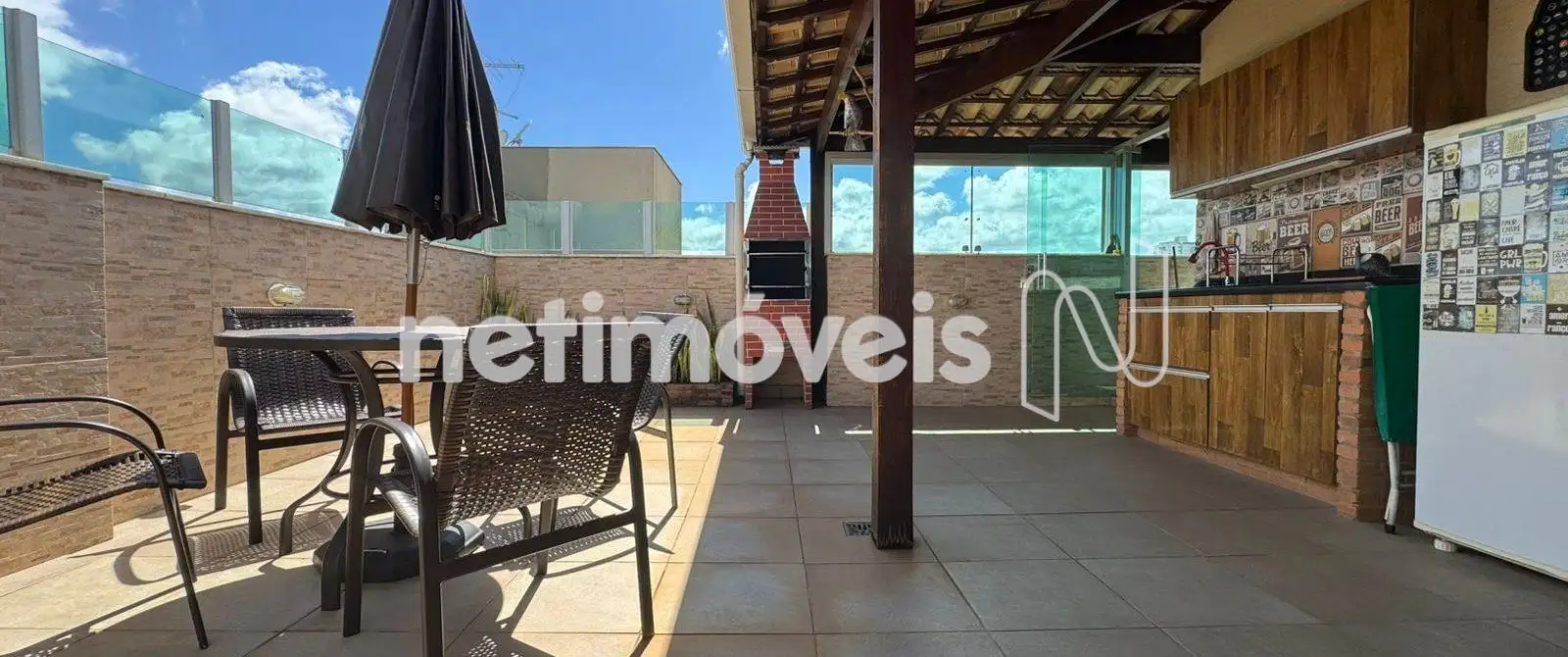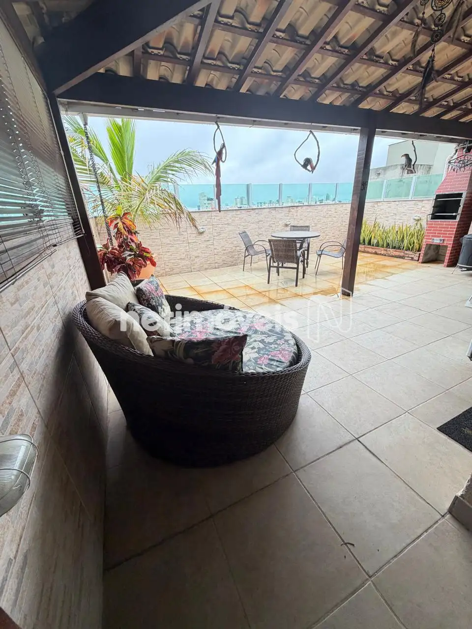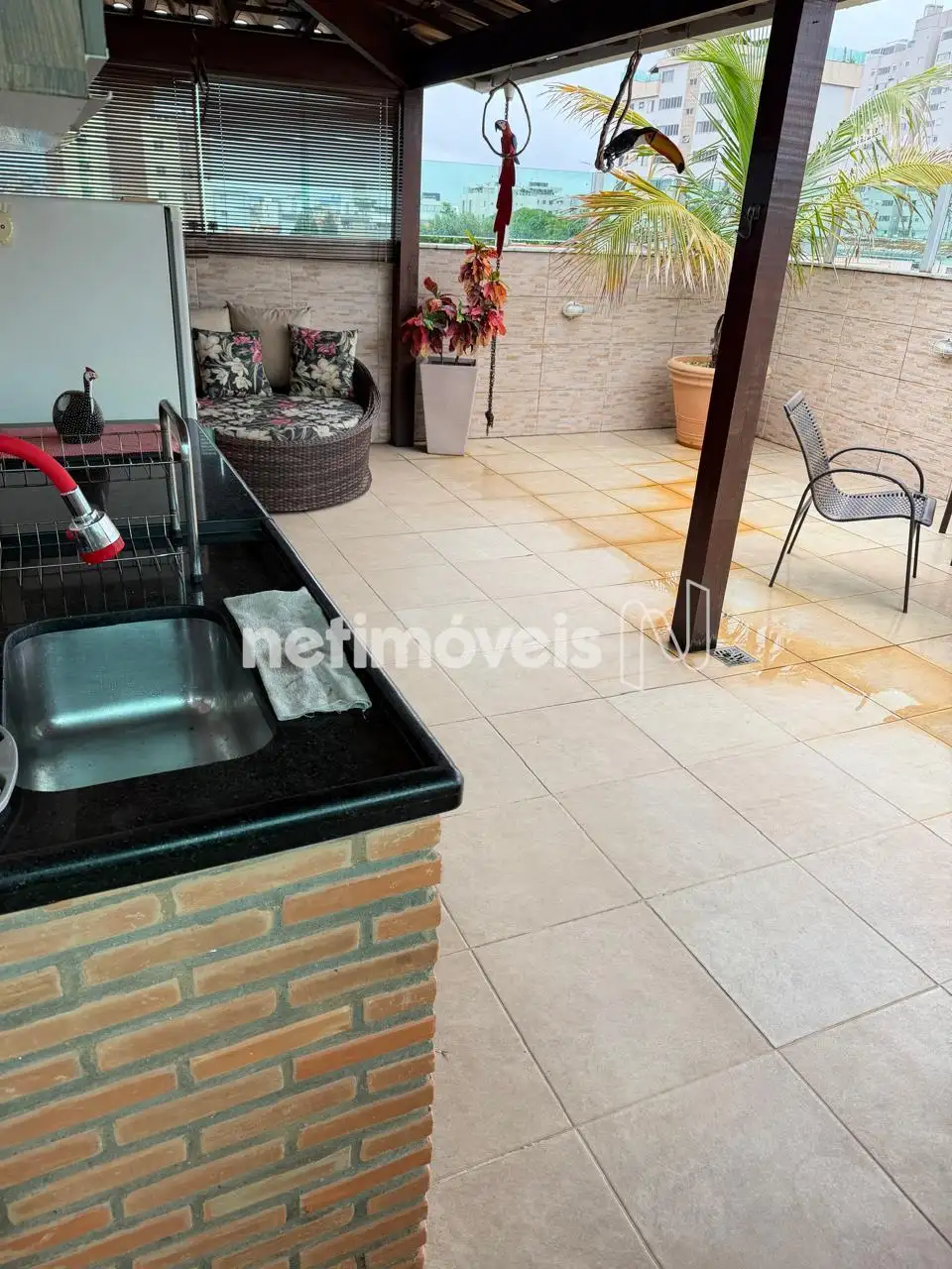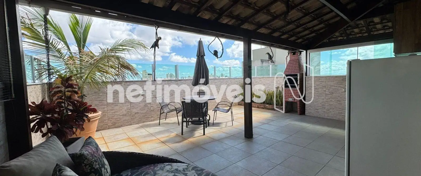 Área livre coberta com vista panorâmica de 180º, equipada com churrasqueira, , bancada em granito, armários, telhado colonial e fechamento em vidro blindex.