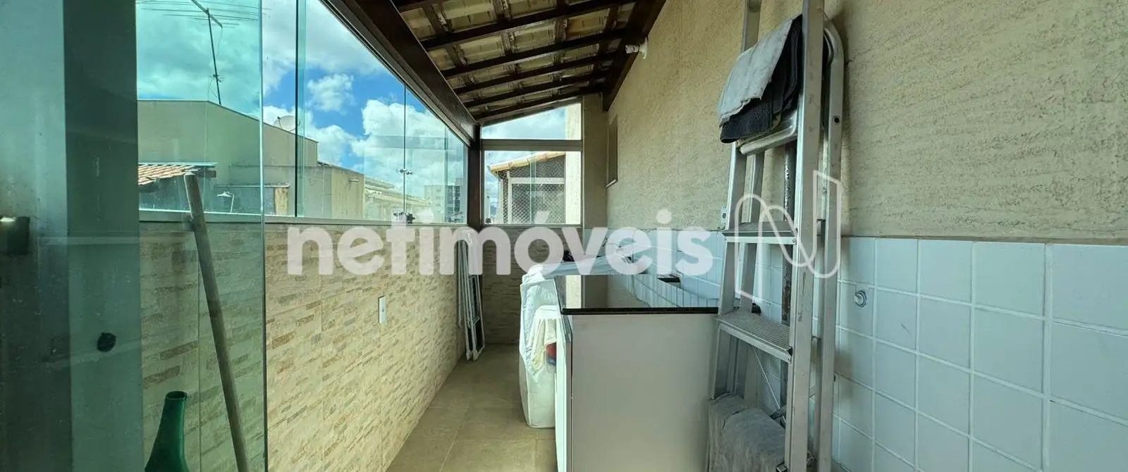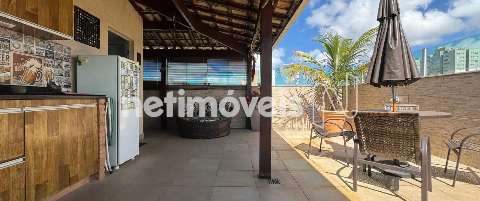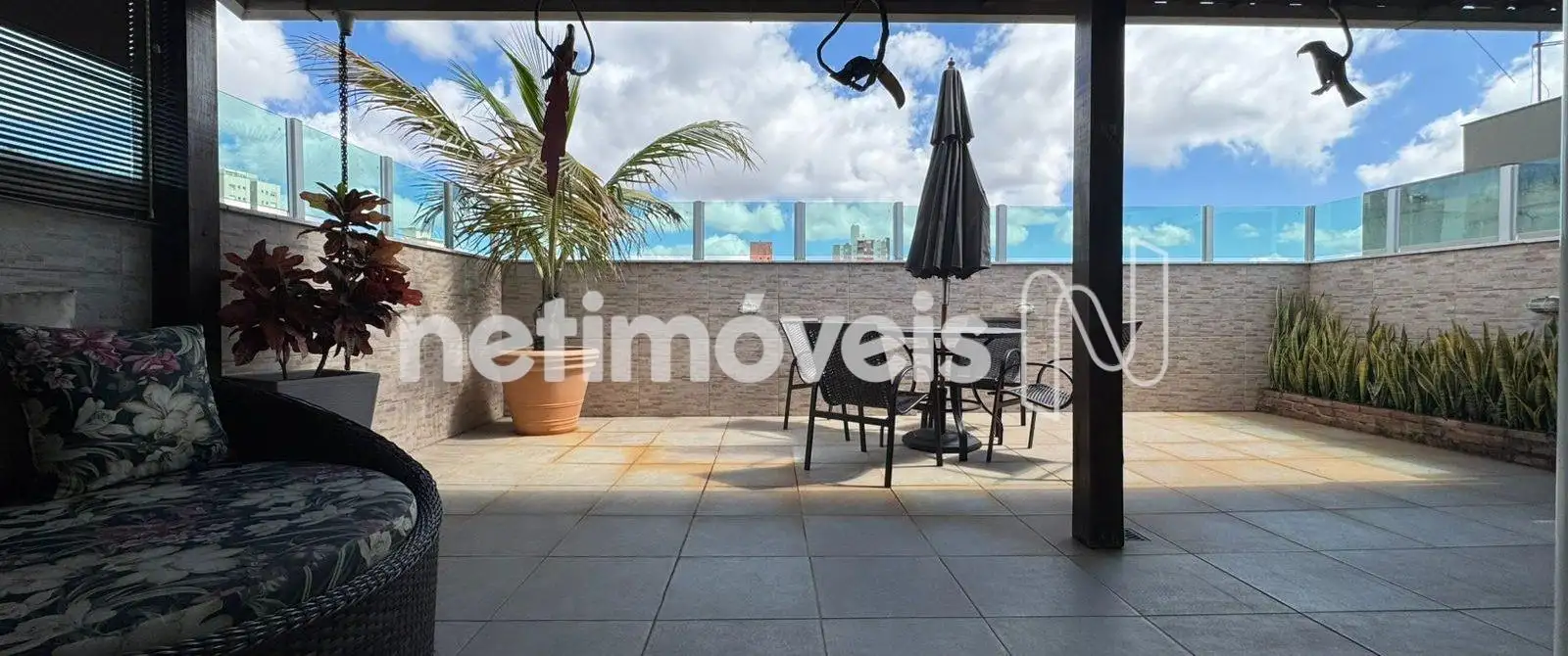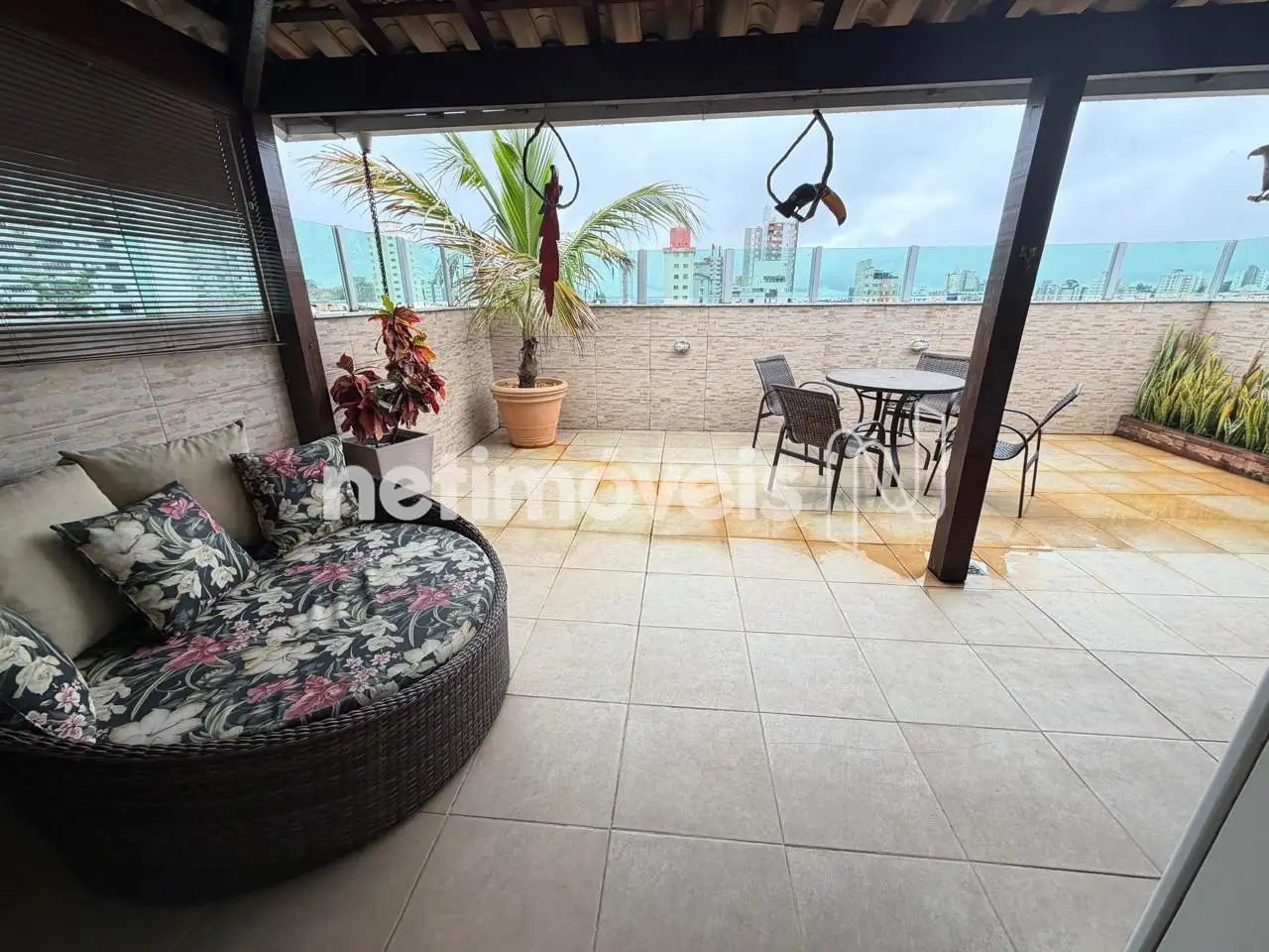 Área livre coberta com vista panorâmica de 180º, equipada com churrasqueira, , bancada em granito, armários, telhado colonial e fechamento em vidro blindex.