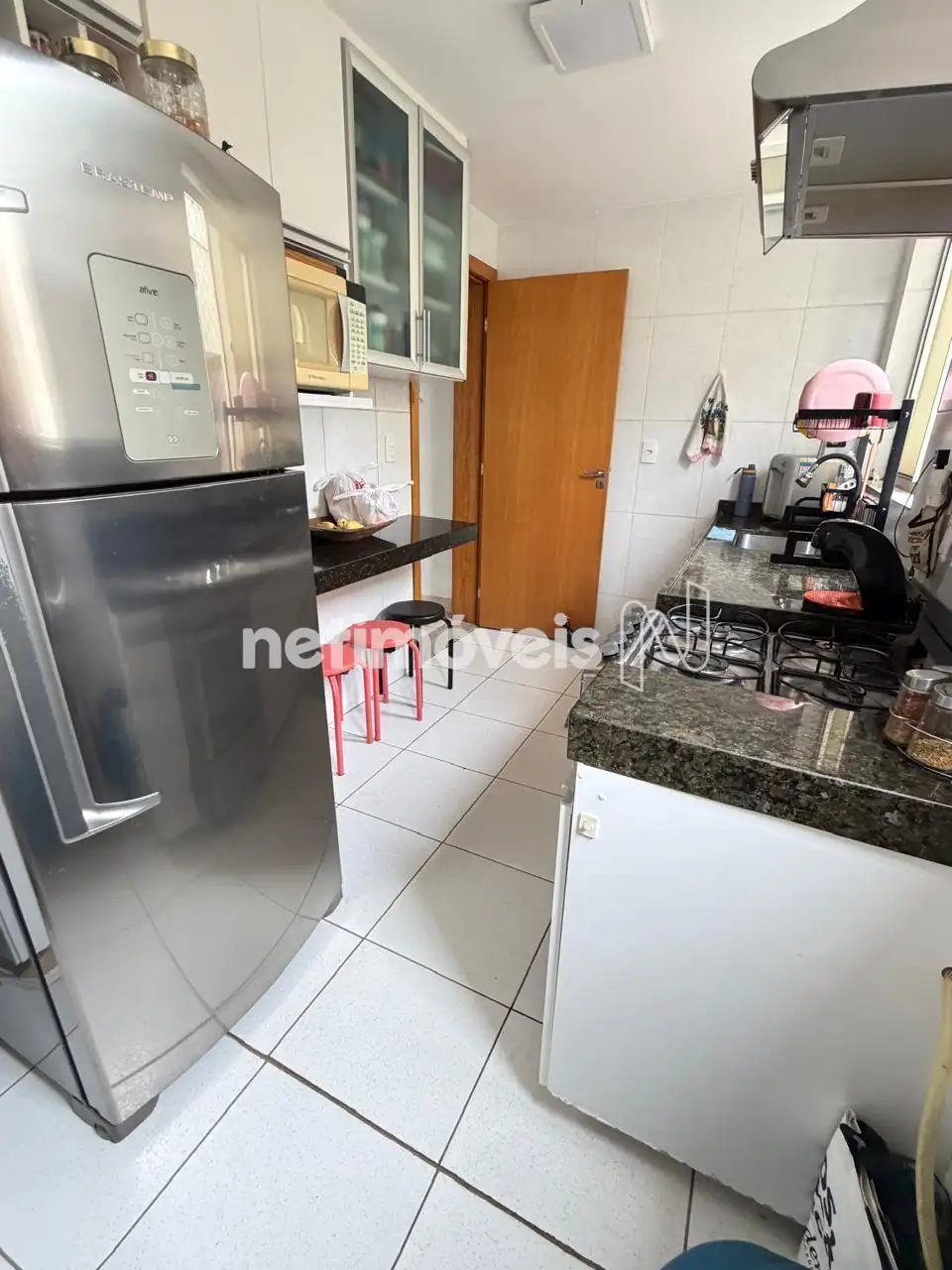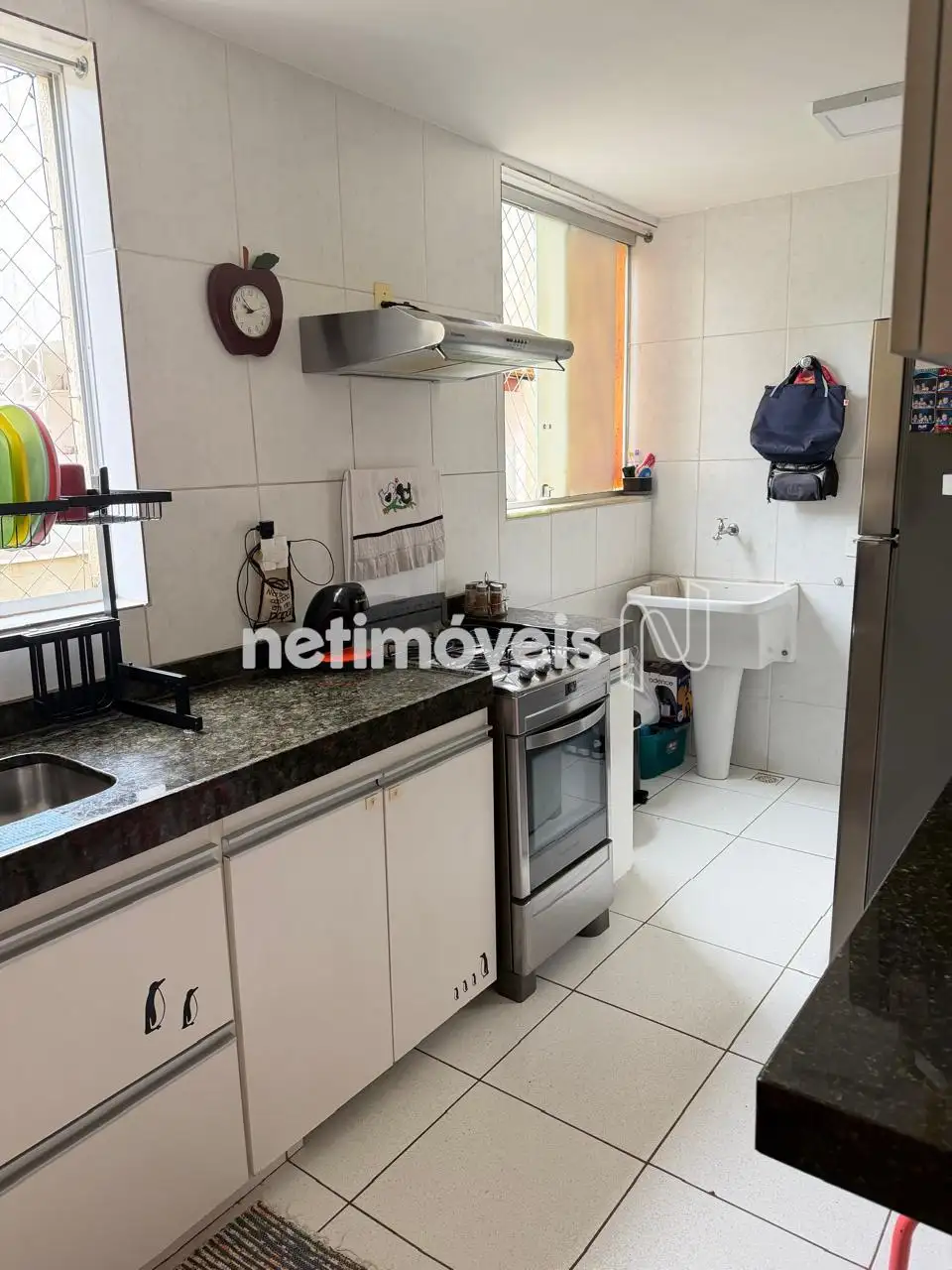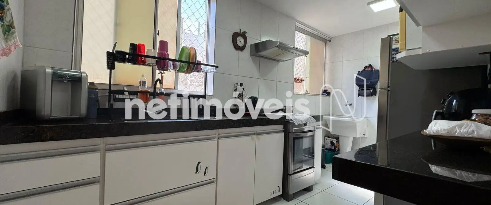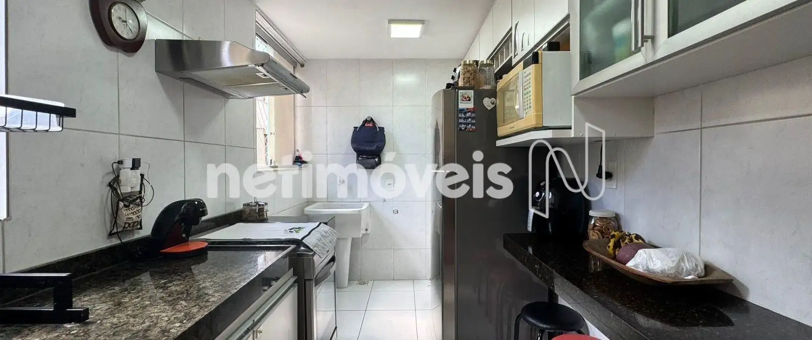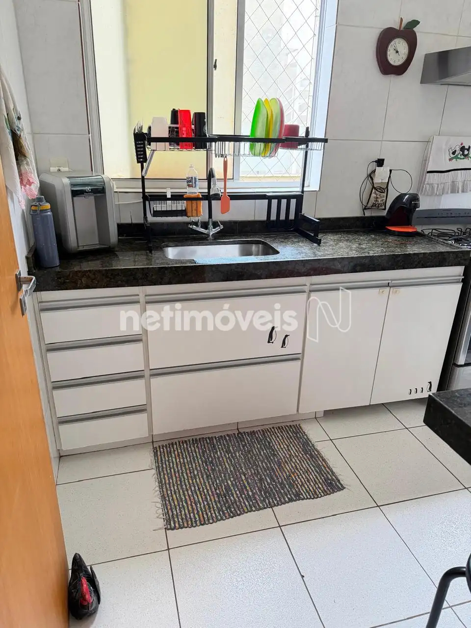 Cozinha com bancada em granito, armários sob a pia e piso em cerâmica.