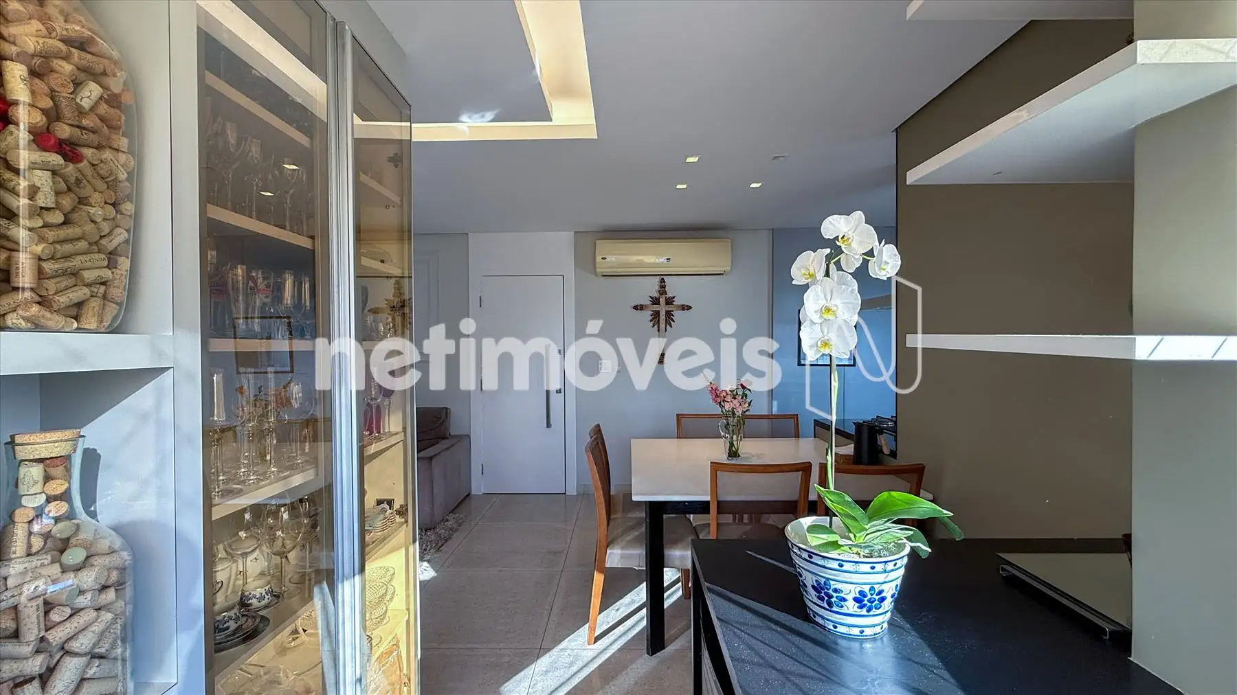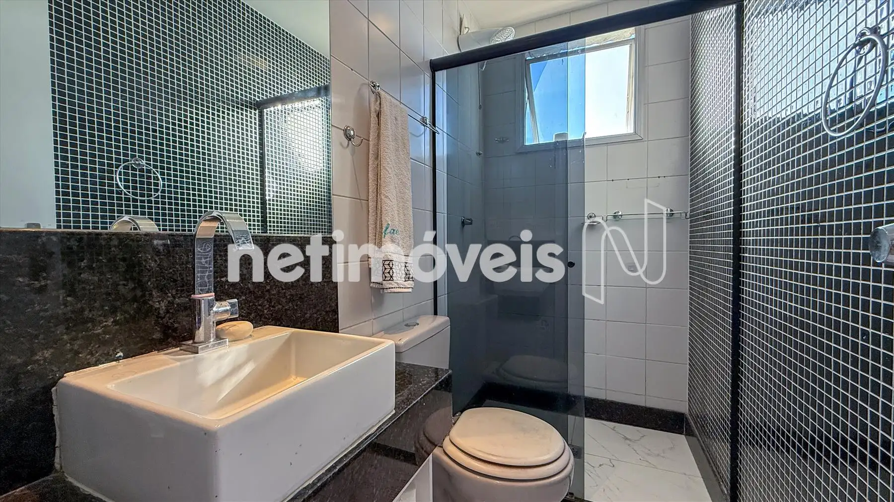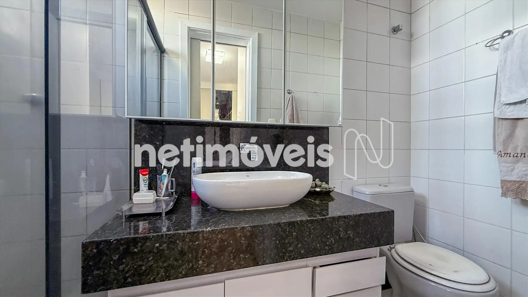 - Banhos social e suíte com pisos em porcelanato, bancadas em granito, armários, box em vidro temperado;