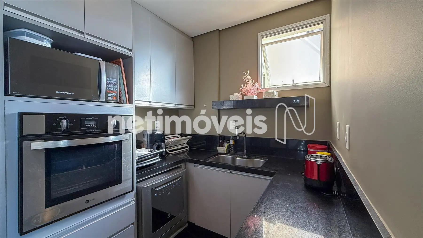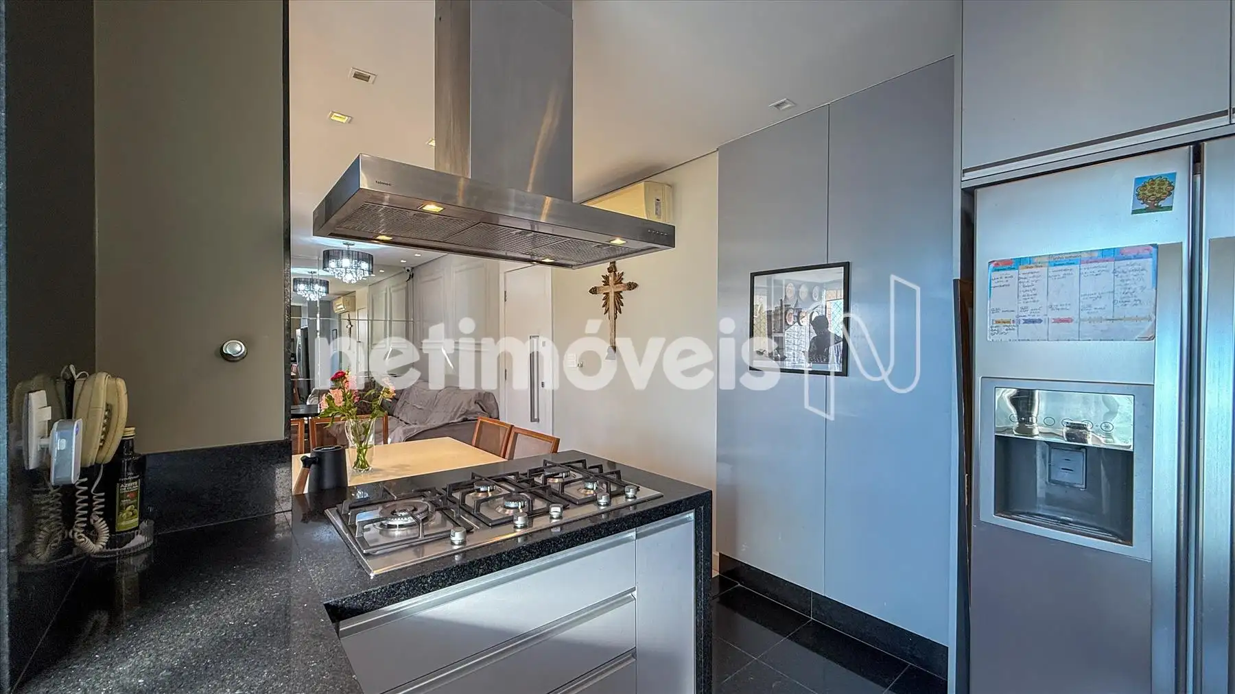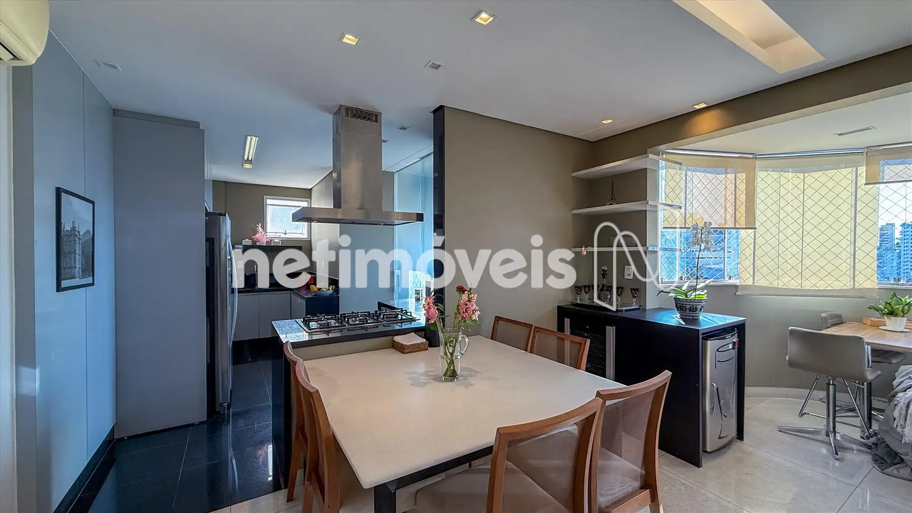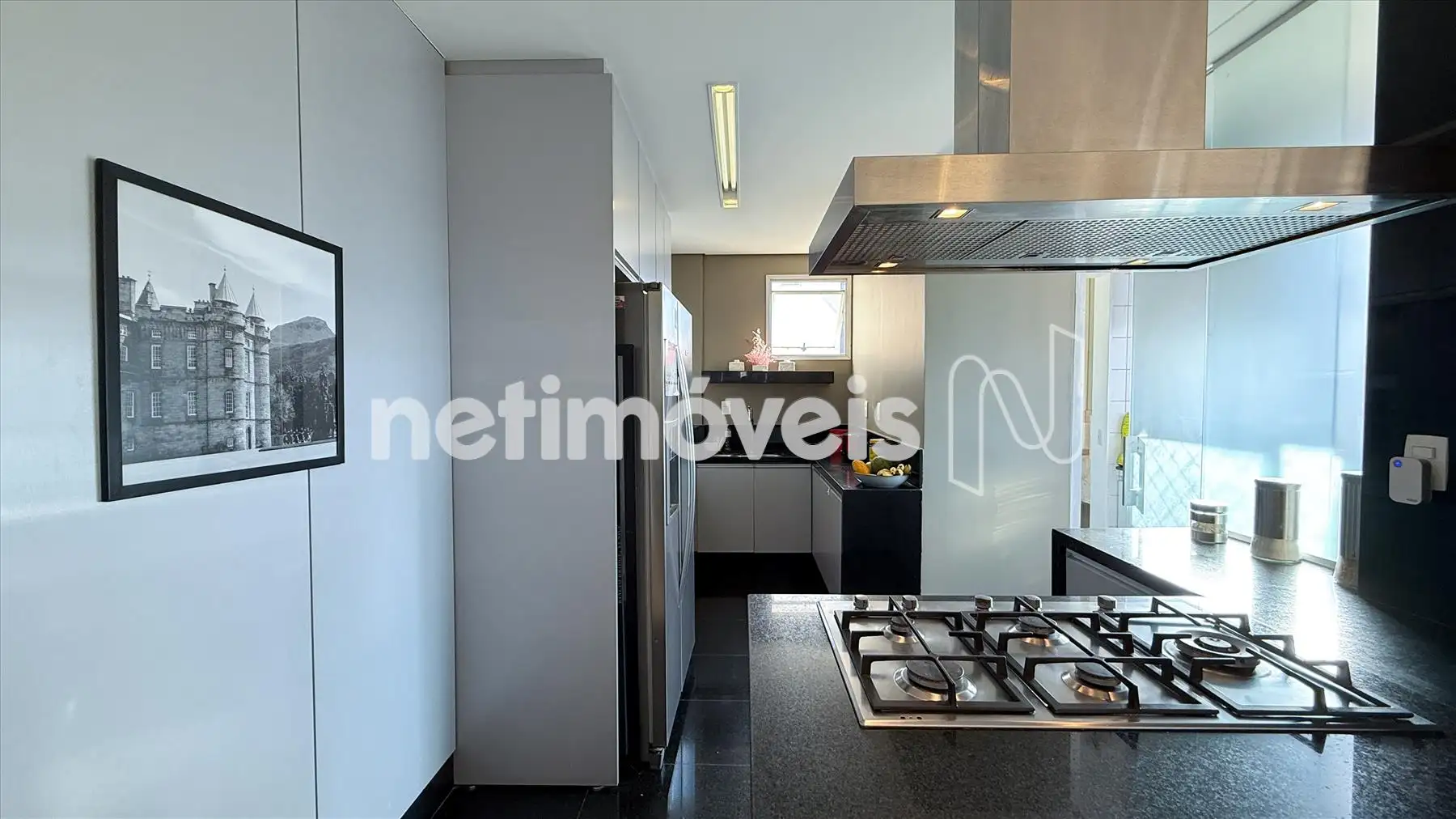 - Cozinha tipo americana com piso e bancada em granito preto, armários;