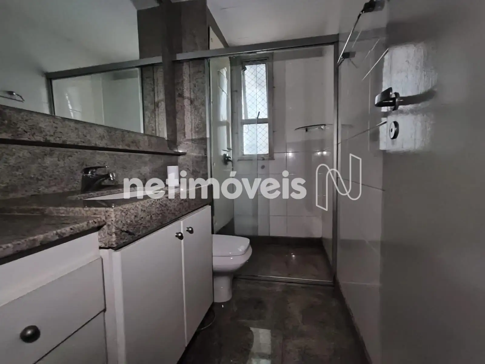 Banheiro social com piso e bancada em granito, armário, espelho, box em vidro temperado.