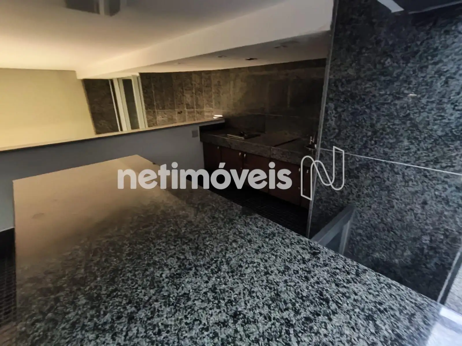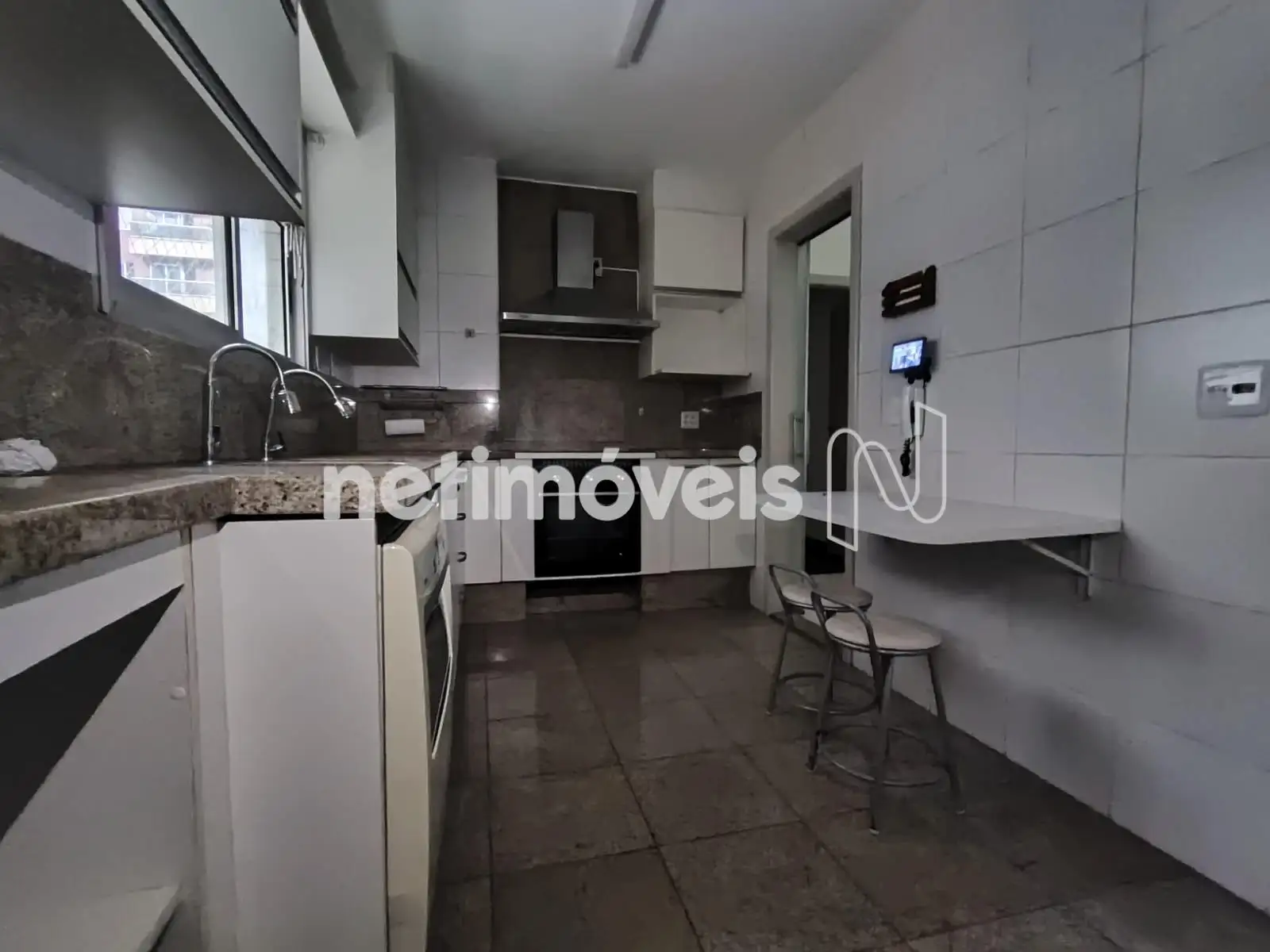 Cozinha com piso e bancadas em granito, armário sob a bancada.