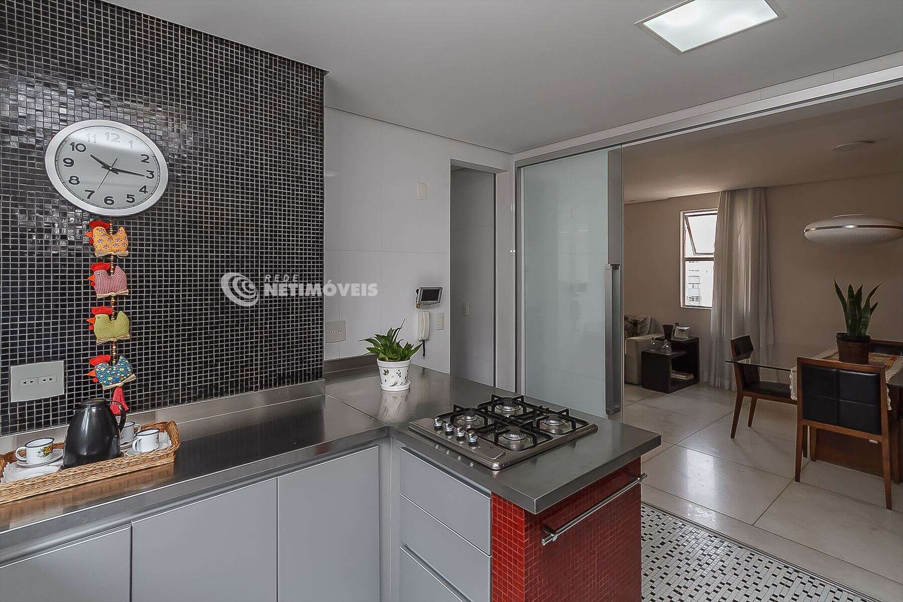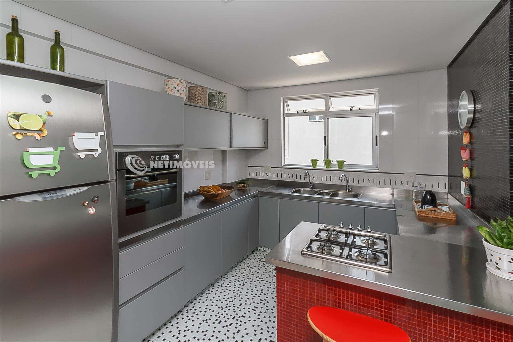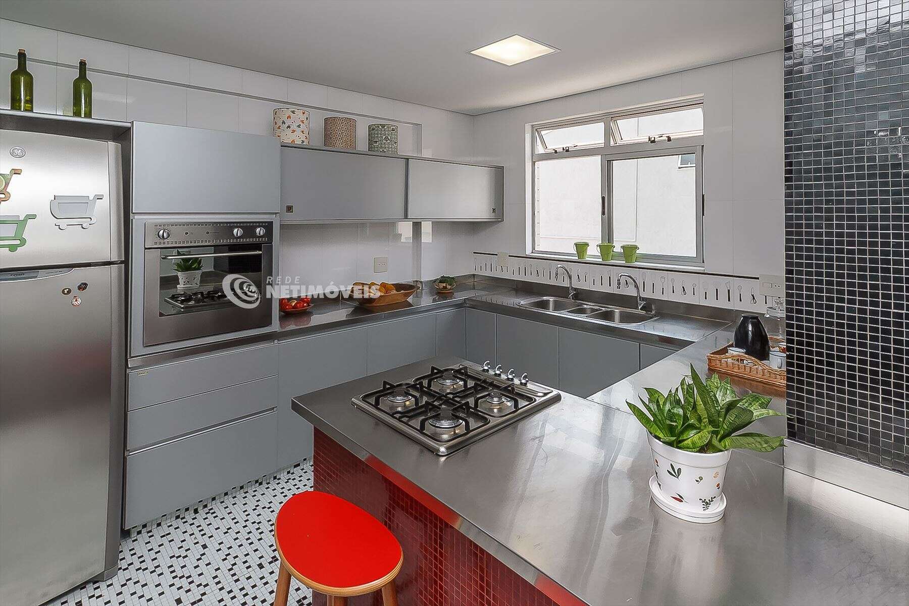 Linda cozinha com armários planejados da Cook, piso e paredes em pastilha, fogão em ilha. Pia e bancadas em alumínio.
