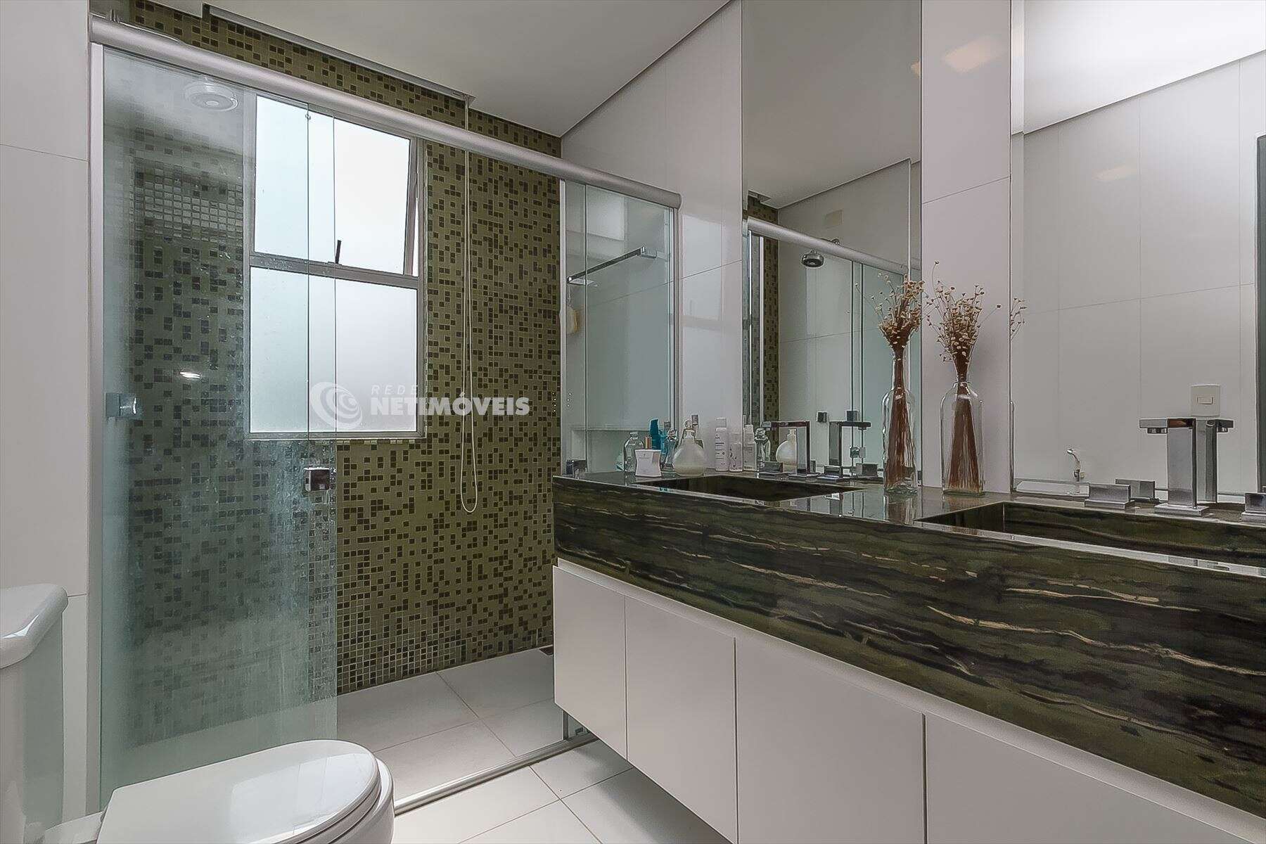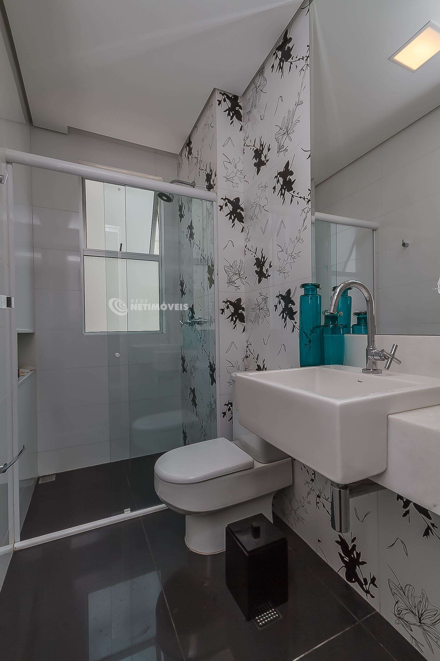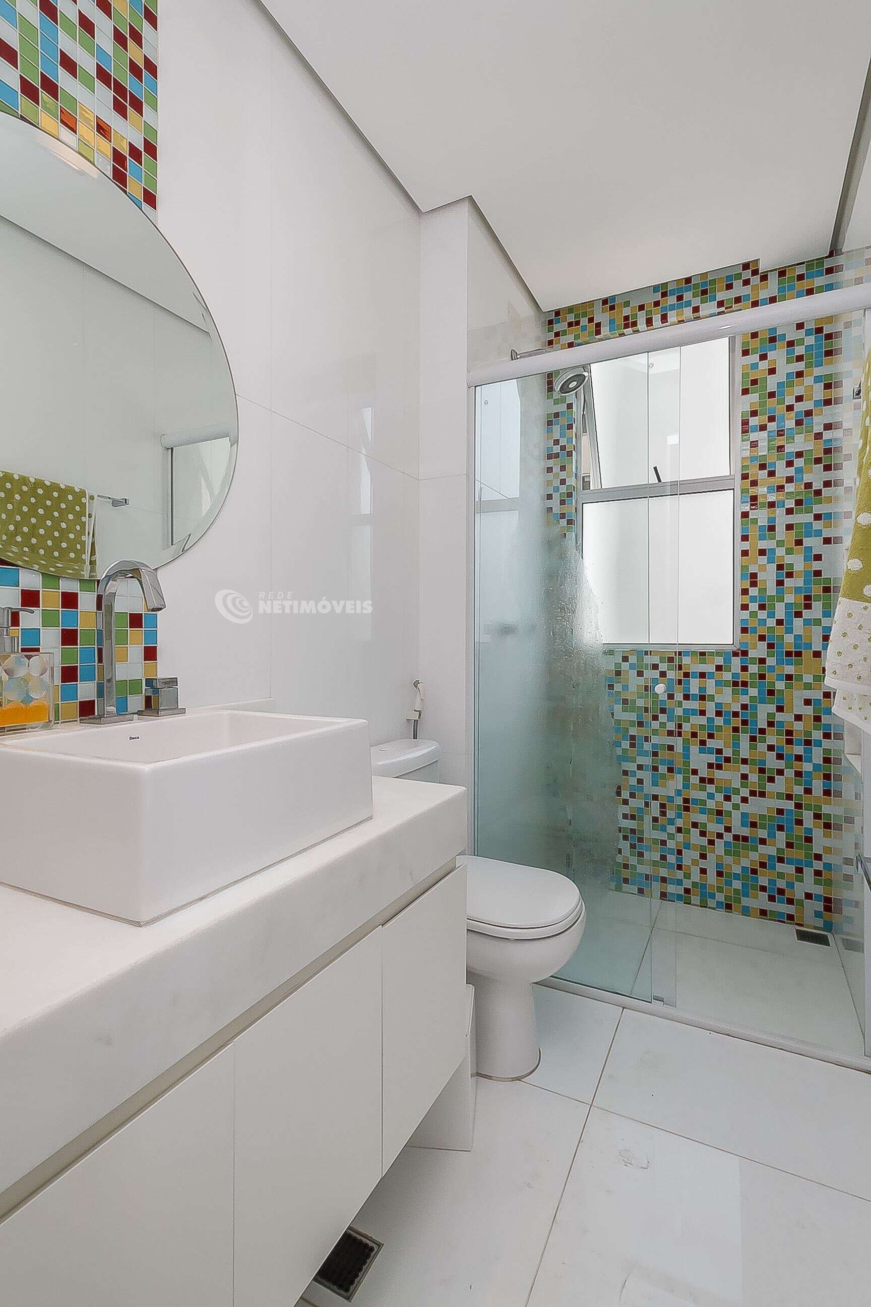 Banheiros decorados com pastilha e piso em porcelanato, armários sob a pia.