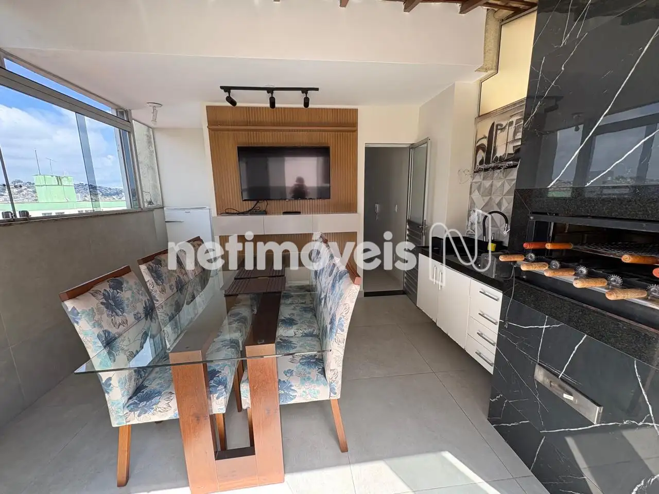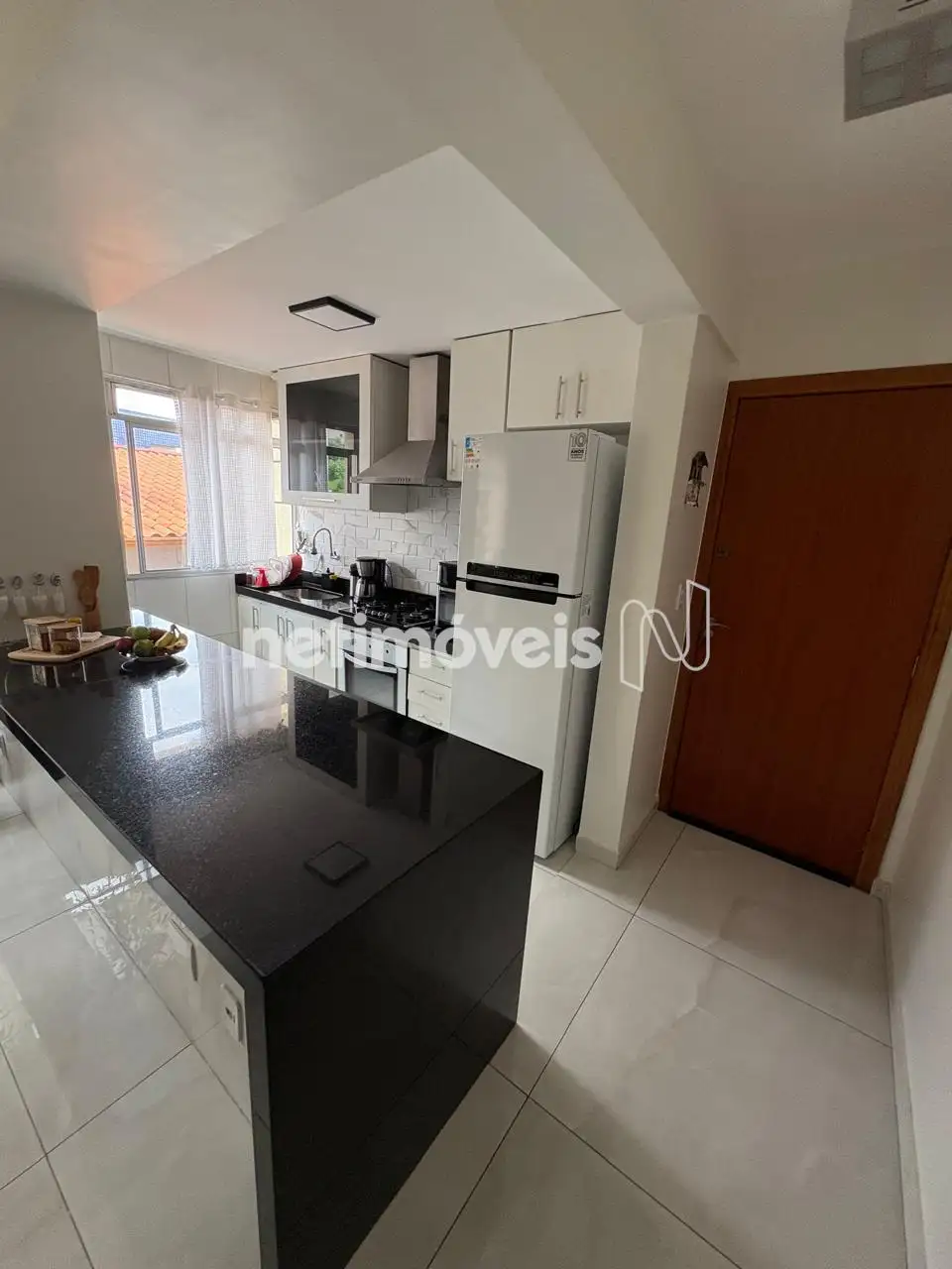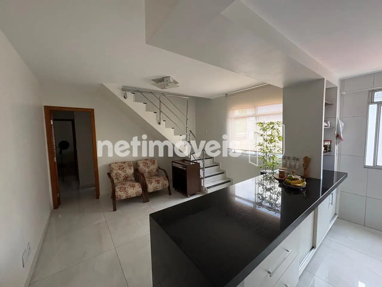 - Sala conjugada com cozinha em porcelanato e bancada em granito.