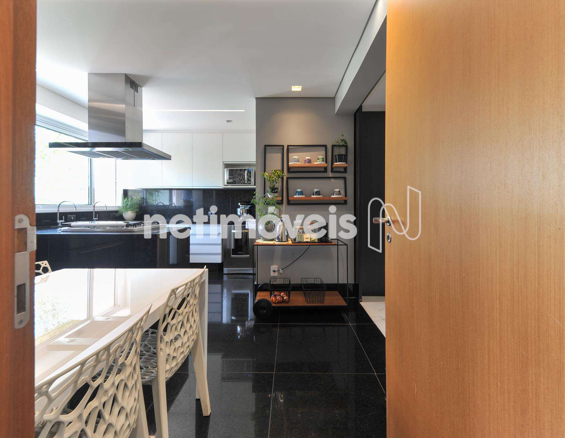 4 suítes, todas com armários e pisos em madeira, sendo a suíte master com hidromassagem; Cozinha com bancada e piso em granito na cor preto absoluto, armários planejados, despensa com piso em granito na cor preto absoluto;