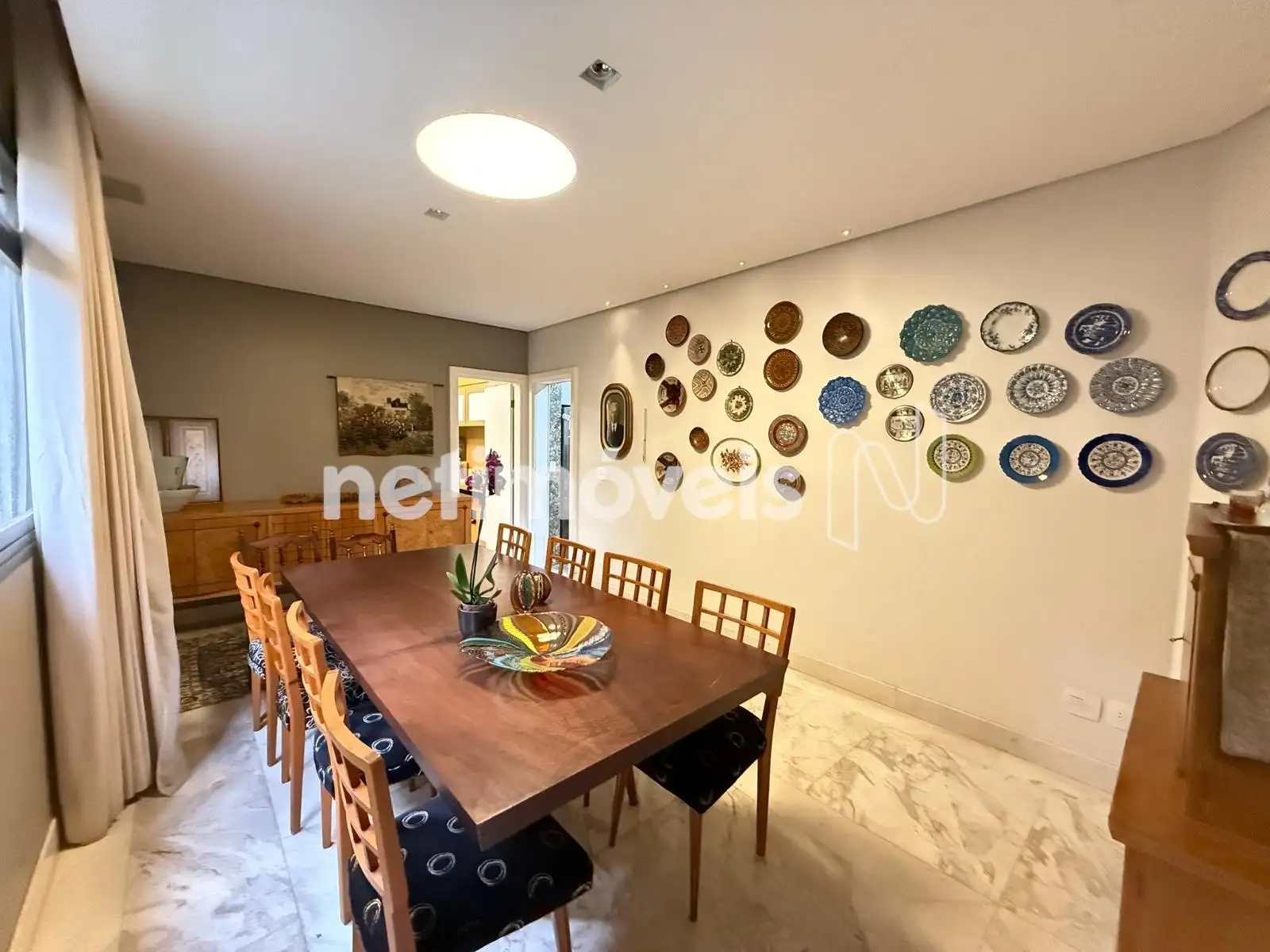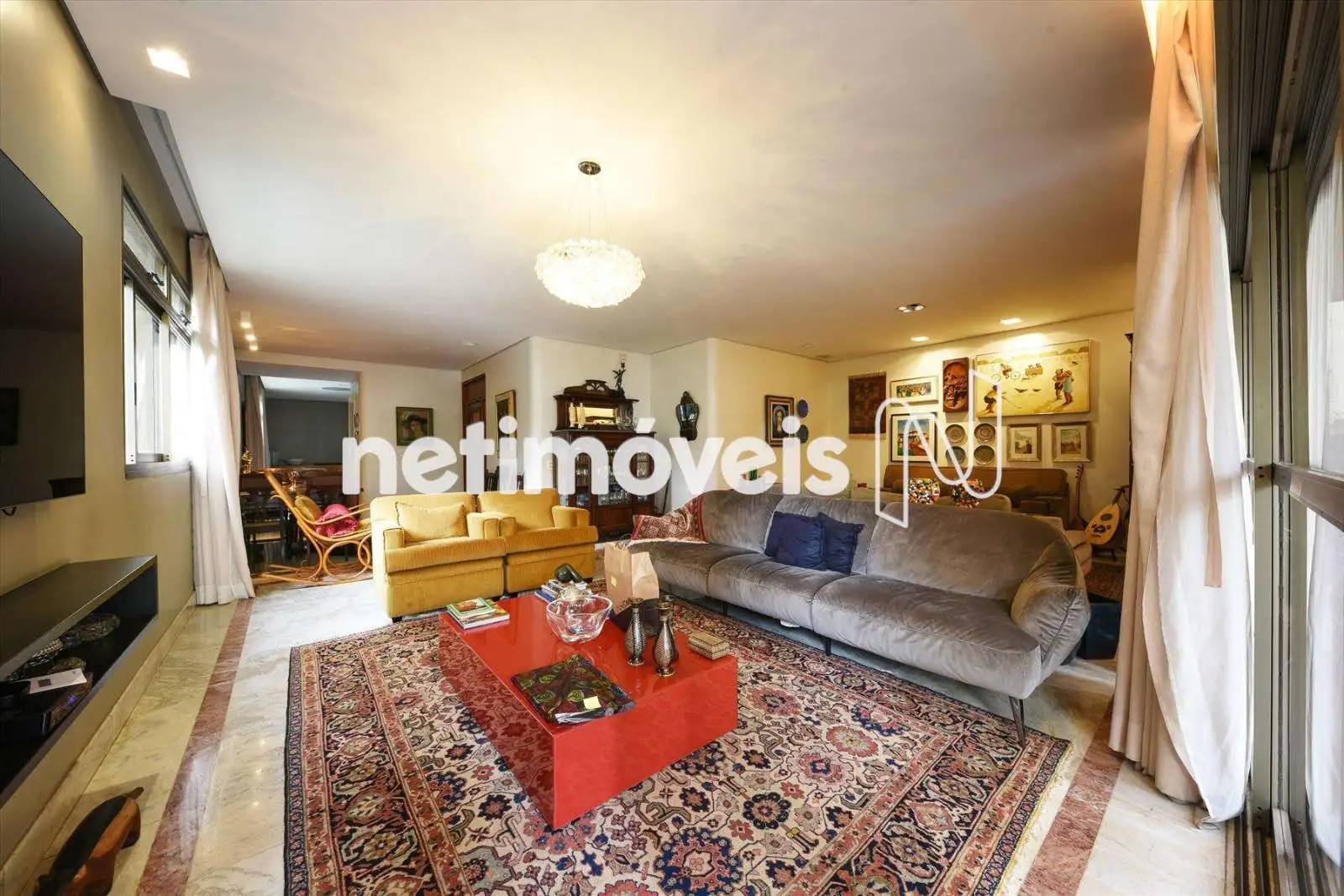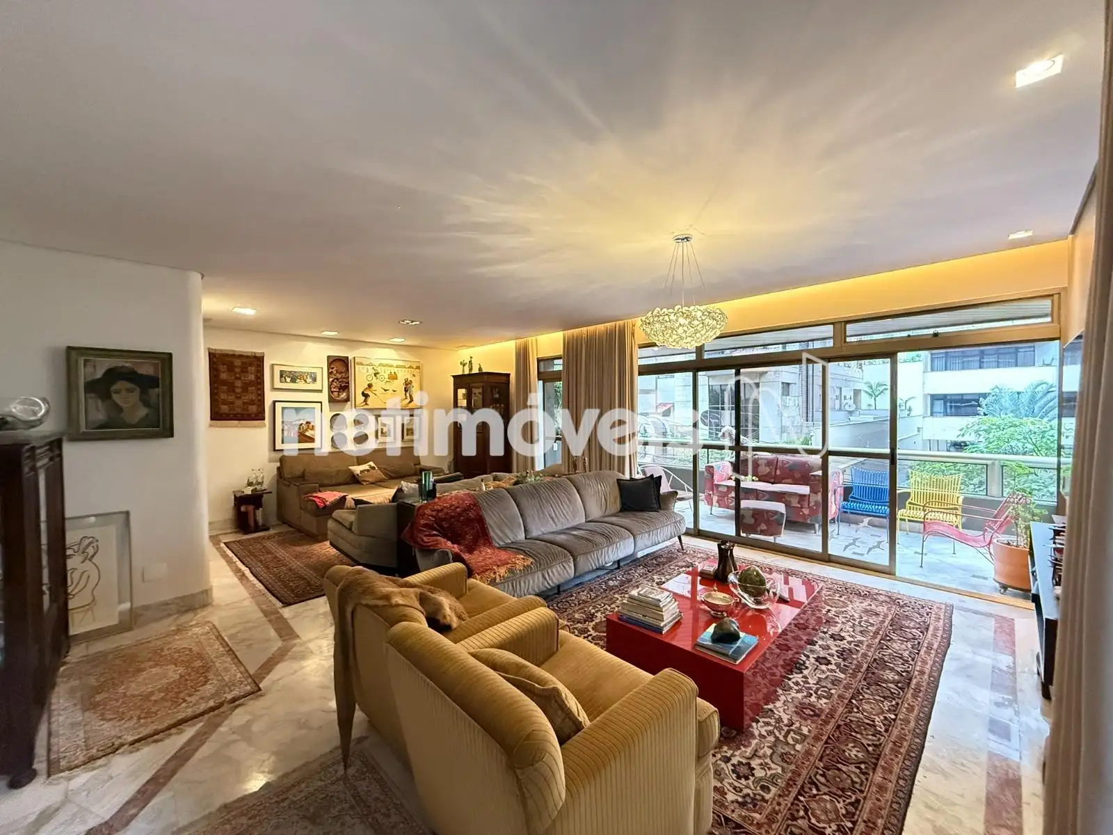 Sala em L para 3 ambientes com piso em mármore;