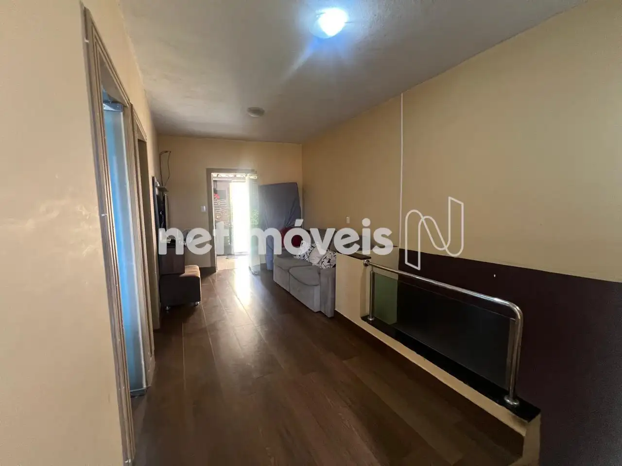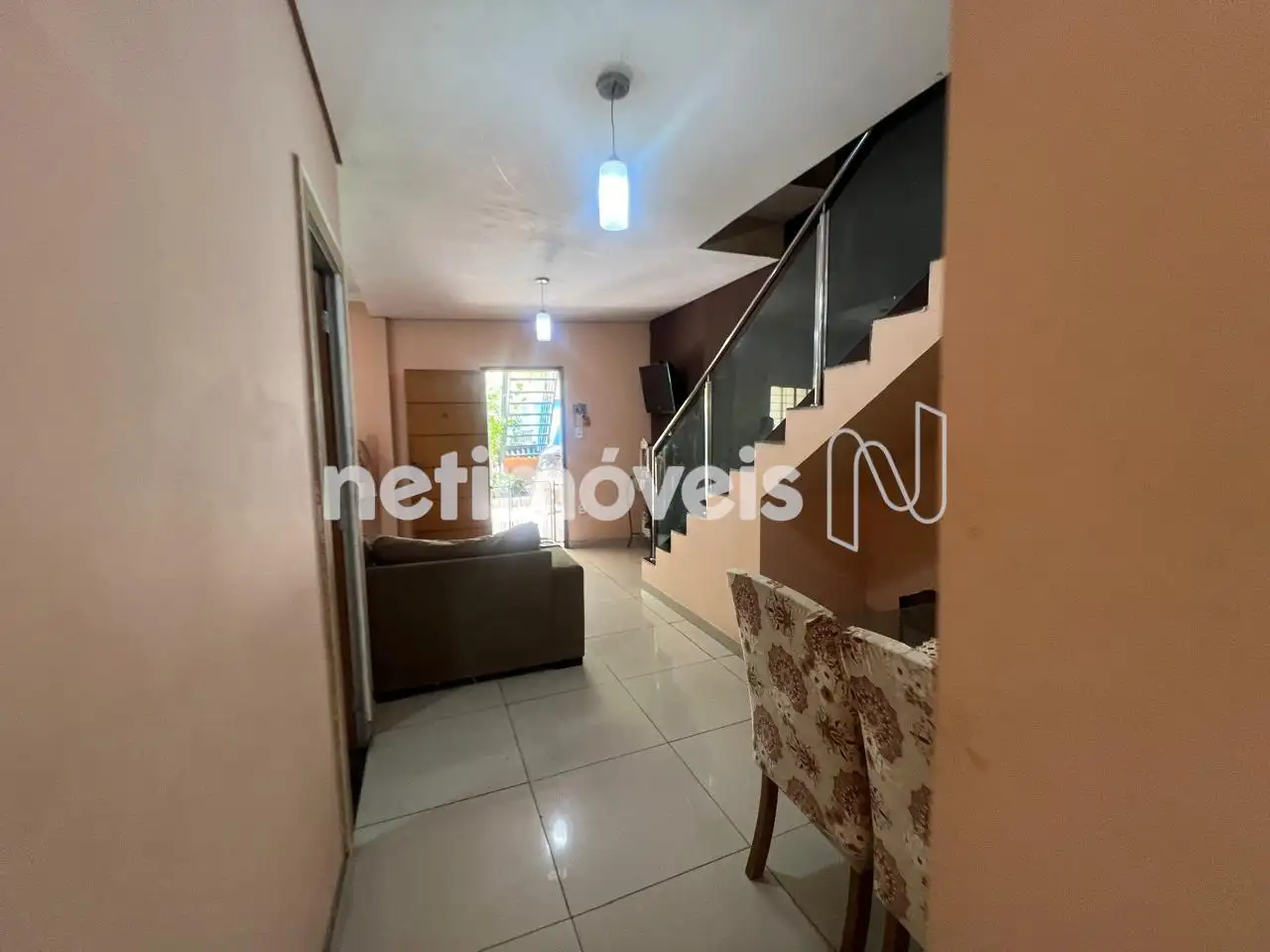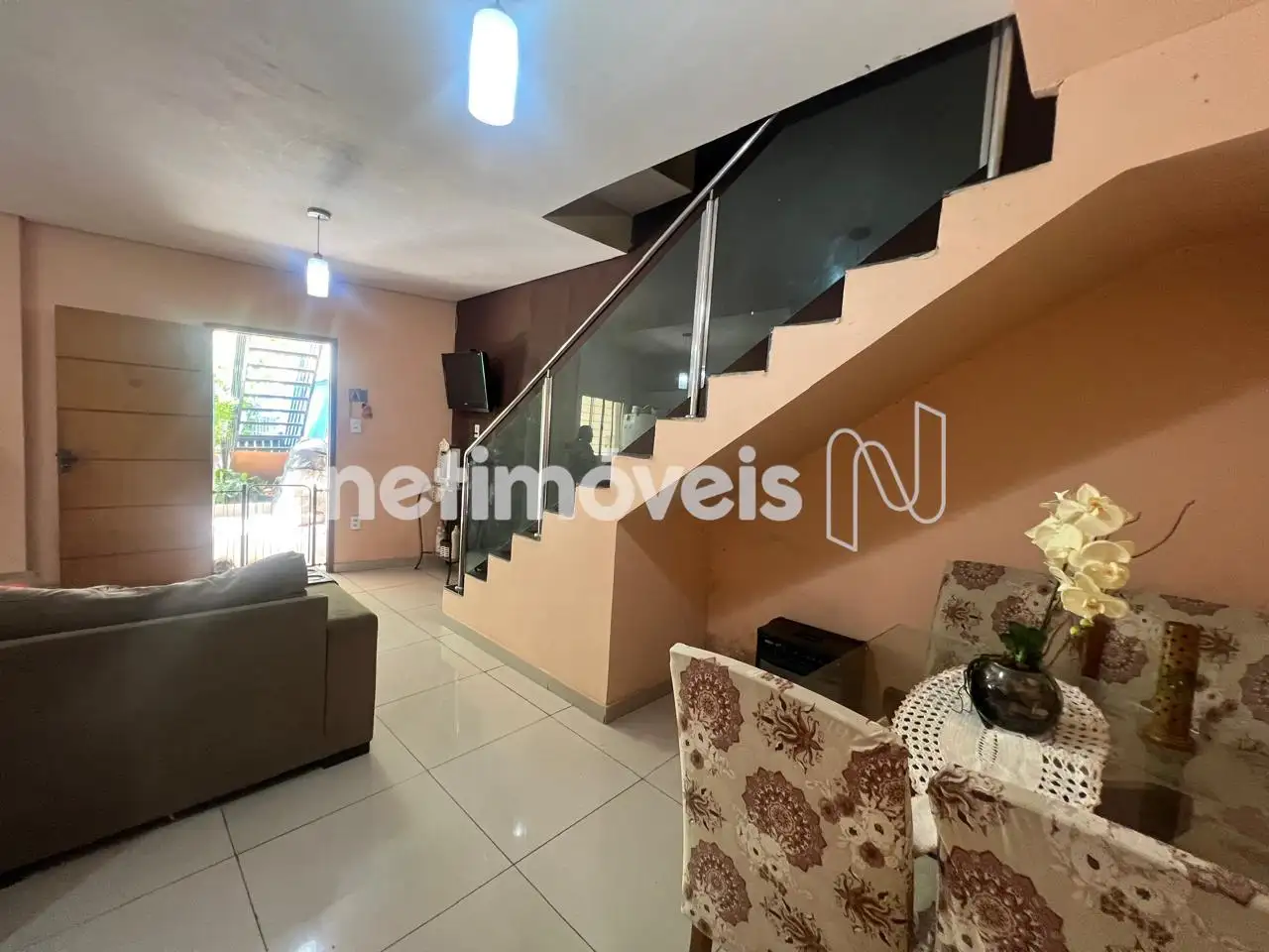 Sala de estar/TV espaçosa e varanda fechada. Tem uma escada que dá acesso à parte externa da casa.