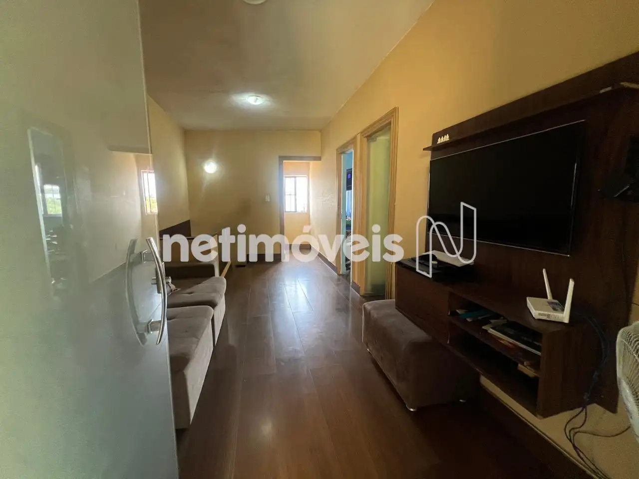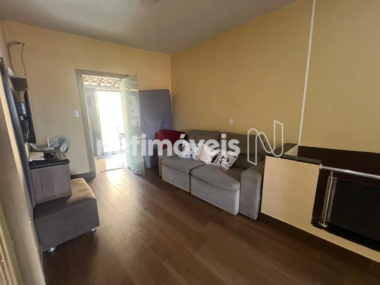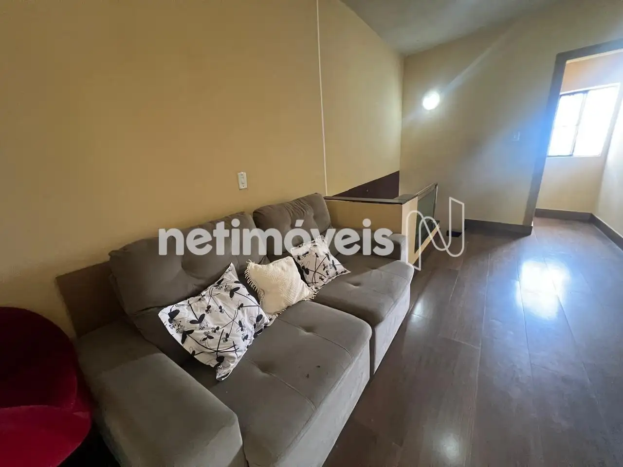 Sala de estar/TV espaçosa e varanda fechada. Tem uma escada que dá acesso à parte externa da casa.