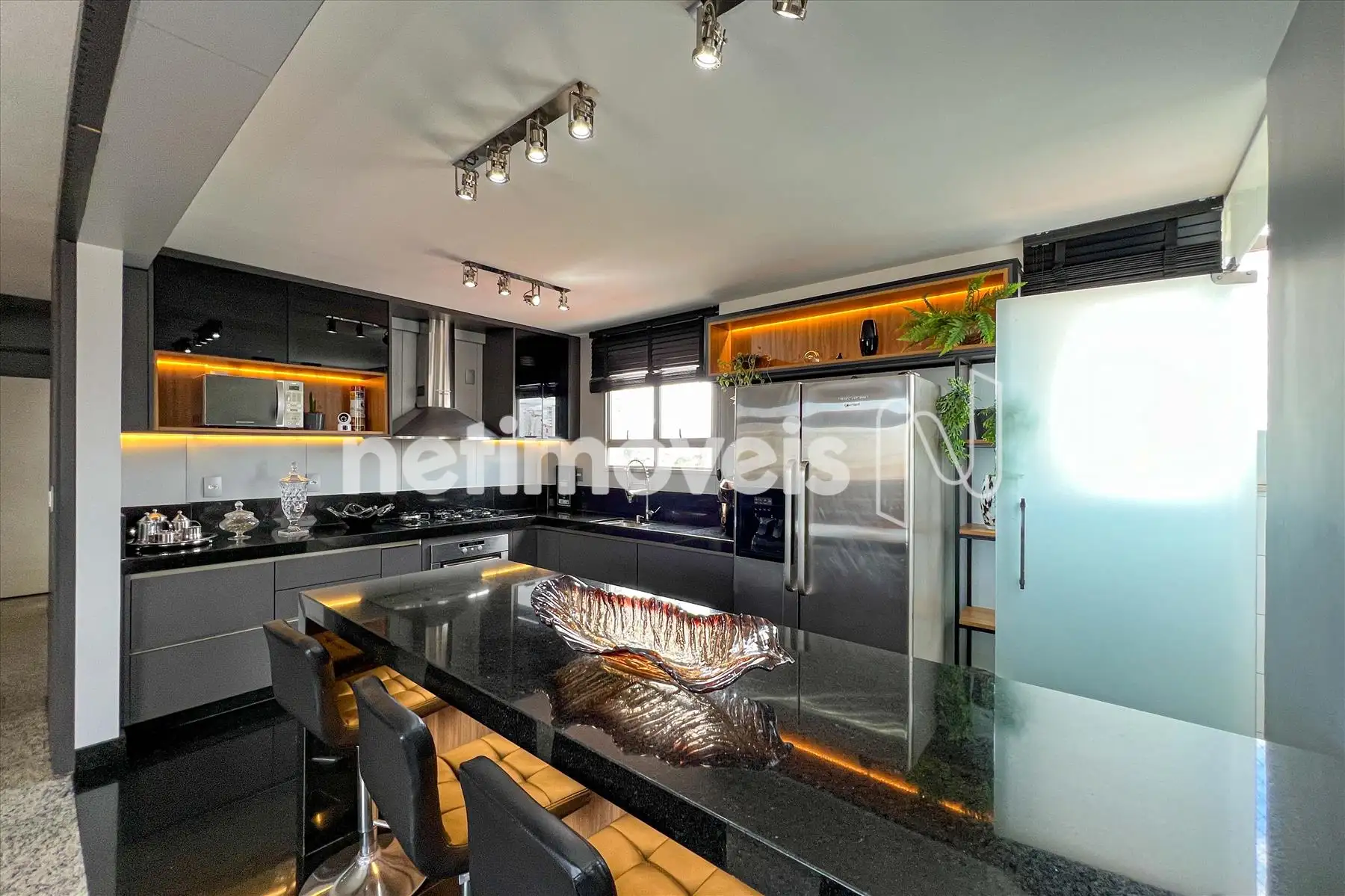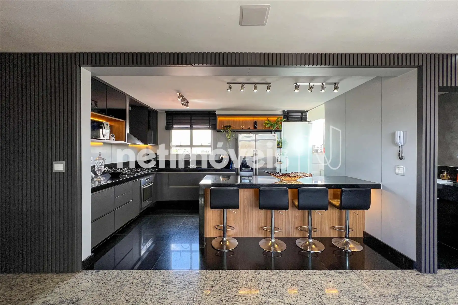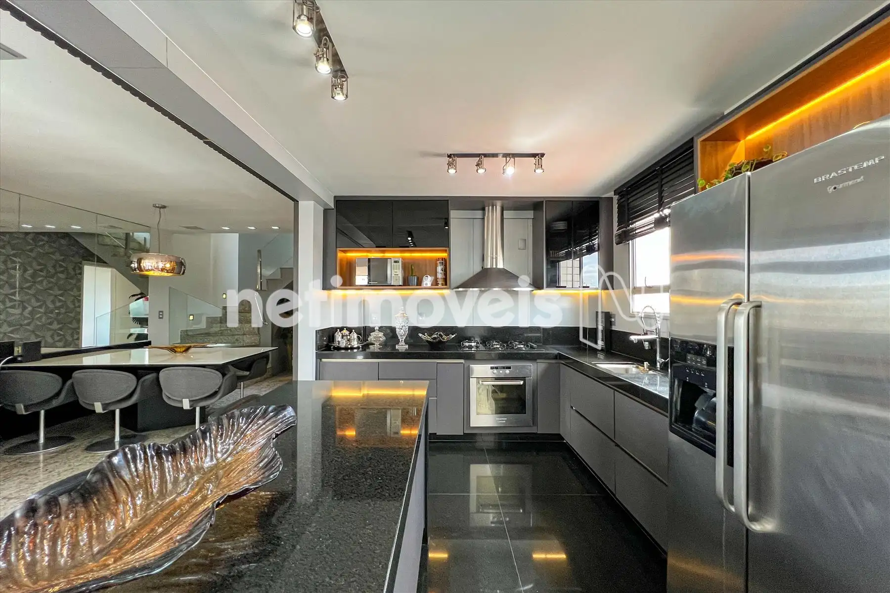 - Cozinha americana com piso e bancada em granito, montada com armários planejados , exaustor, fogão cooktop, forno, microondas e geladeira;