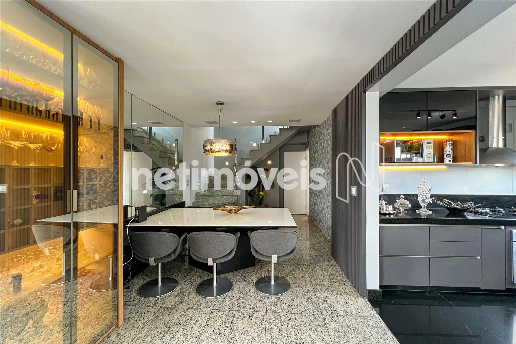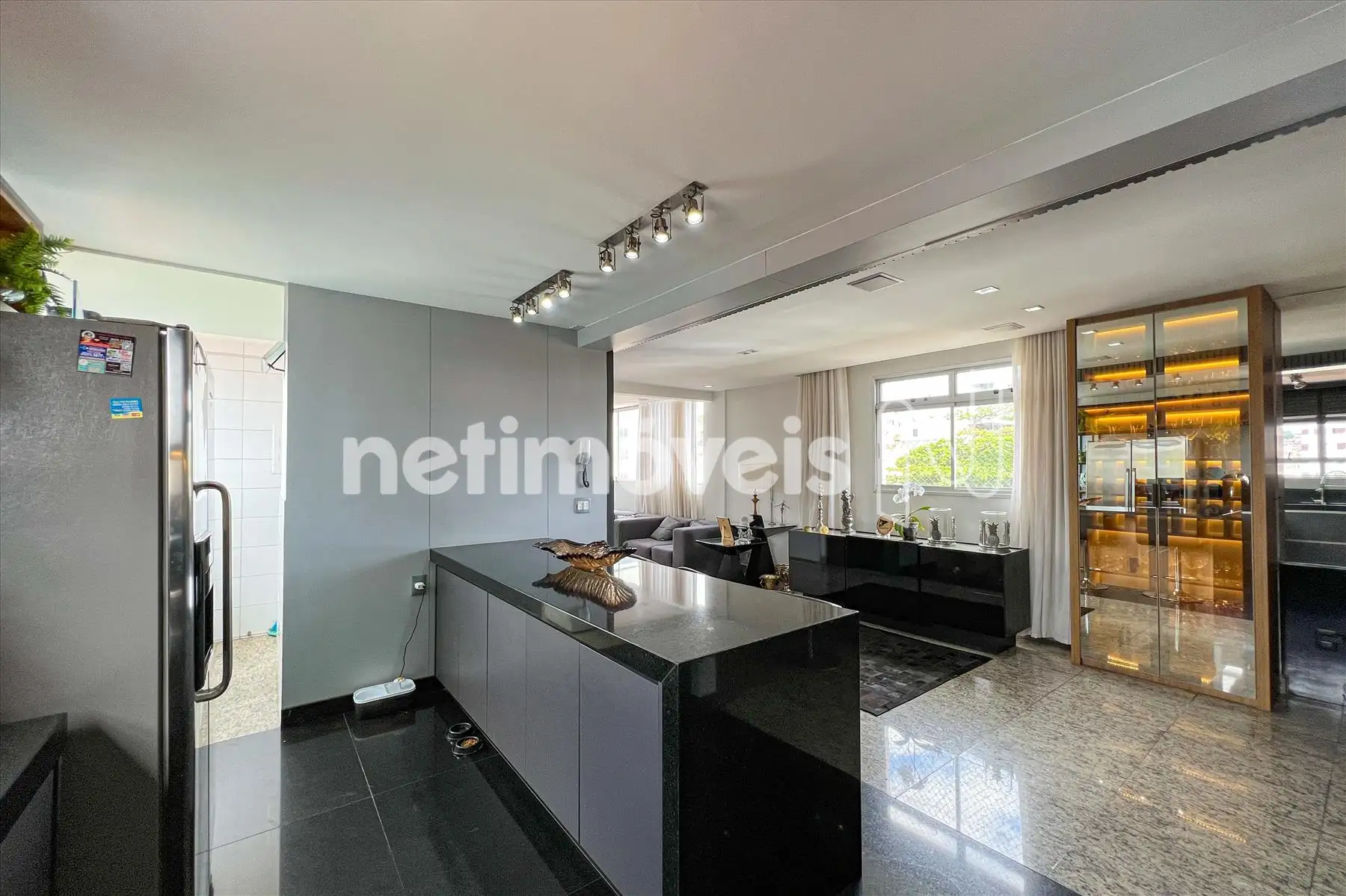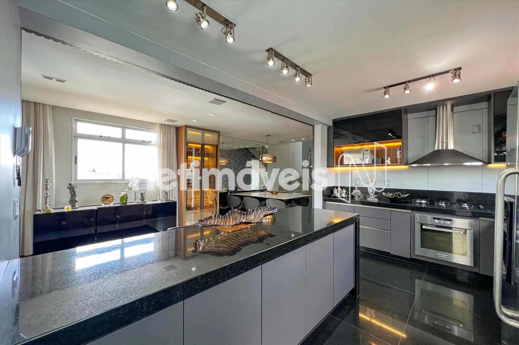 - Cozinha americana com piso e bancada em granito, montada com armários planejados , exaustor, fogão cooktop, forno, microondas e geladeira;