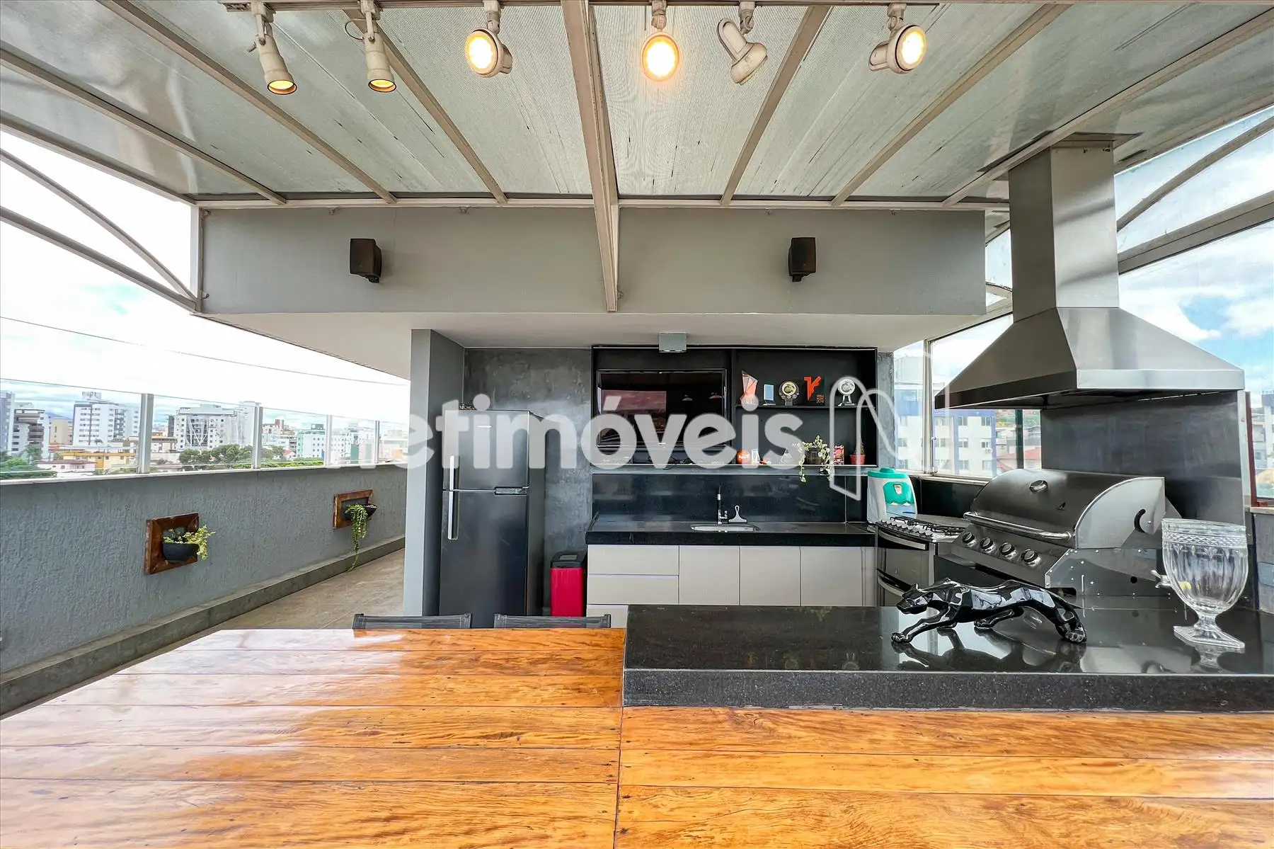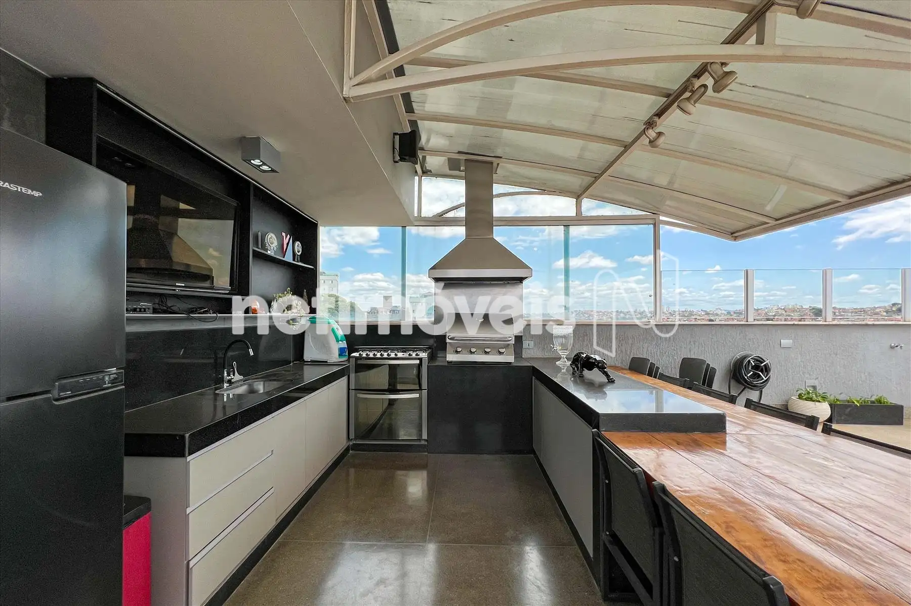 - Lindo espaço gourmet com piso em granilite, pia com bancada em granito , rica em armários planejados, fogão, forno, exaustor e churrasqueira;