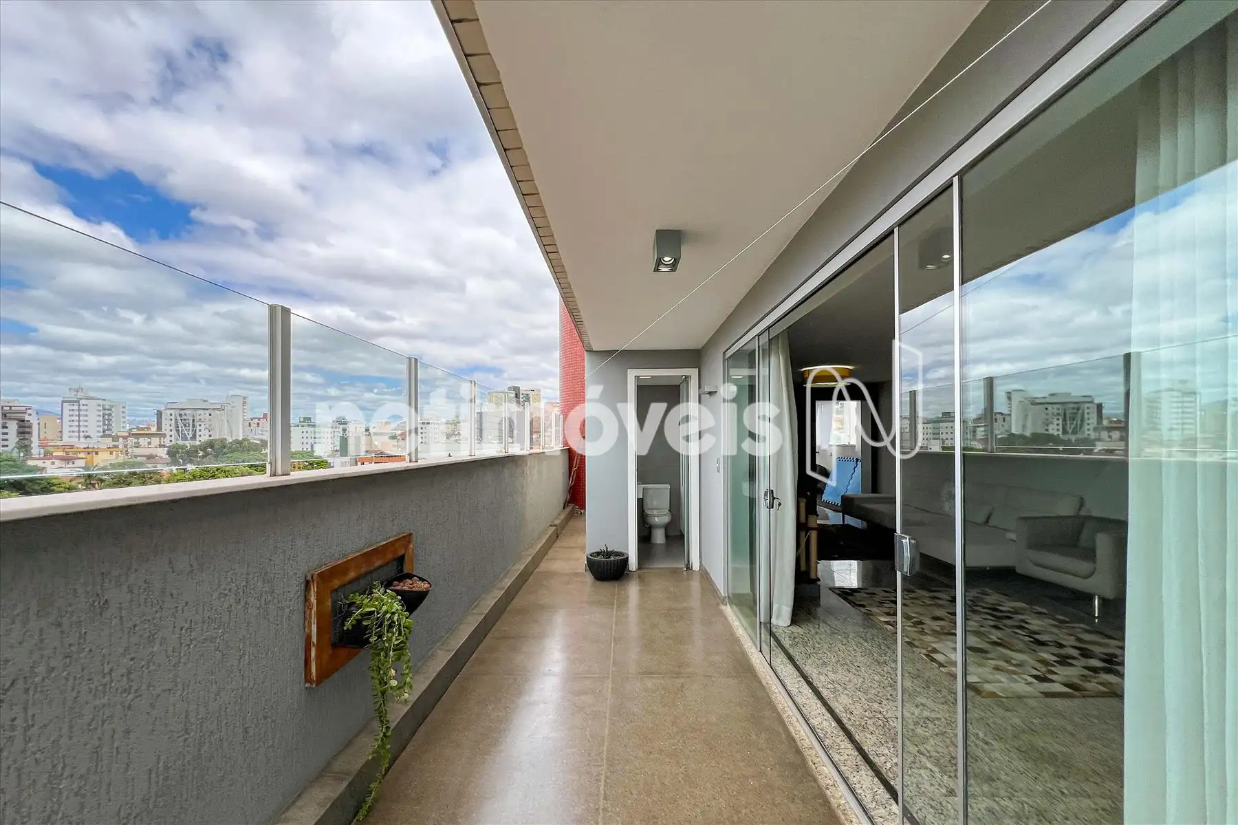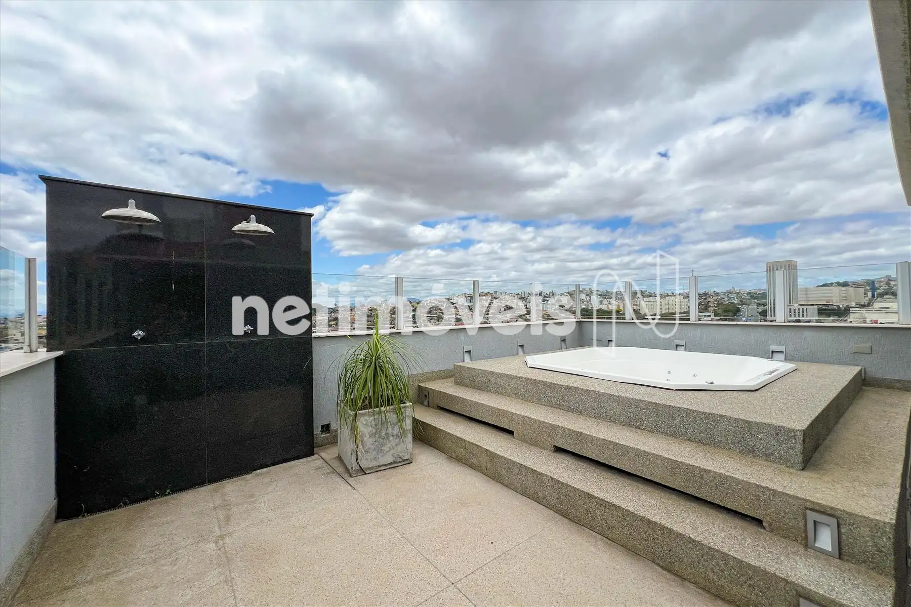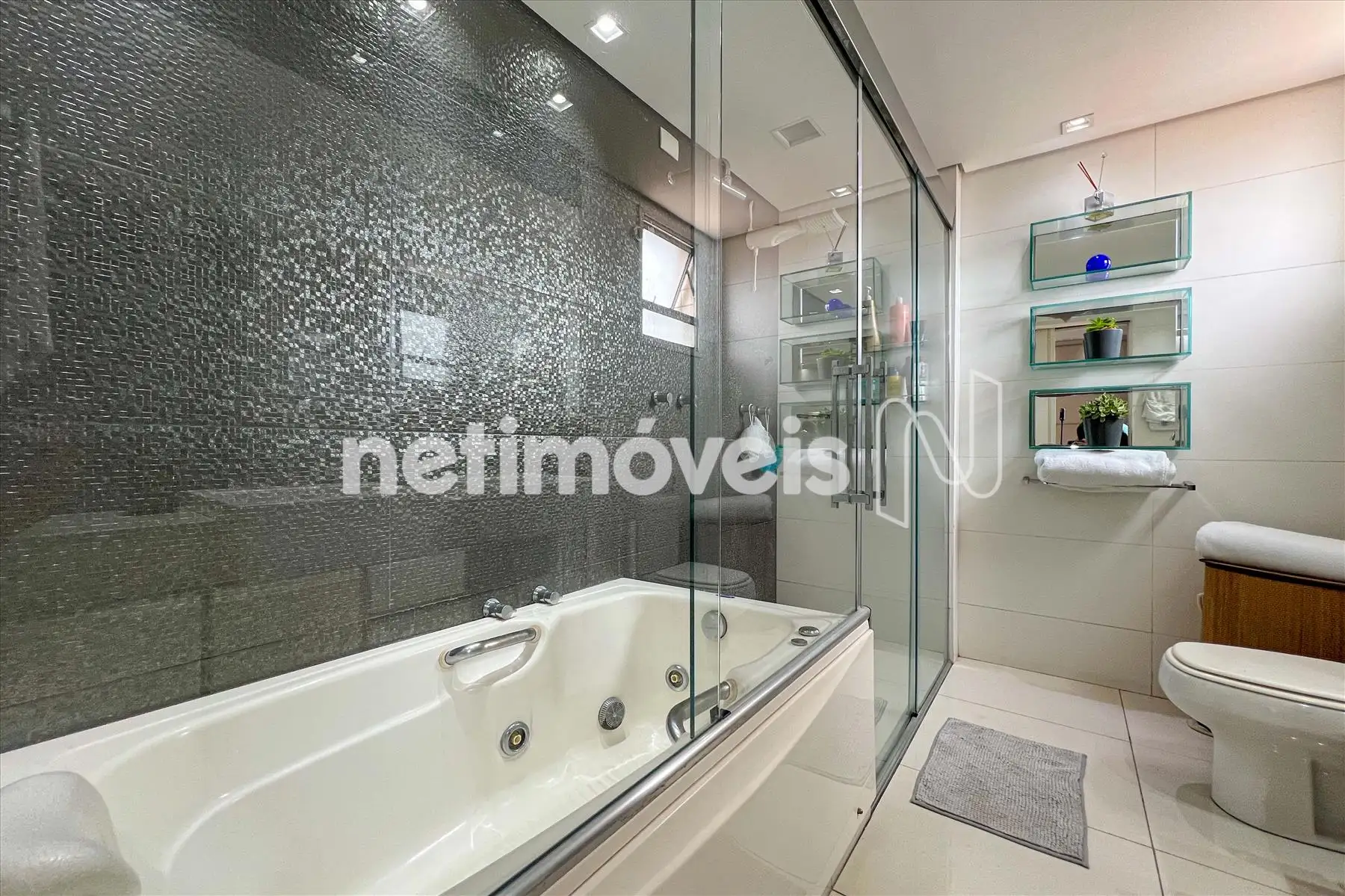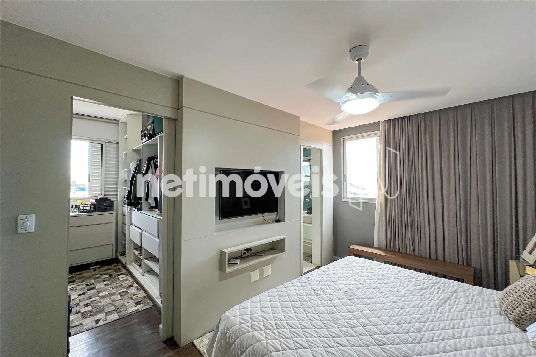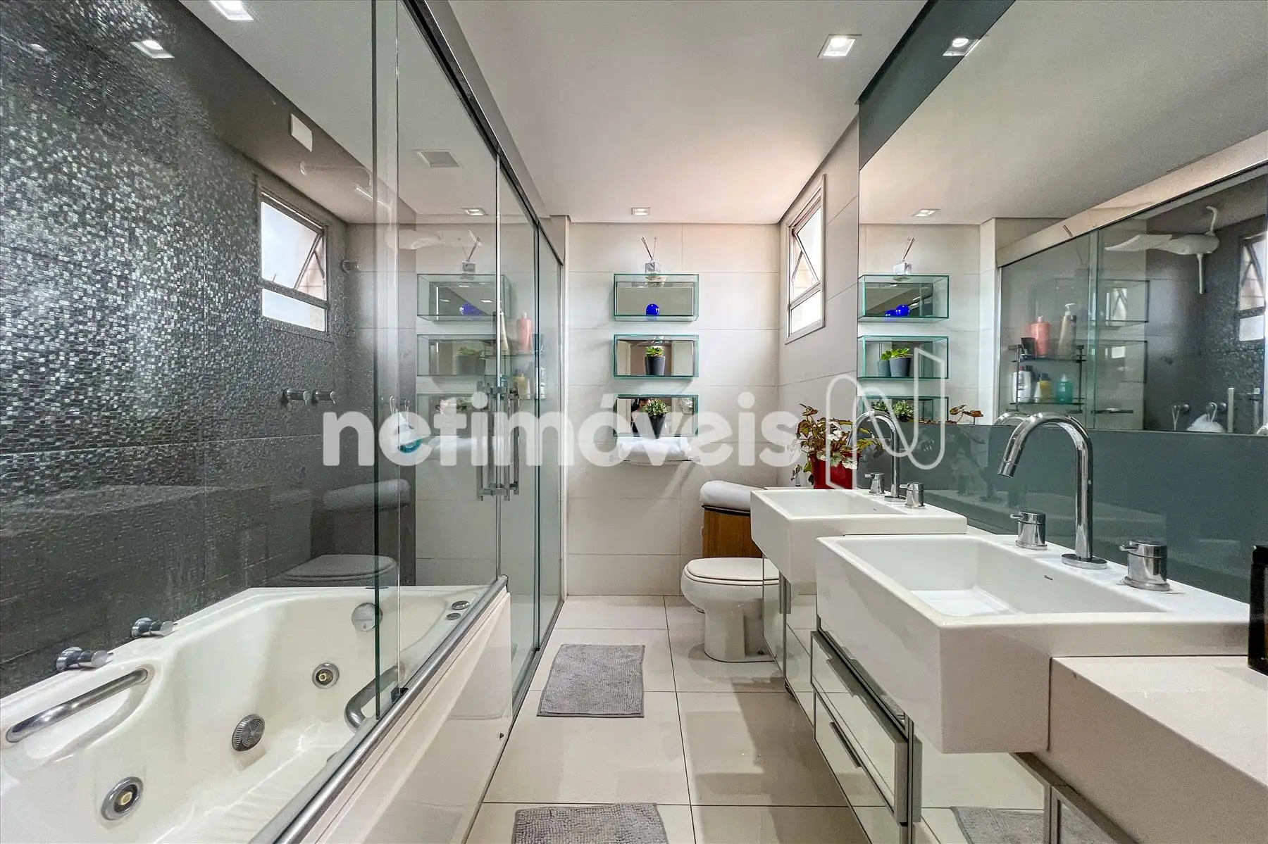 - Suíte master com piso em porcelanato, pia com bancada em nano glass, hidro e box em vidro temperado;
