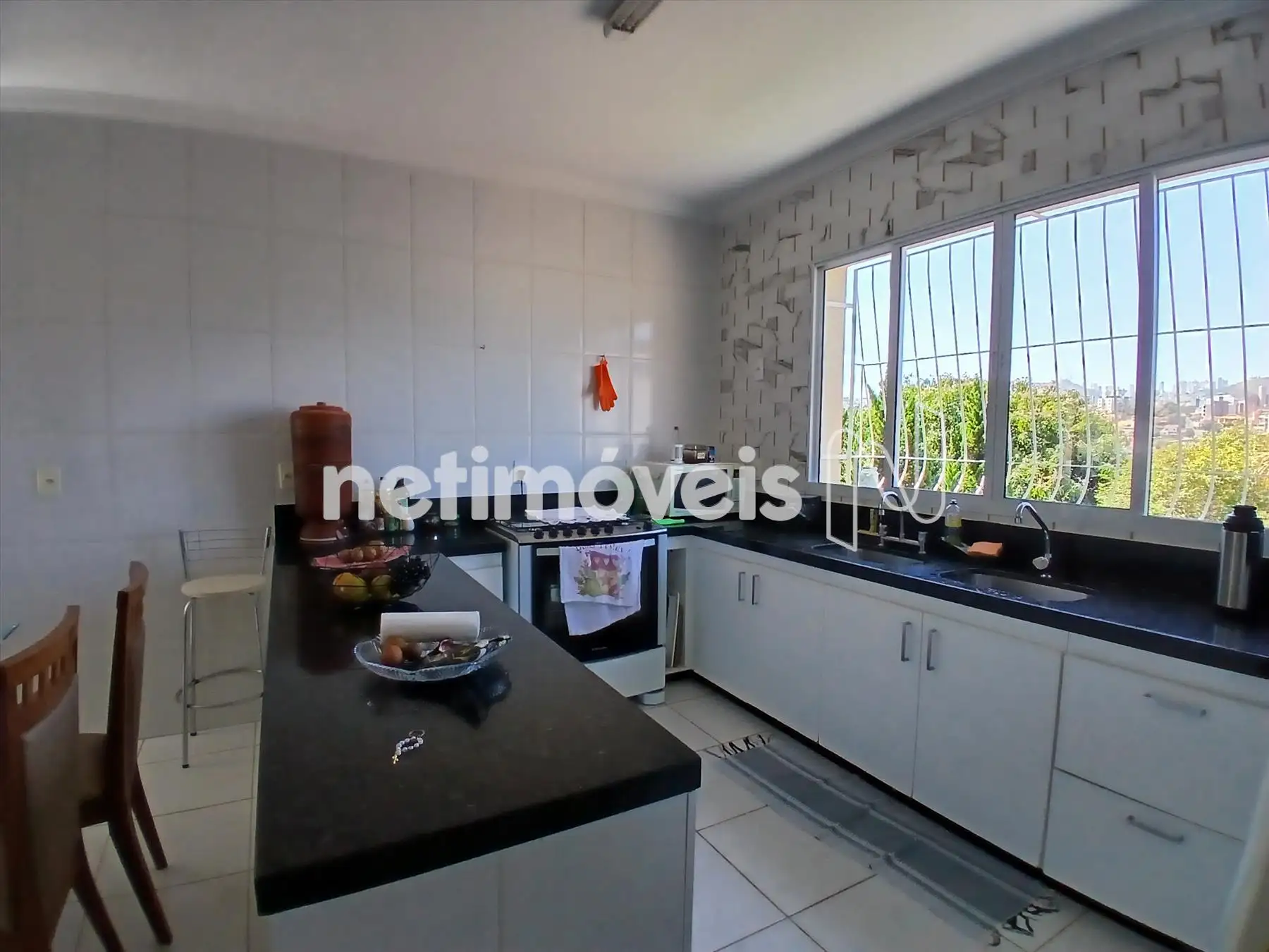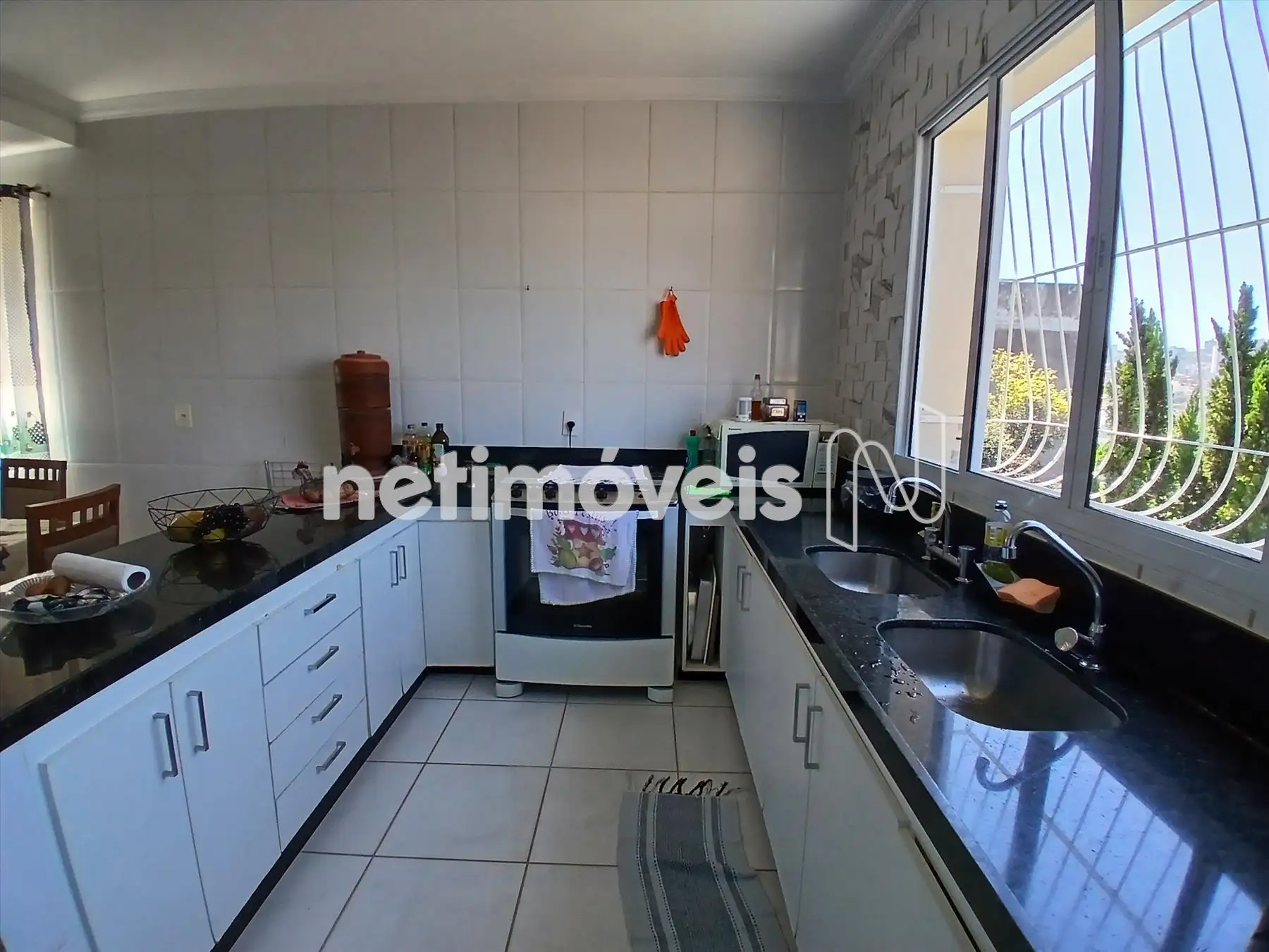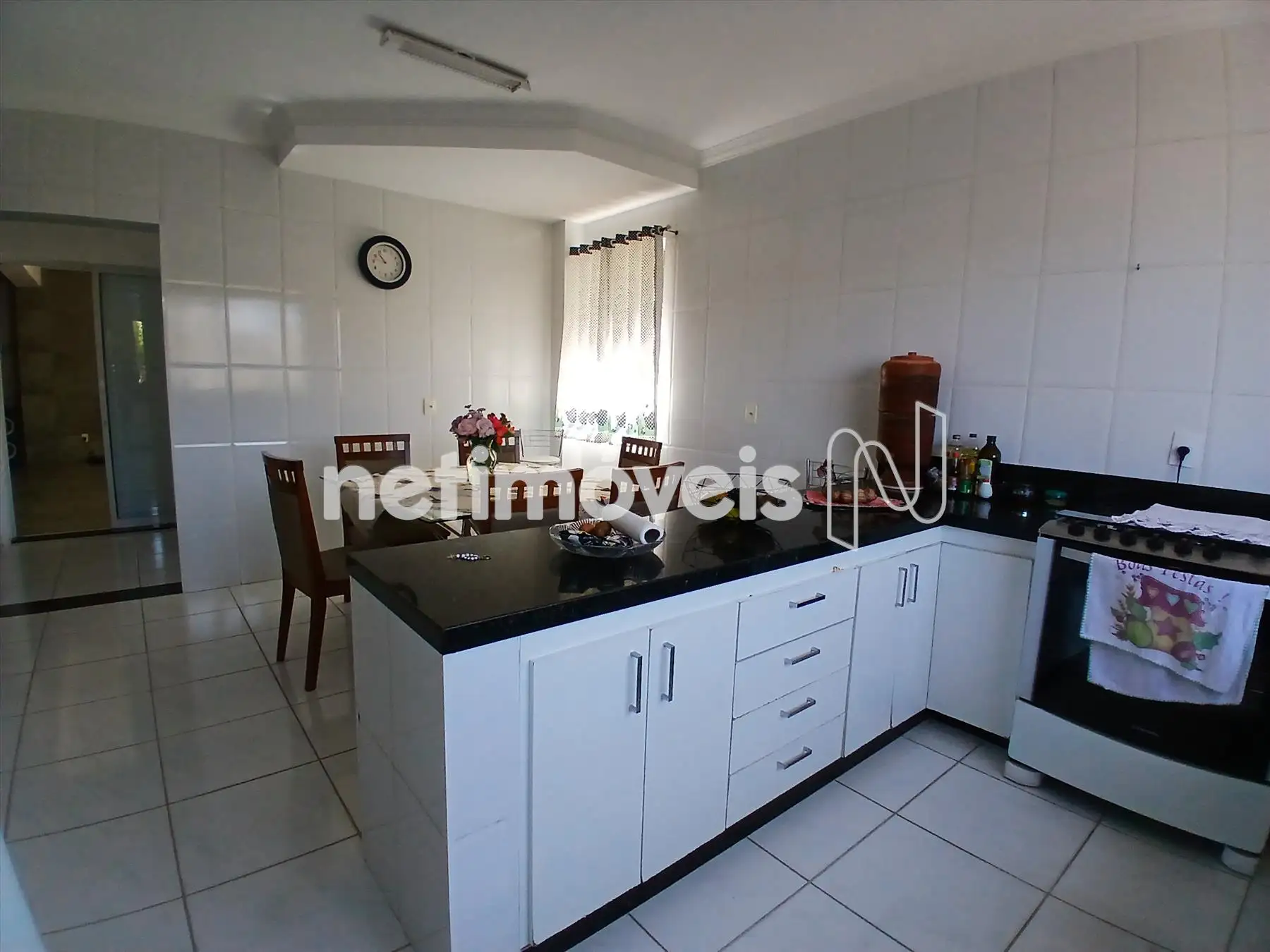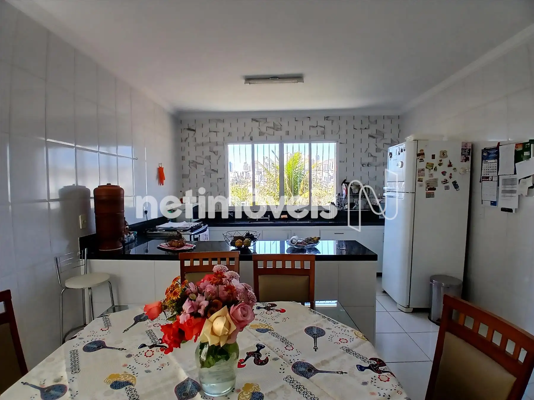 Cozinha integrada à sala de jantar, equipada com armários planejados e bancada em granito preto.