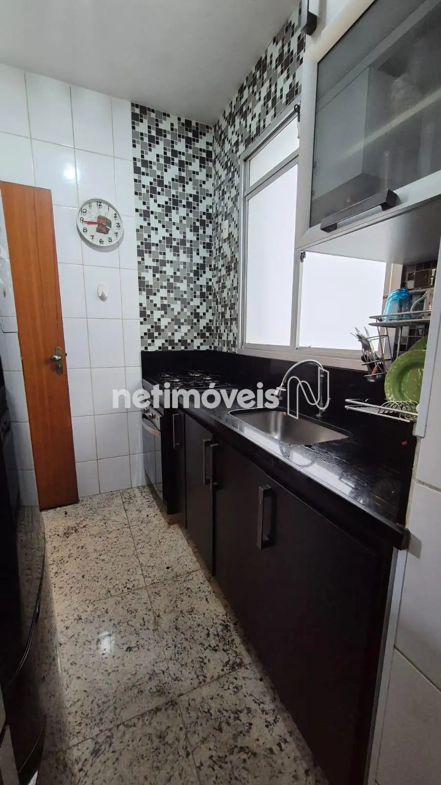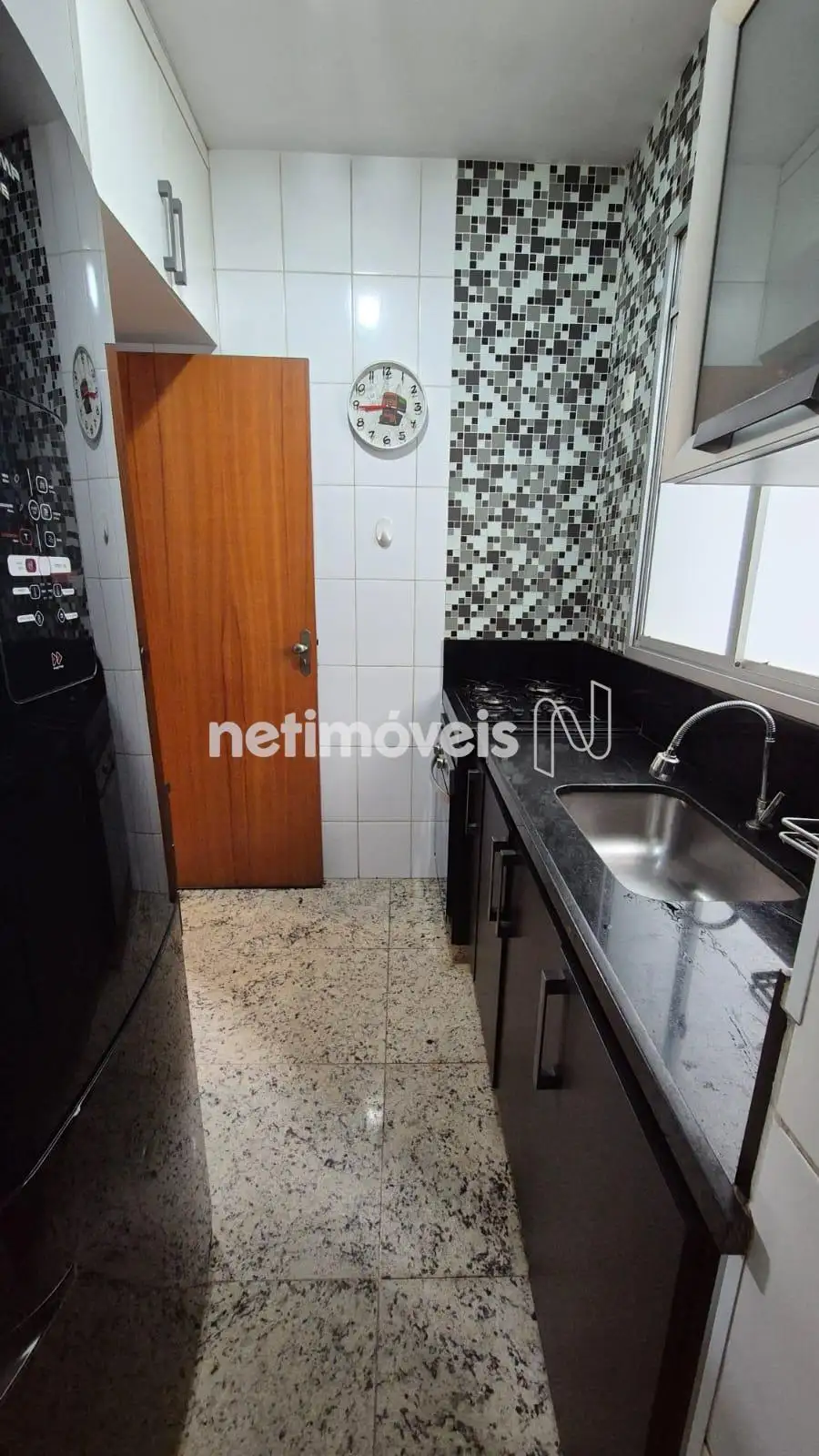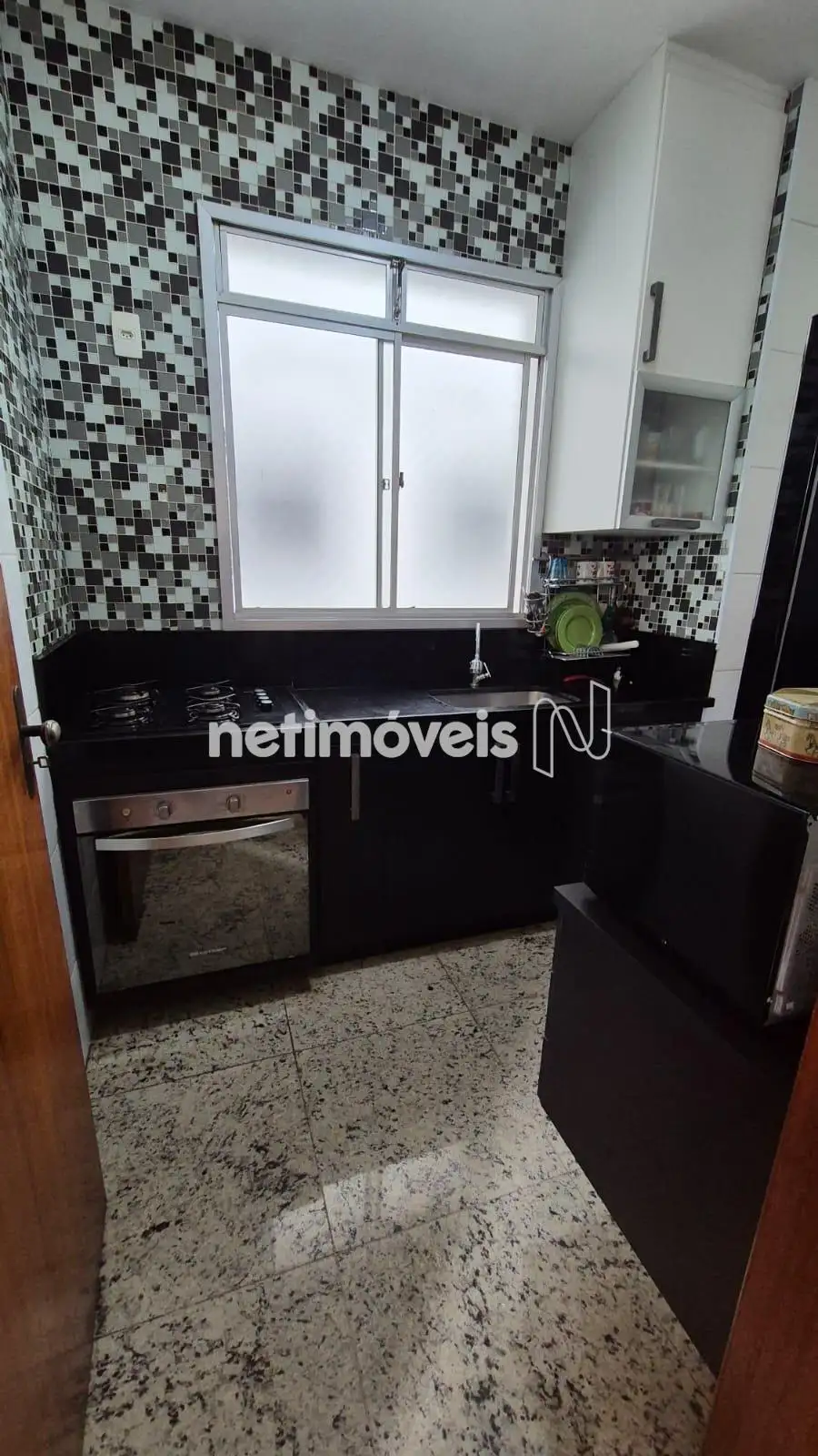 Cozinha com piso e bancada em granito com armários,
