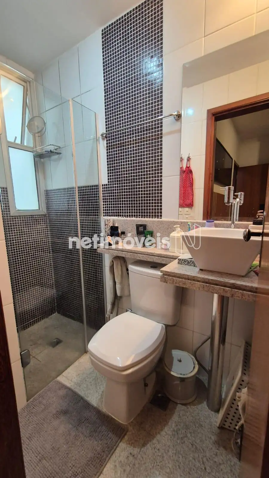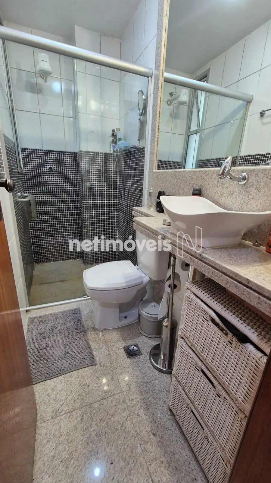 Banhos ( Social e Suite) piso e bancada em granito, armário, box em blindex,