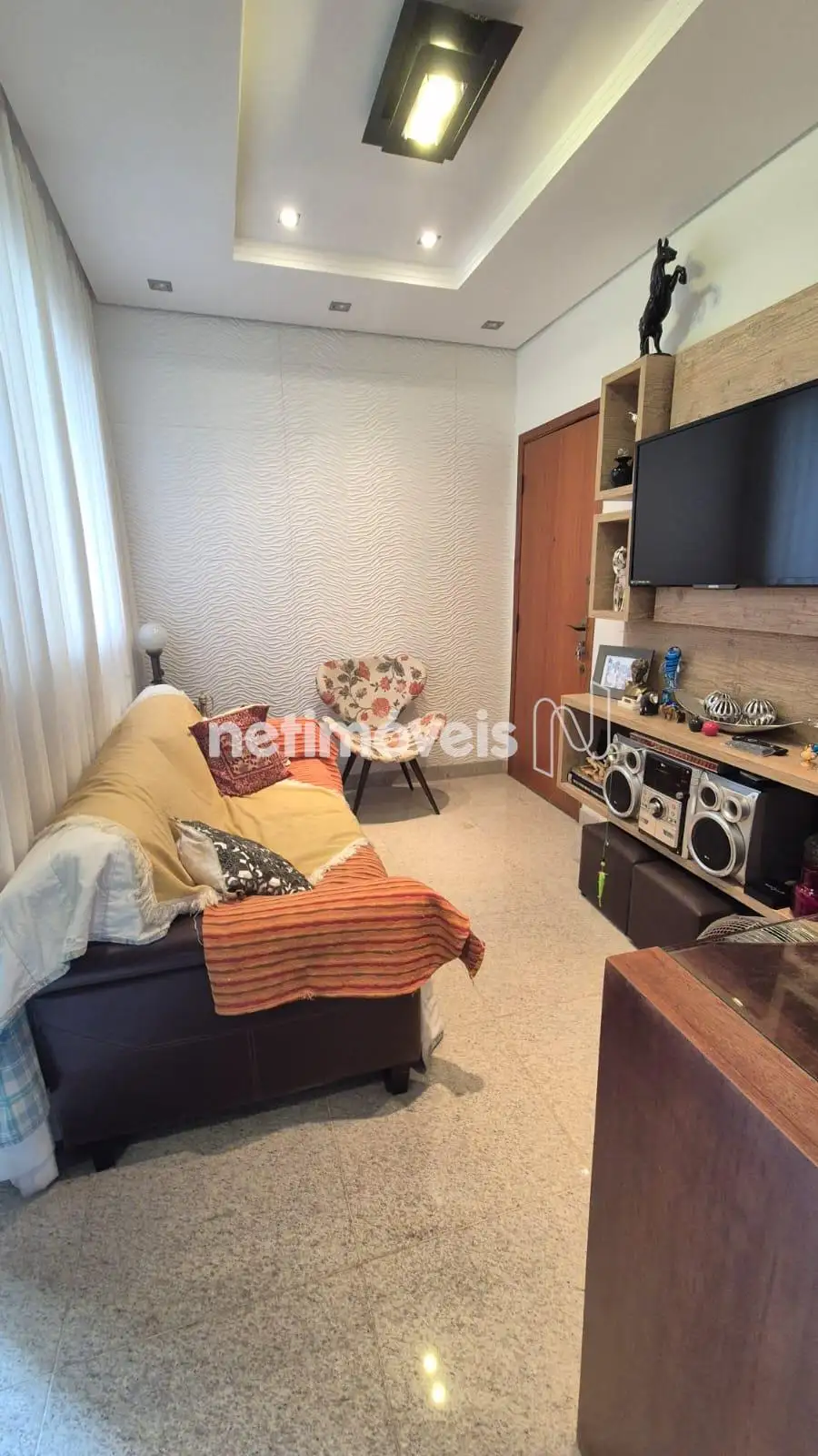 Sala 2 ambientes com piso em granito, painel em MDF, rebaixamento de teto em gesso com iluminação indireta,