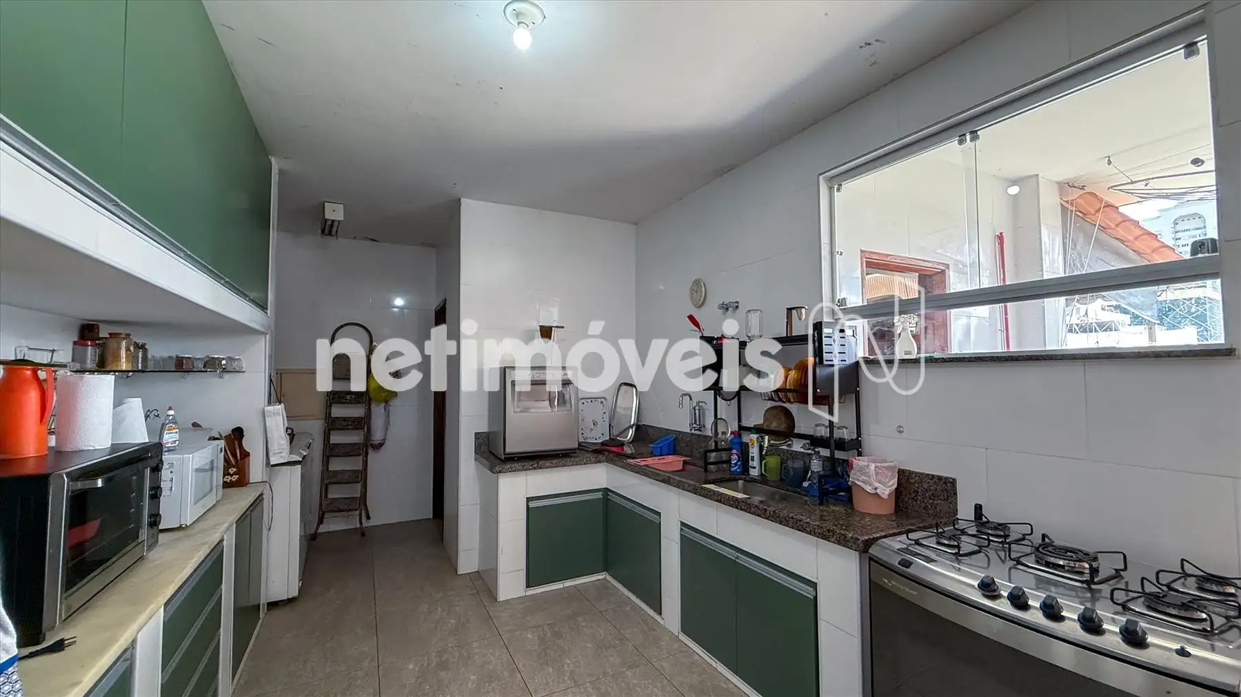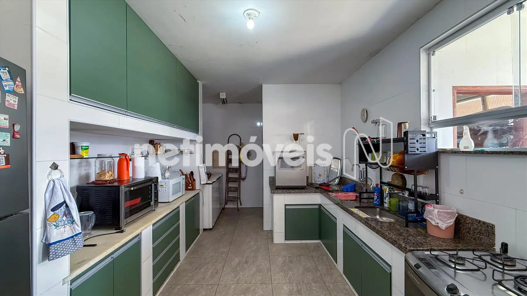 A cozinha é generosa, ideal para refeições, com armários e bancadas em granito, acompanhada por uma área de serviço ampla e despensa. O imóvel também dispõe de dependência completa de empregada (DCE).