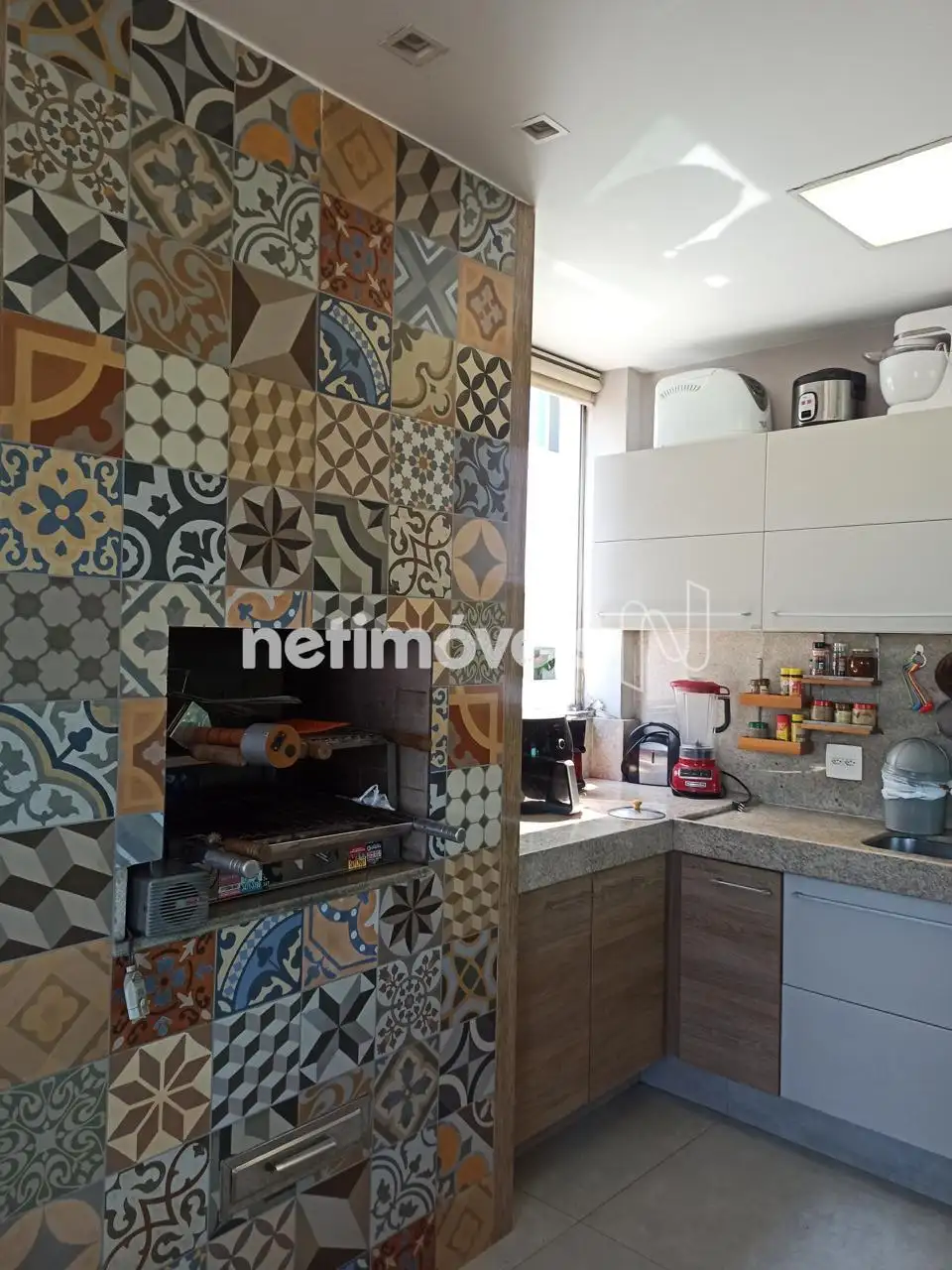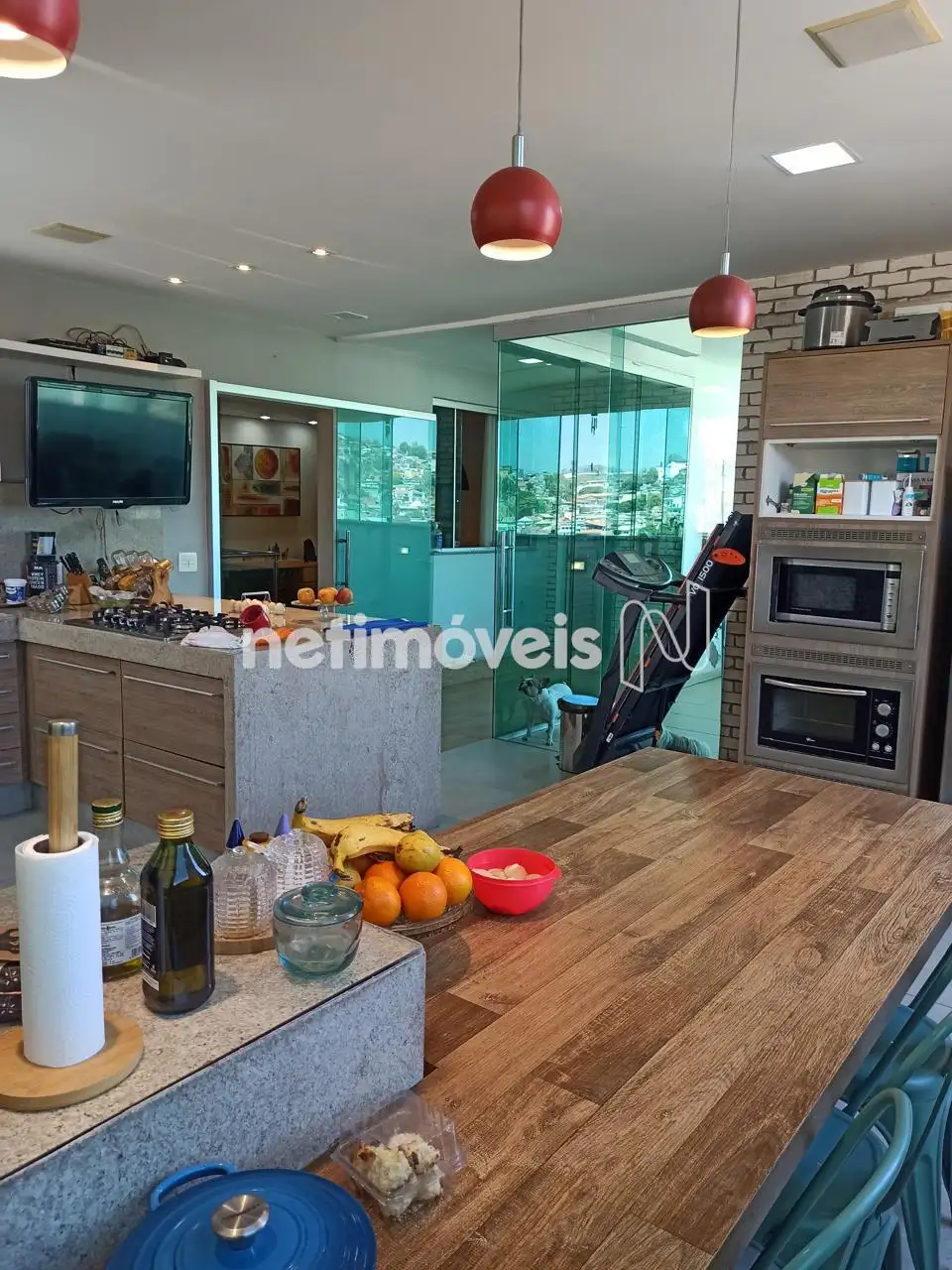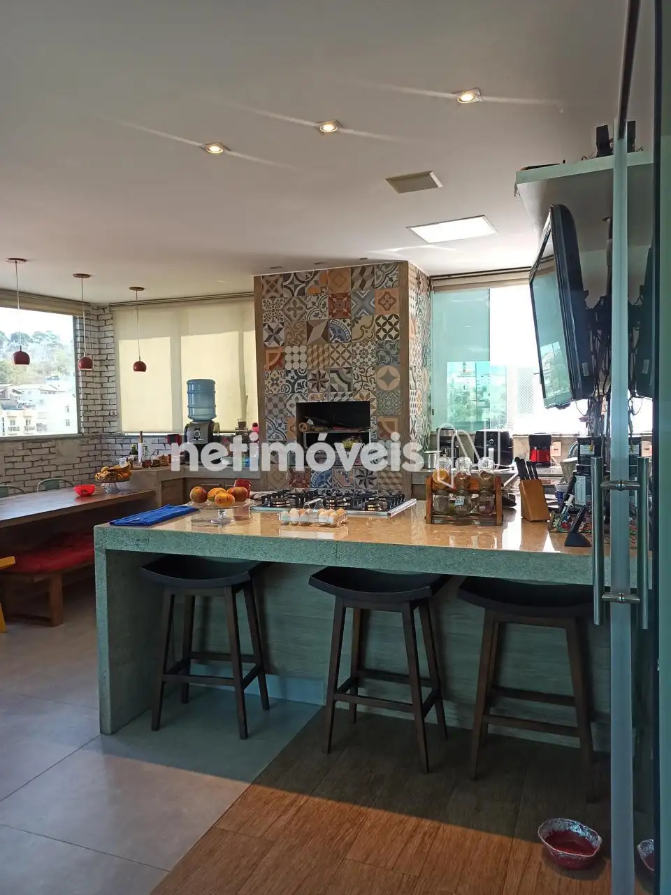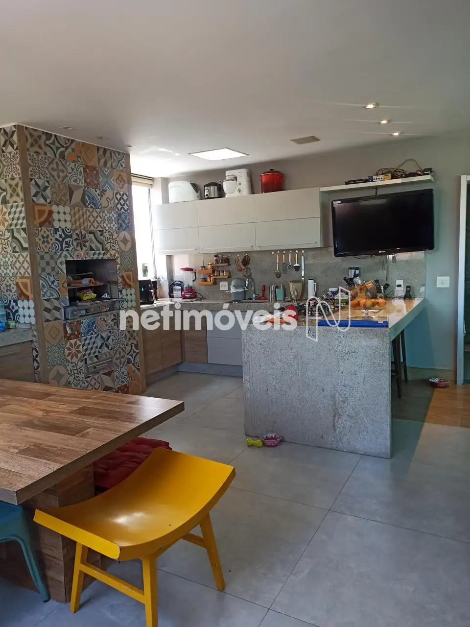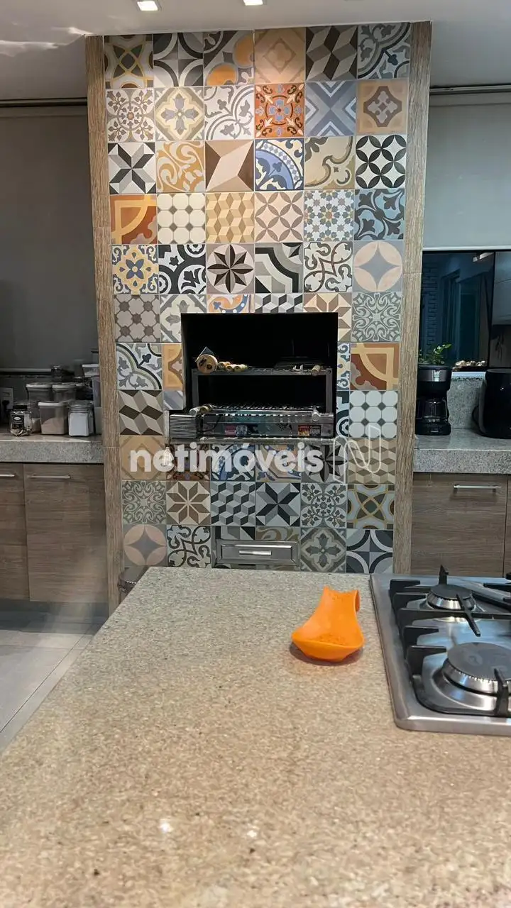 Cozinha planejada integrada à área gourmet, equipada com churrasqueira e fogão a lenha – o cenário perfeito para receber amigos e criar memórias especiais.