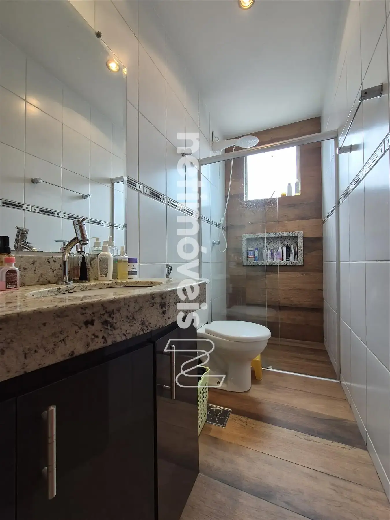 - Banheiros revestidos em cerâmica, com armários