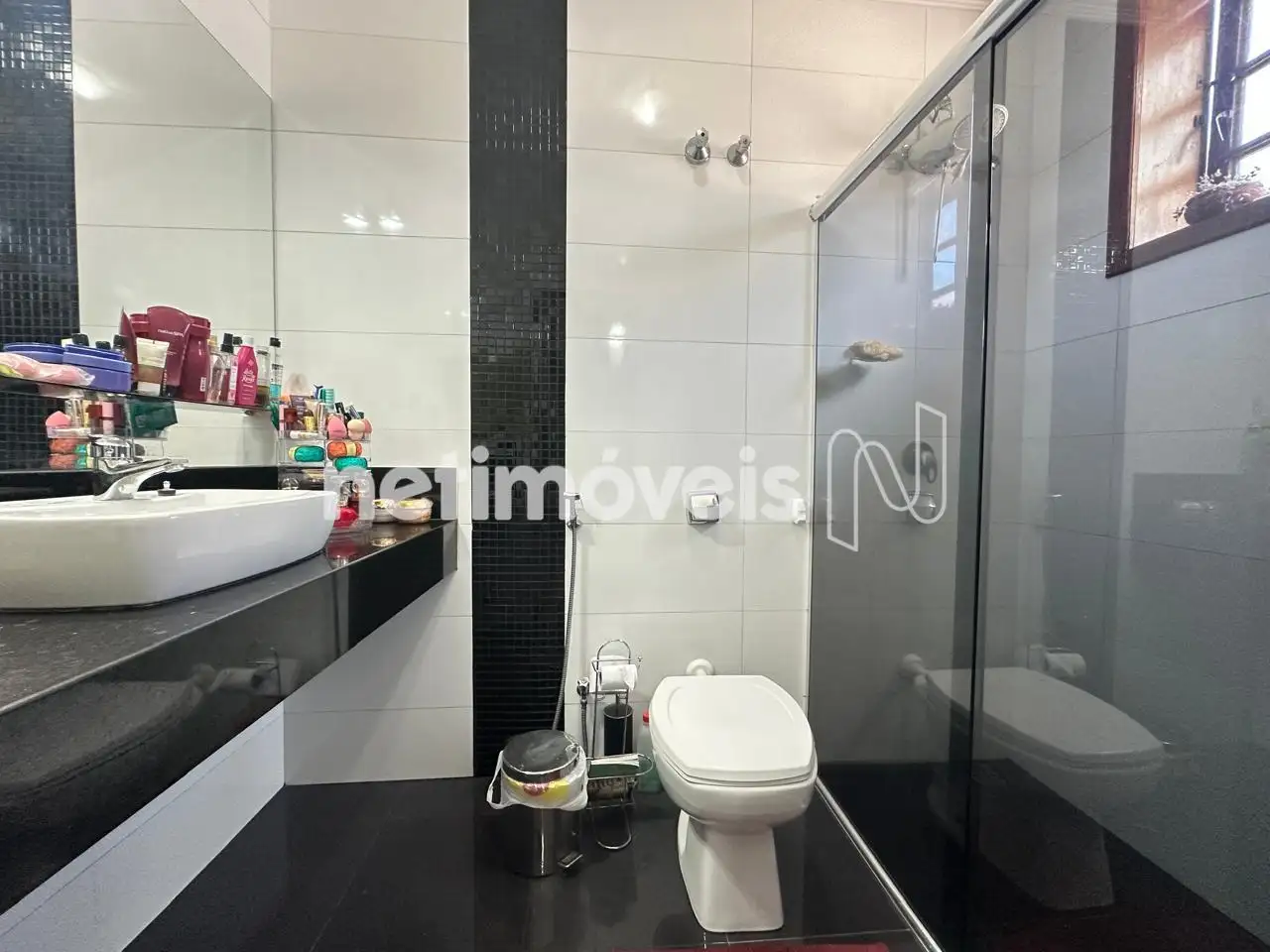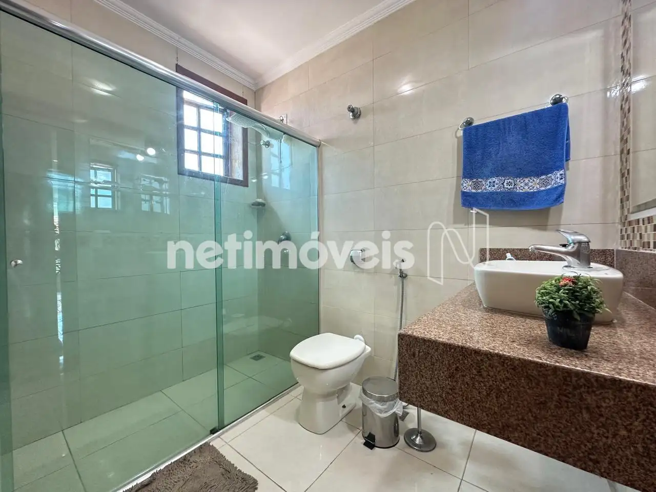 Banho social com box em blindex, bancada em granito;